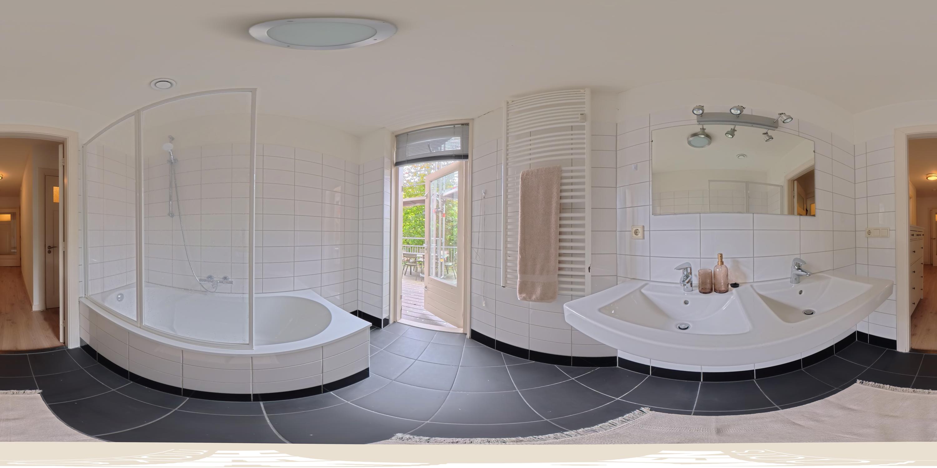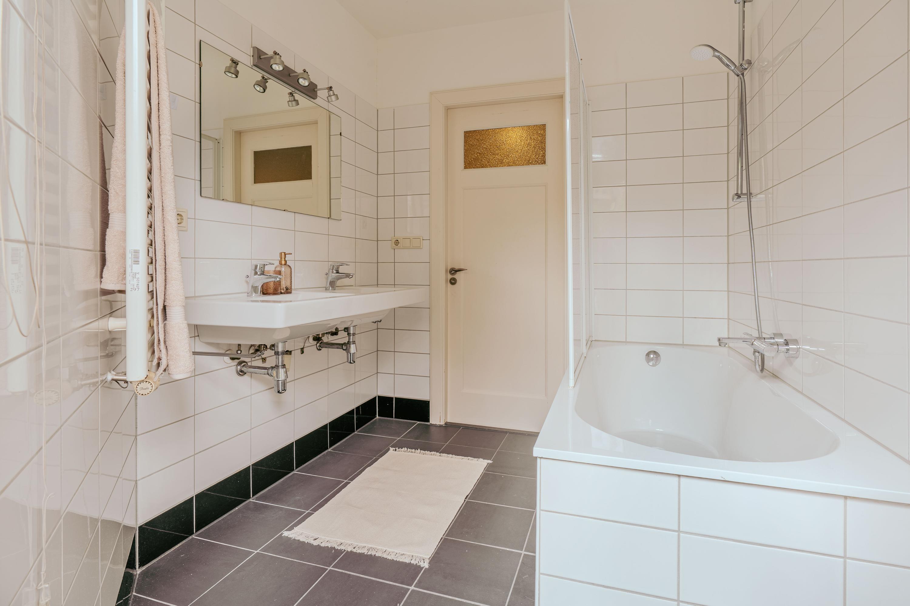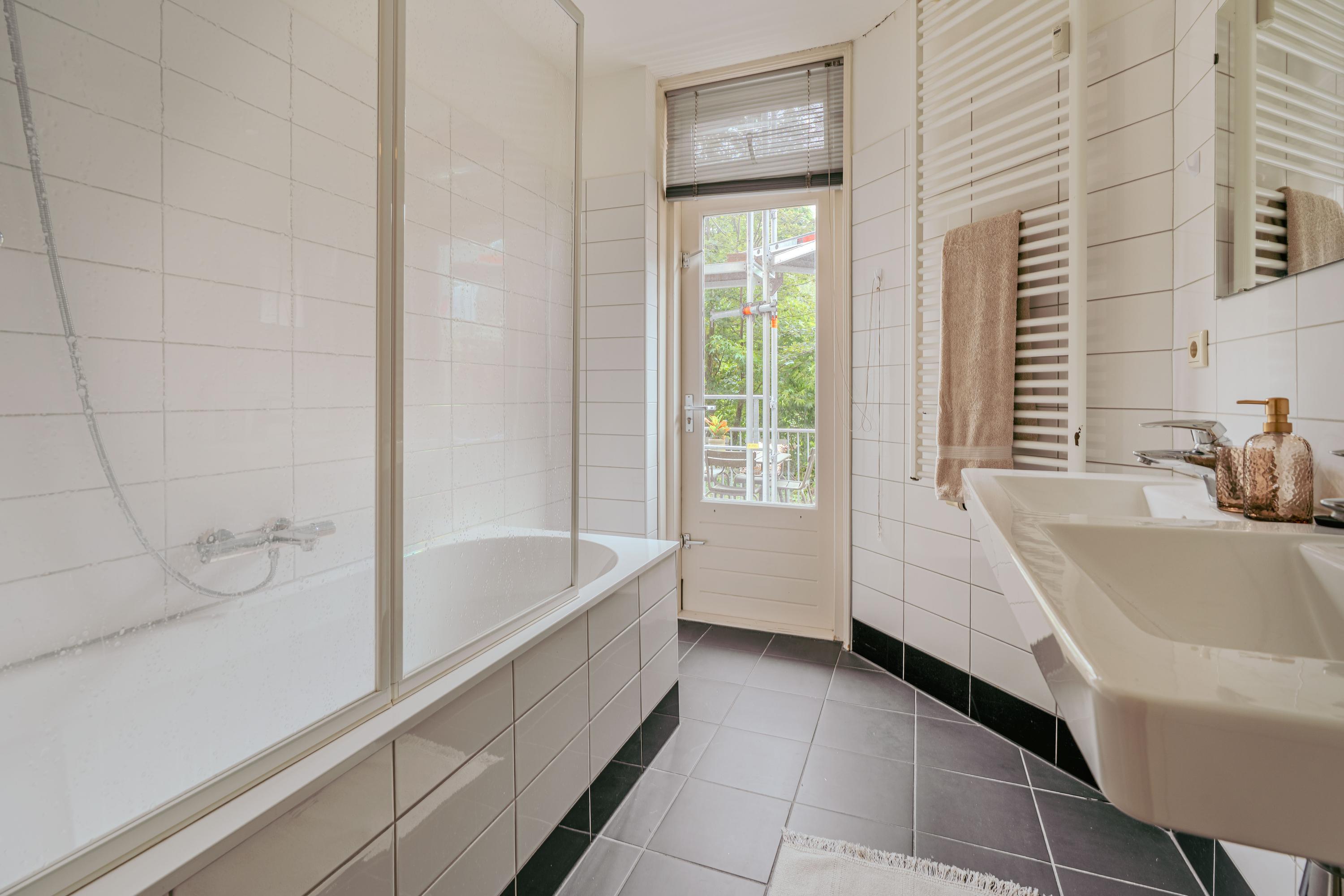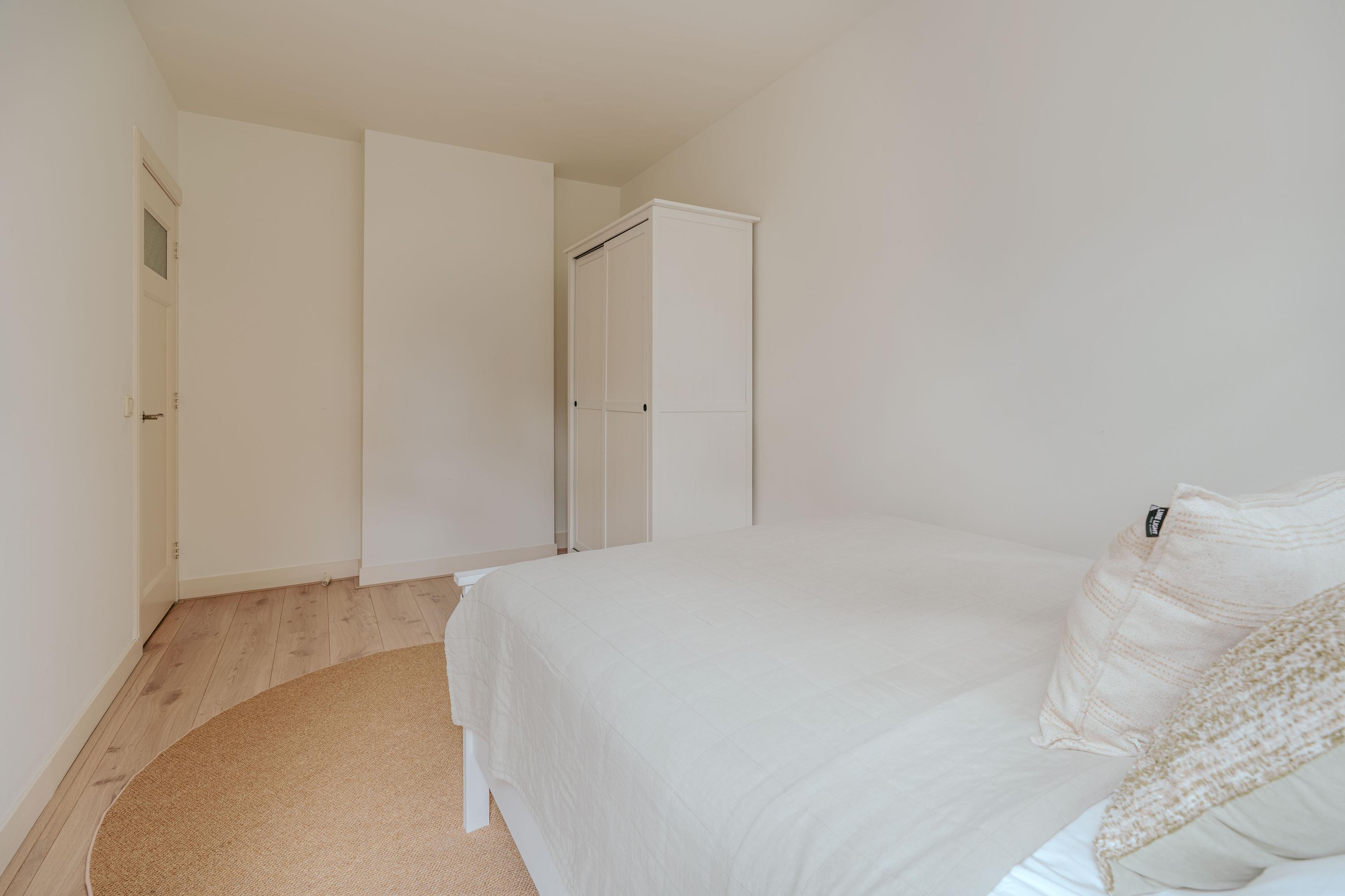 Aan de achterzijde liggen twee goed bemeten slaapkamers. De hoofdslaapkamer geeft toegang tot het royale terras van ca. 19m², gelegen op het zuiden. Hier kunt u heerlijk genieten van de zon tot in de avonduren. Centraal in de woning bevindt zich de badkamer, uitgerust met een ligbad met douche en een dubbele wastafel. Het toilet is separaat en bereikbaar vanuit de hal. Tevens beschikt de woning over twee praktische bergkasten, waarvan één met aansluiting voor een wasmachine.