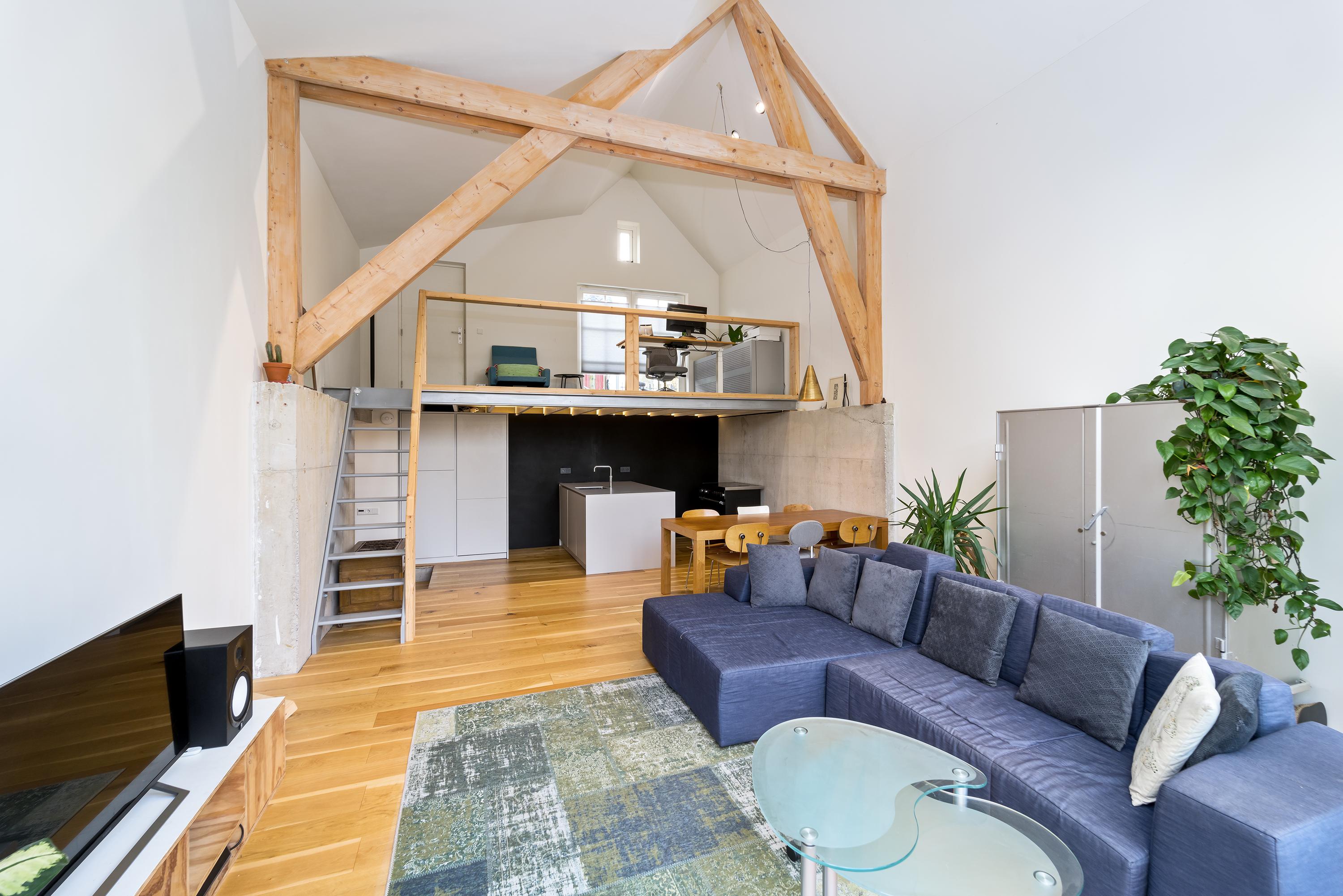Inside, the home is just as cool. Old and modern materials were used in the new construction/renovation. Tough wooden construction beams, raw concrete, oak floorboards, classic member radiators and the steel spiral staircase are some examples.
