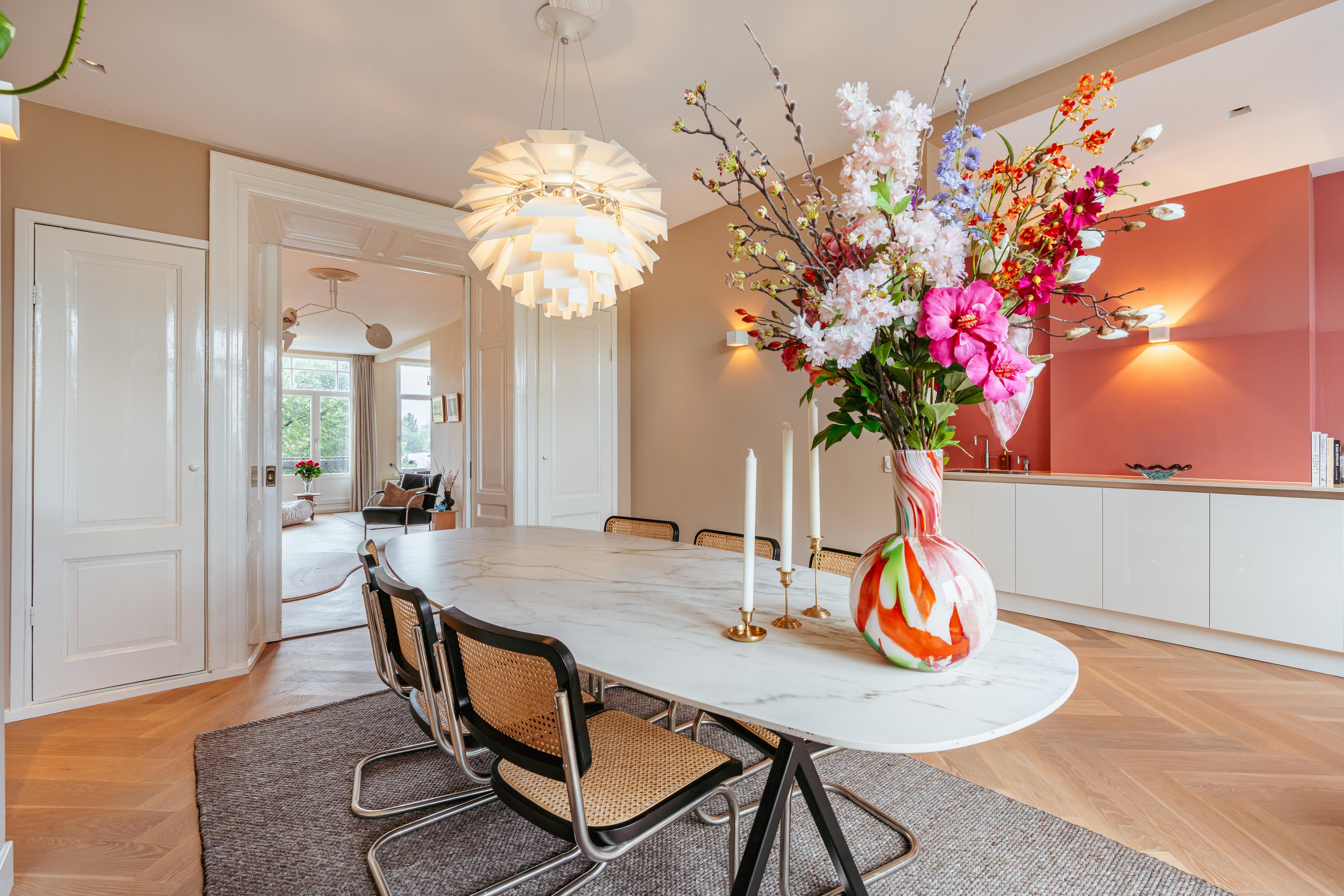 The third floor is the heart of the home and features an exceptionally bright living space with unobstructed views of Artis and the surrounding greenery. A truly unique experience: you can regularly hear the sounds of sea lions, monkeys, and even wolves in the evening, adding a remarkable atmosphere to city living.