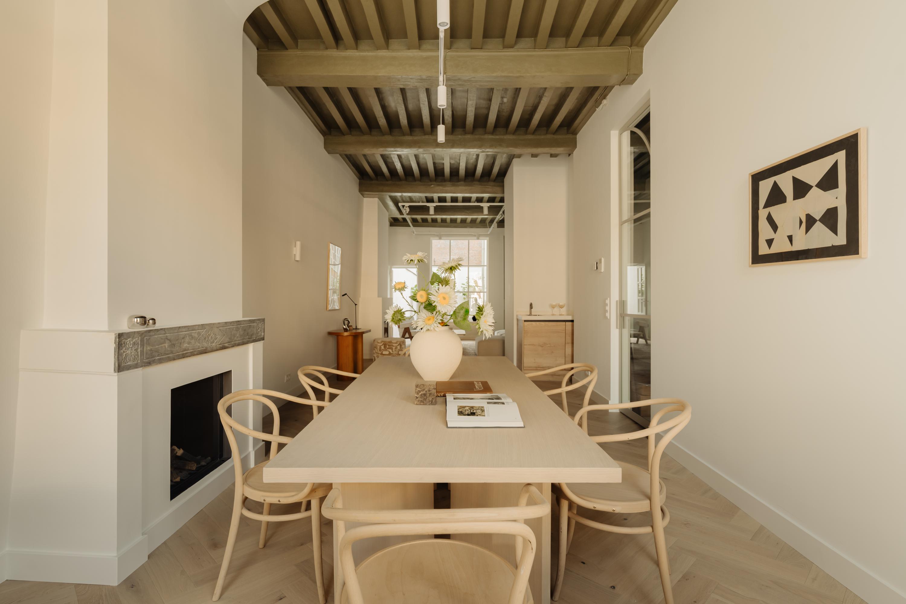 From the hall, you enter the living area. With a ceiling height of over 3.4 metres, original exposed beams, large windows and a beautiful view over the Singel, this is an impressive space where warmth and grandeur meet naturally. Two fireplaces on this floor add an extra sense of homeliness and refinement.
