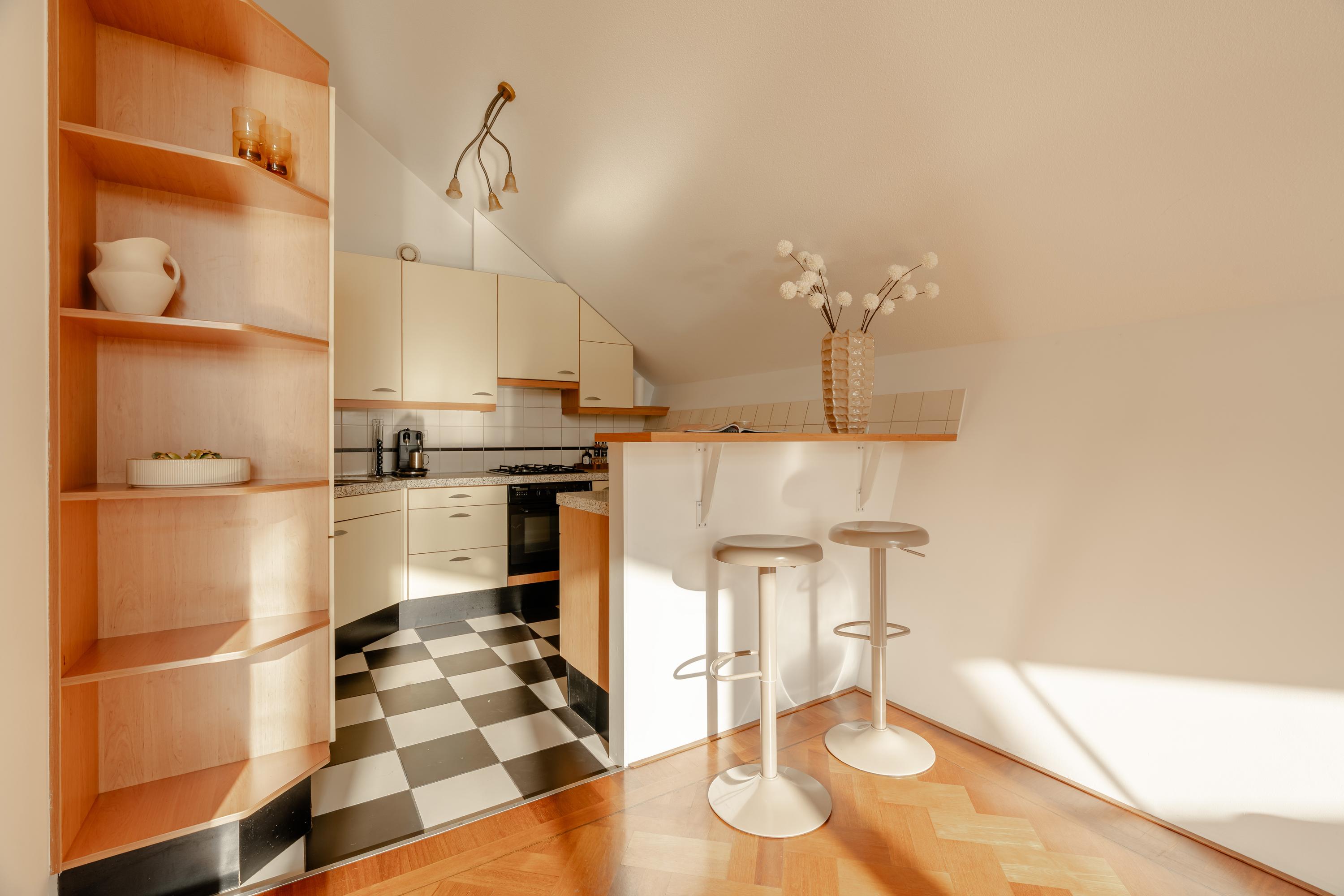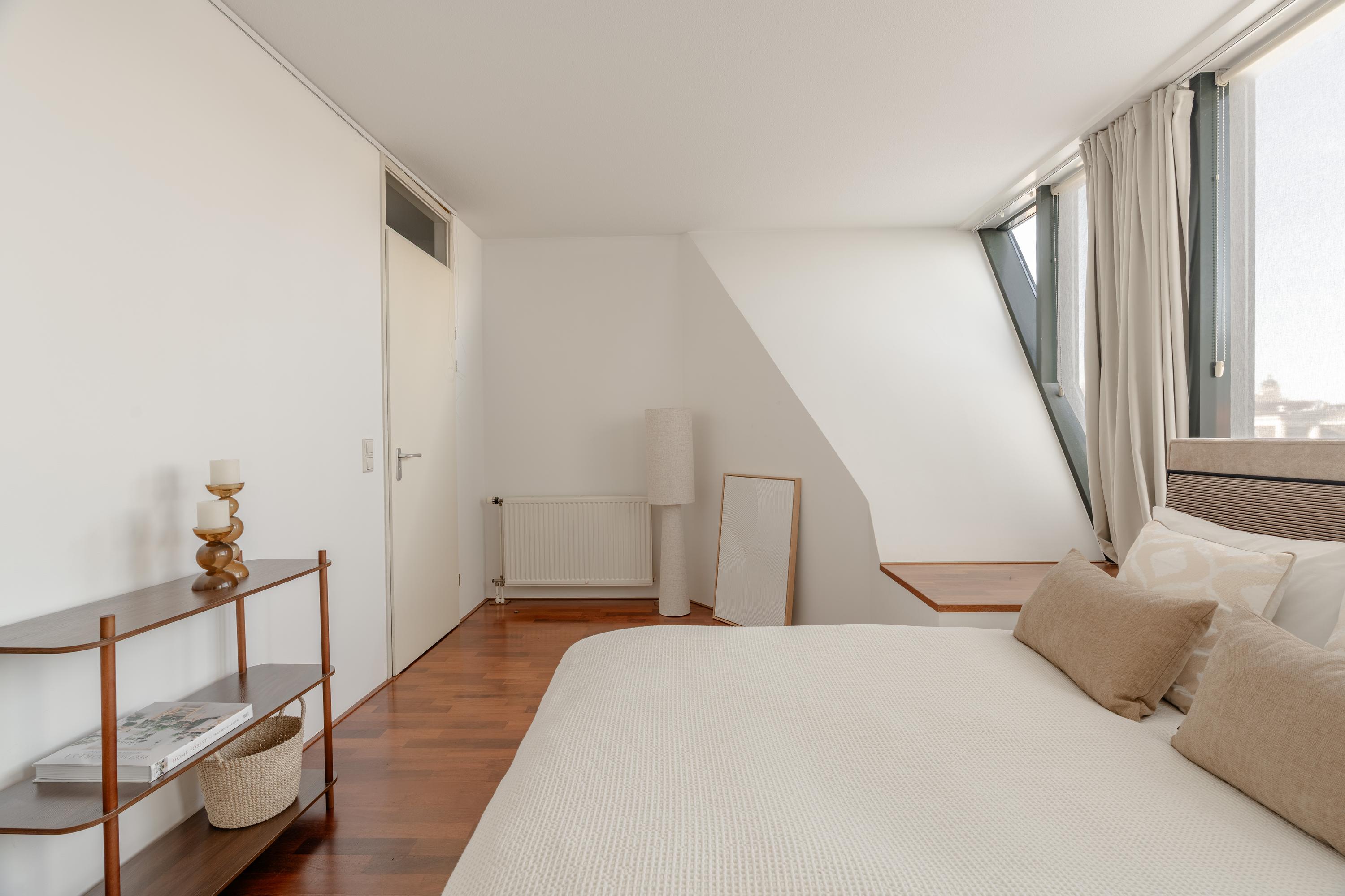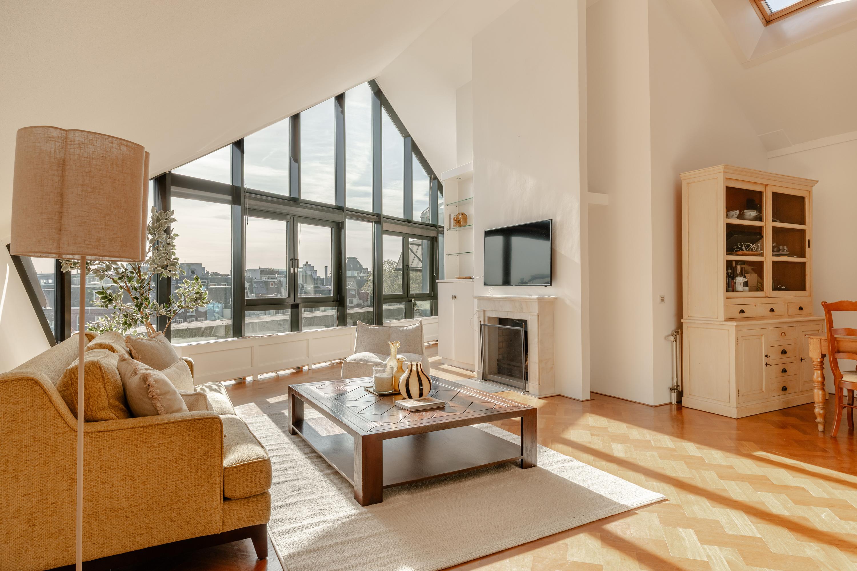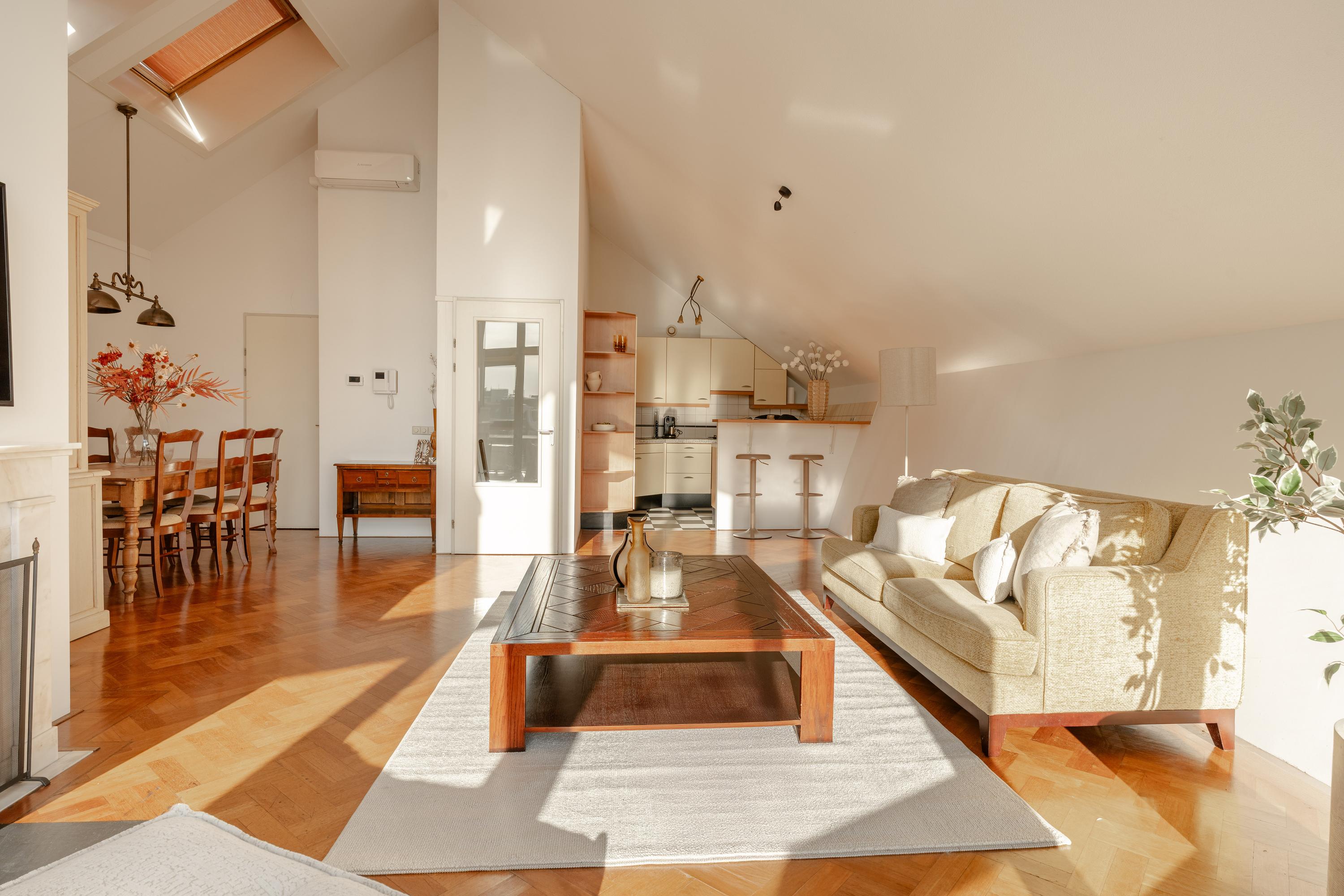 The apartment’s living level occupies the top floor, where large windows and generous ceiling heights invite daylight to animate the interiors. The living room opens to far-reaching views across the Singel and the city’s celebrated Flower Market, setting an atmosphere of refined urban calm. A half-open kitchen, complete with built-in appliances and an adjacent storage area, seamlessly connects to the dining space, ideal for gathering and entertaining.