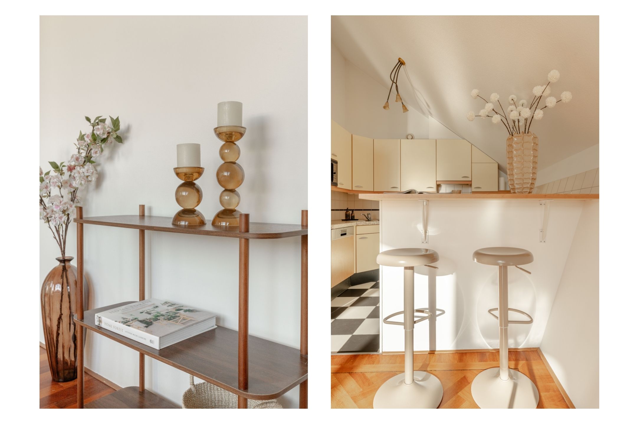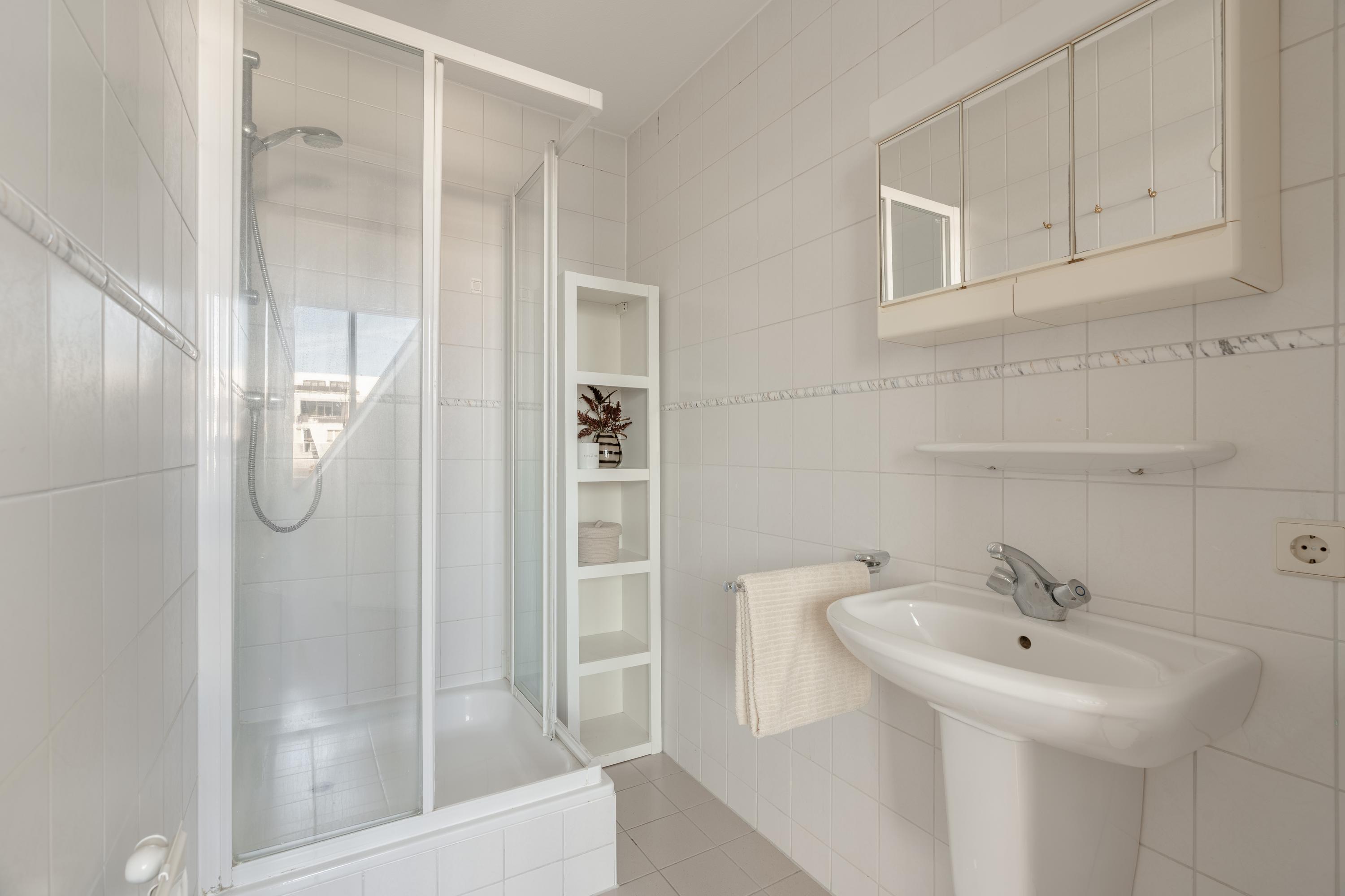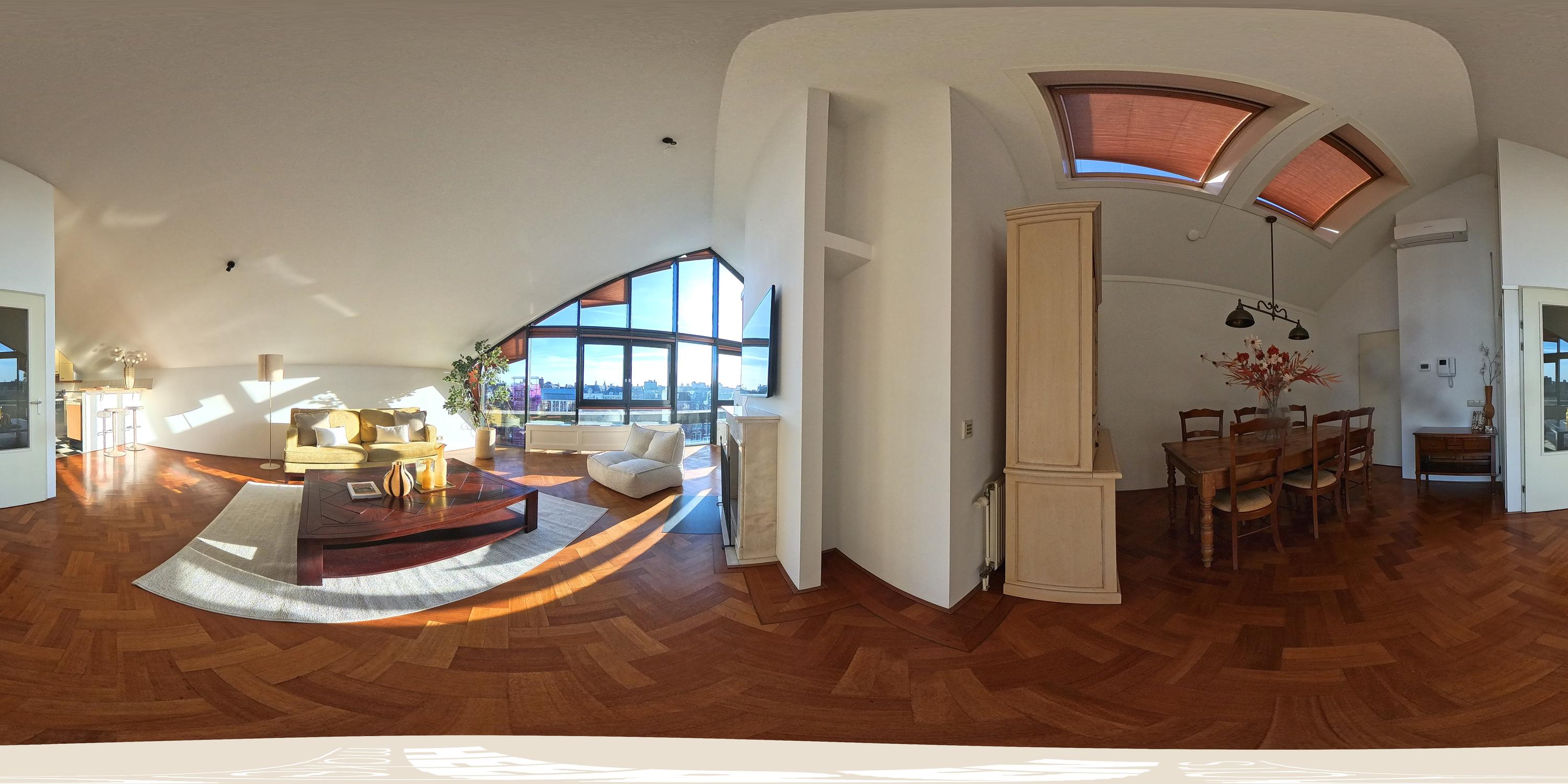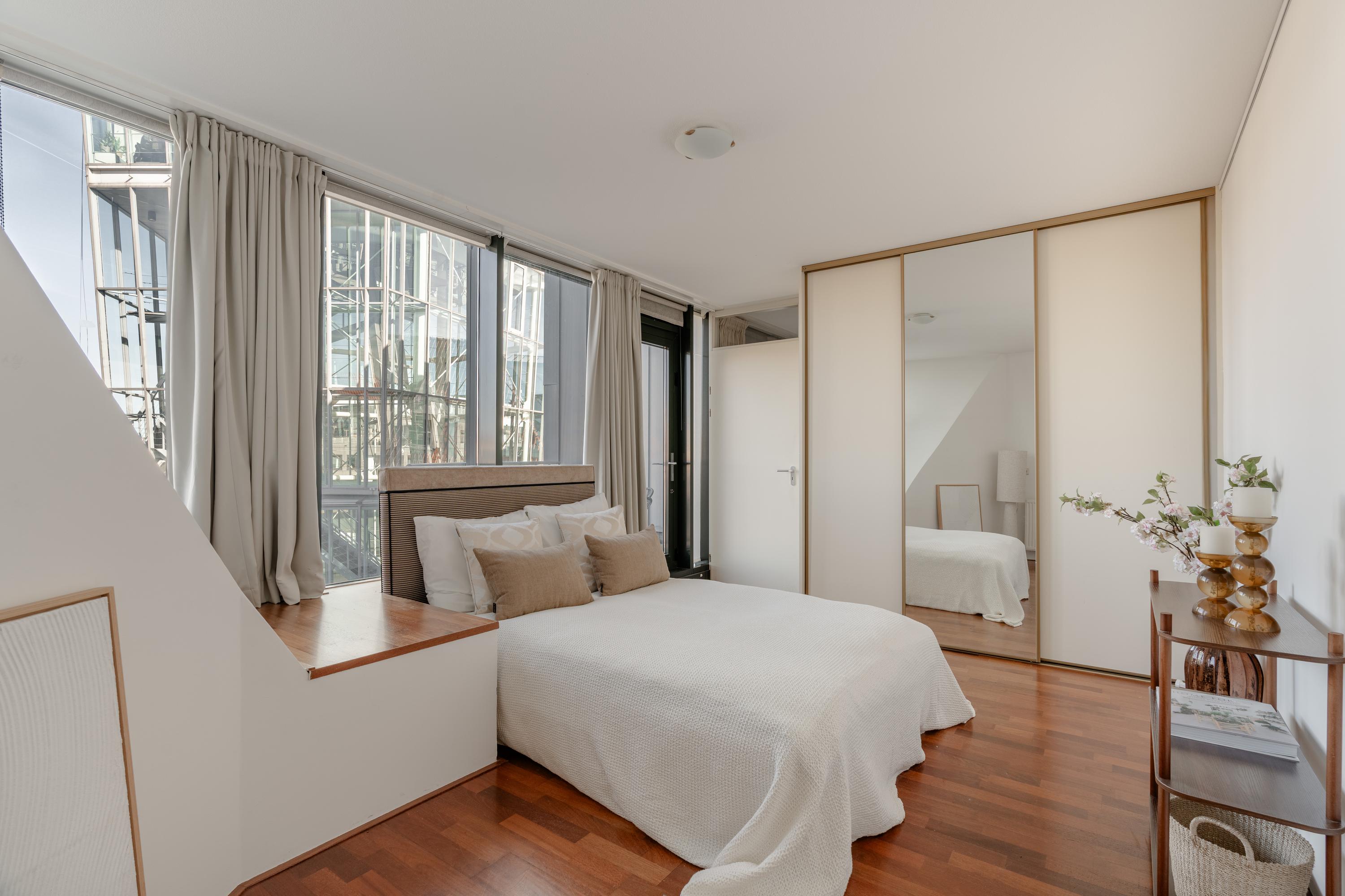 The apartment’s living level occupies the top floor, where large windows and generous ceiling heights invite daylight to animate the interiors. The living room opens to far-reaching views across the Singel and the city’s celebrated Flower Market, setting an atmosphere of refined urban calm. A half-open kitchen, complete with built-in appliances and an adjacent storage area, seamlessly connects to the dining space, ideal for gathering and entertaining.