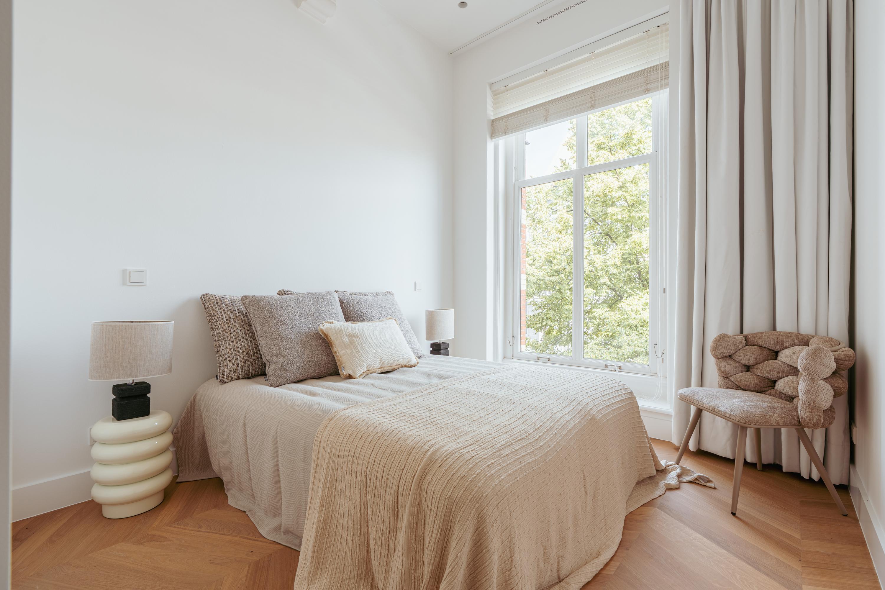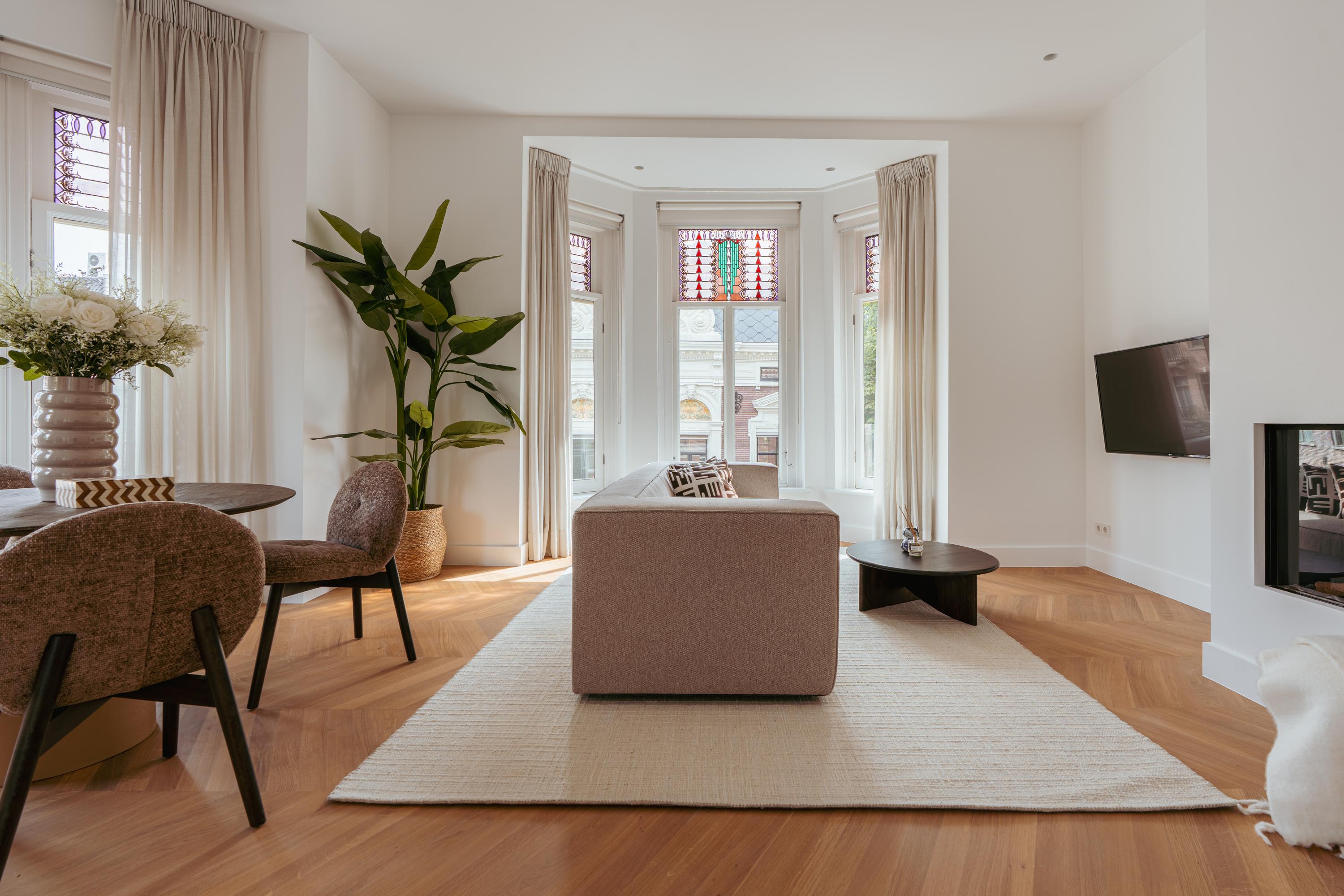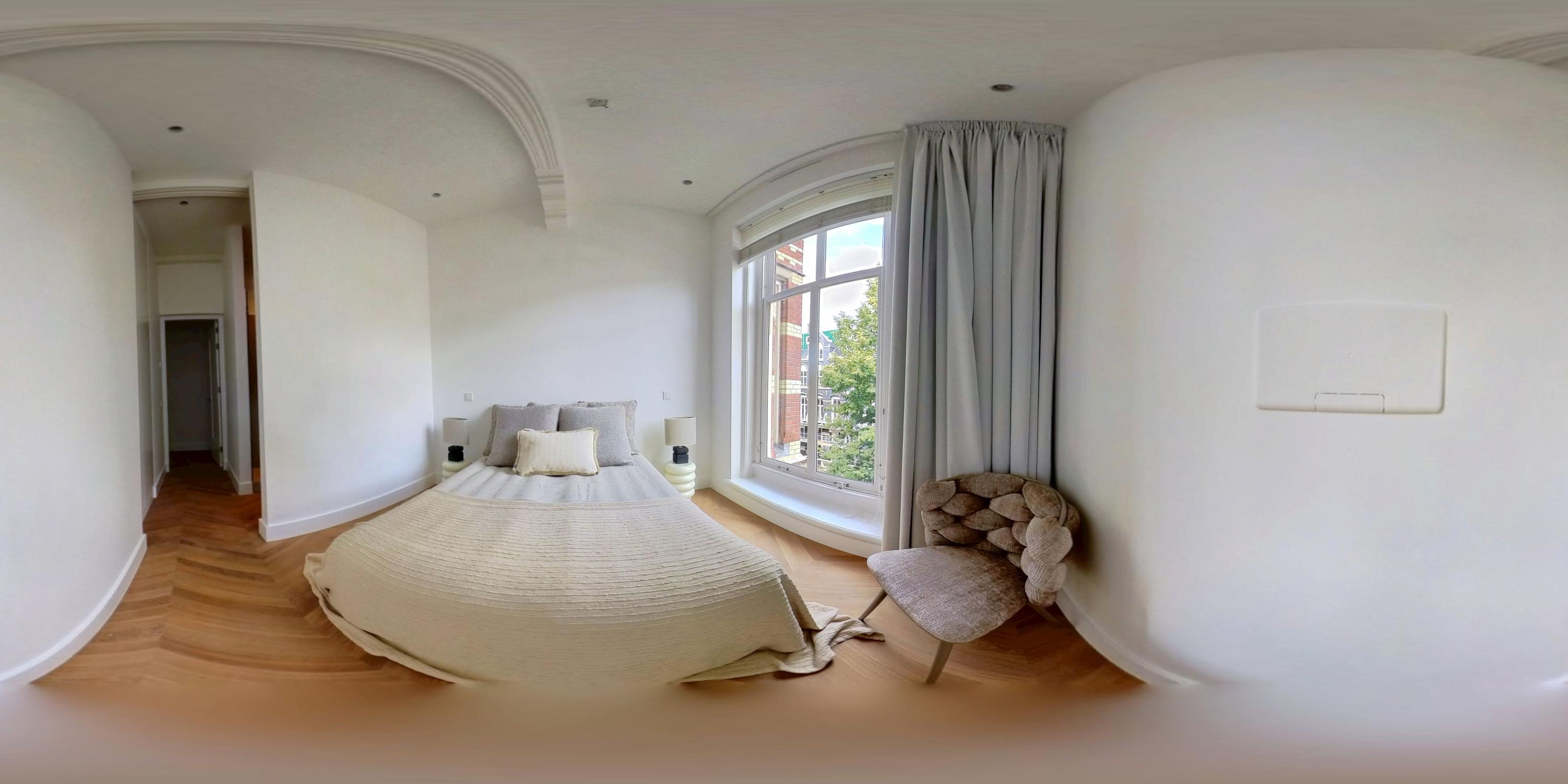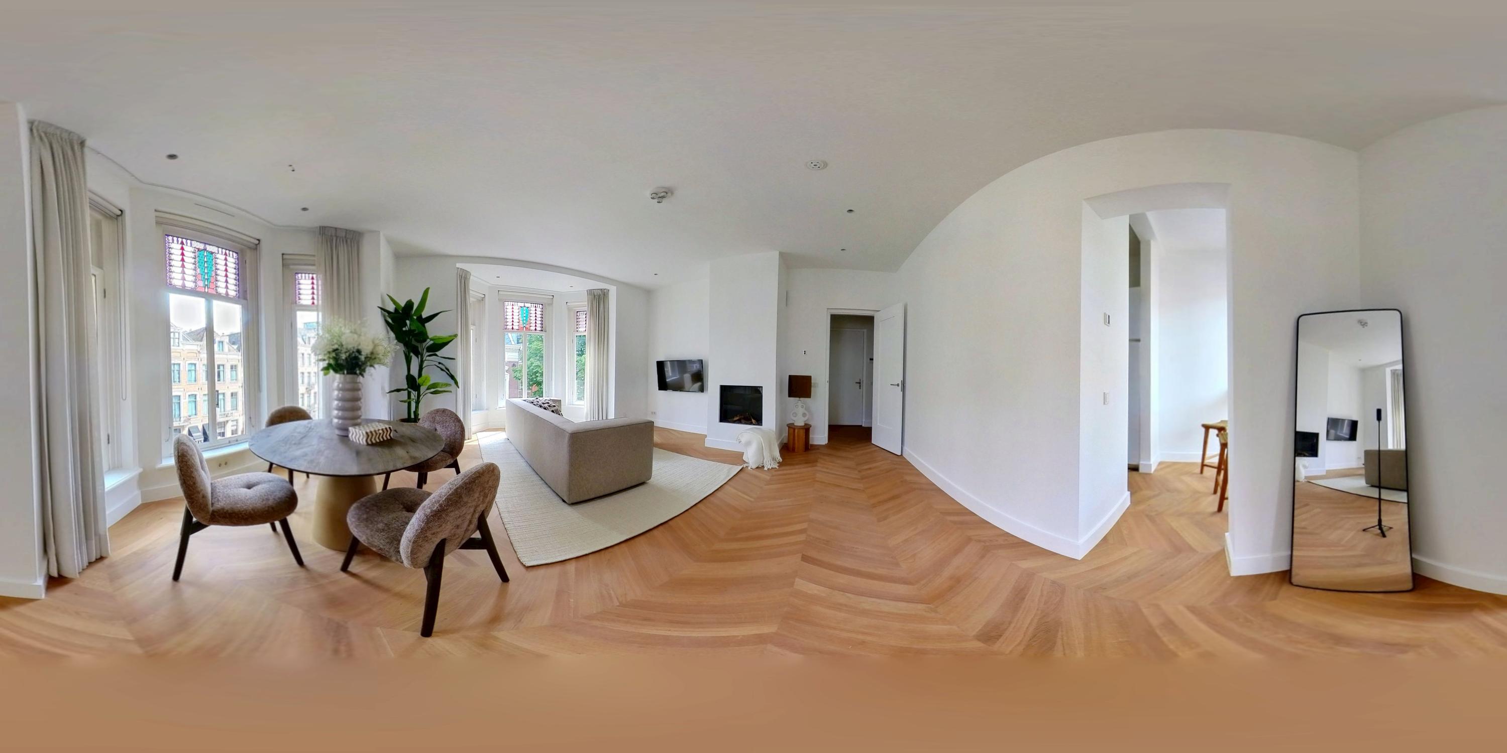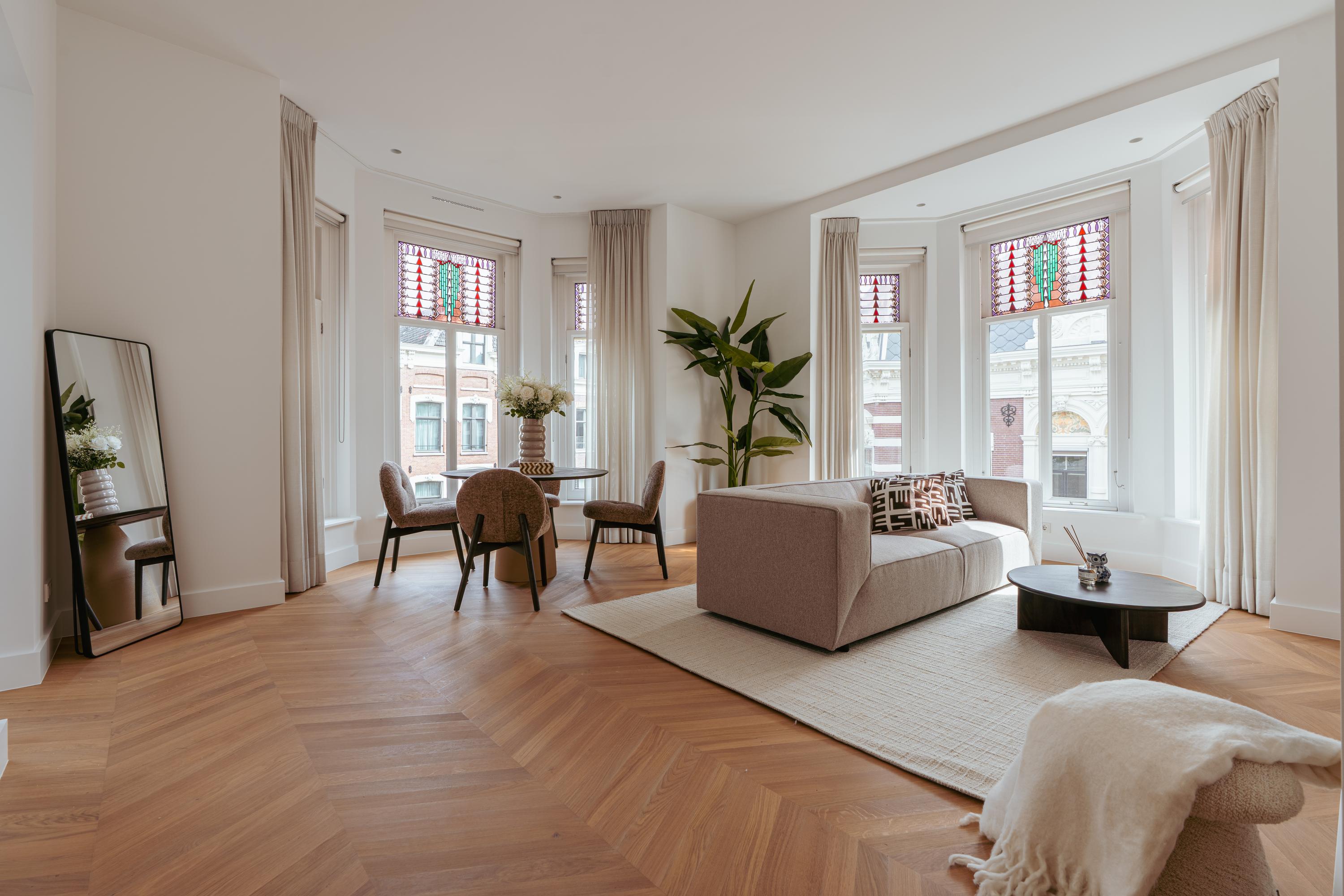 Apartment Amsterdam Vondelpark neighbourhood, measuring approximately 85 m², is set within a monumental building, offering a sense of quiet distinction in one of the city’s most beloved neighbourhoods. This second-floor residence has been fully renovated, with details such as over three-metre-high ceilings, elegant bay windows, and a wood-burning fireplace that anchor the main living space in calm, natural light. The layout is intuitive—a spacious hall connects all rooms. Two generously sized bedrooms each have private en-suite bathrooms with walk-in showers and thoughtful built-in wardrobes. The semi-open kitchen, equipped with luxury integrated appliances and a bar counter, invites both casual mornings and evenings shared with friends. Mechanical ventilation, underfloor heating, and lift access further elevate day-to-day comfort. Freehold tenure affords peace of mind.