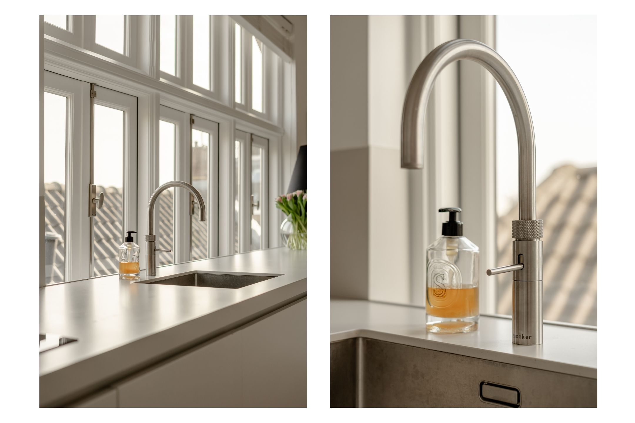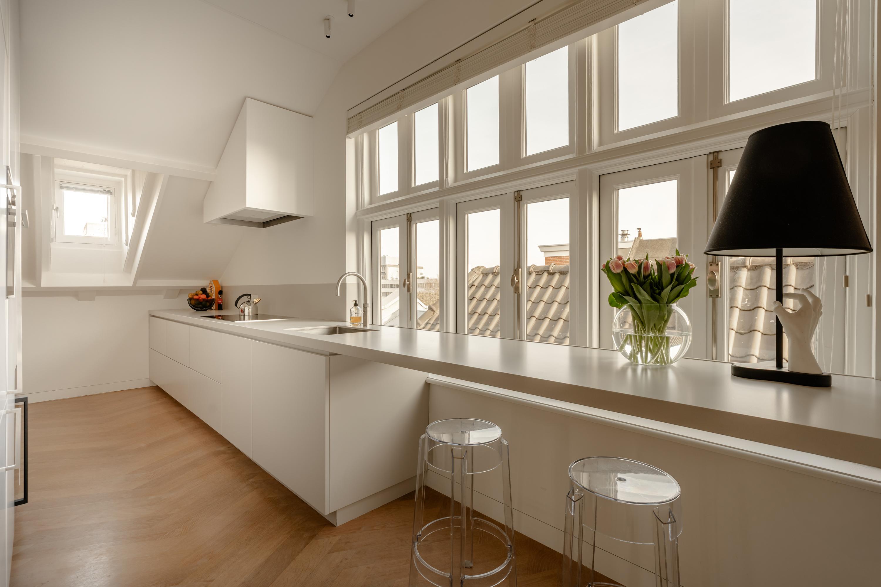 Thanks to the large windows, the space is filled with natural light and offers beautiful views over the characteristic rooftops of Oud-West, creating an open and serene living experience. The kitchen is equipped with high-end Siemens built-in appliances, an induction hob, Quooker tap, and a wine climate cabinet. Integrated air conditioning completes the comfort.