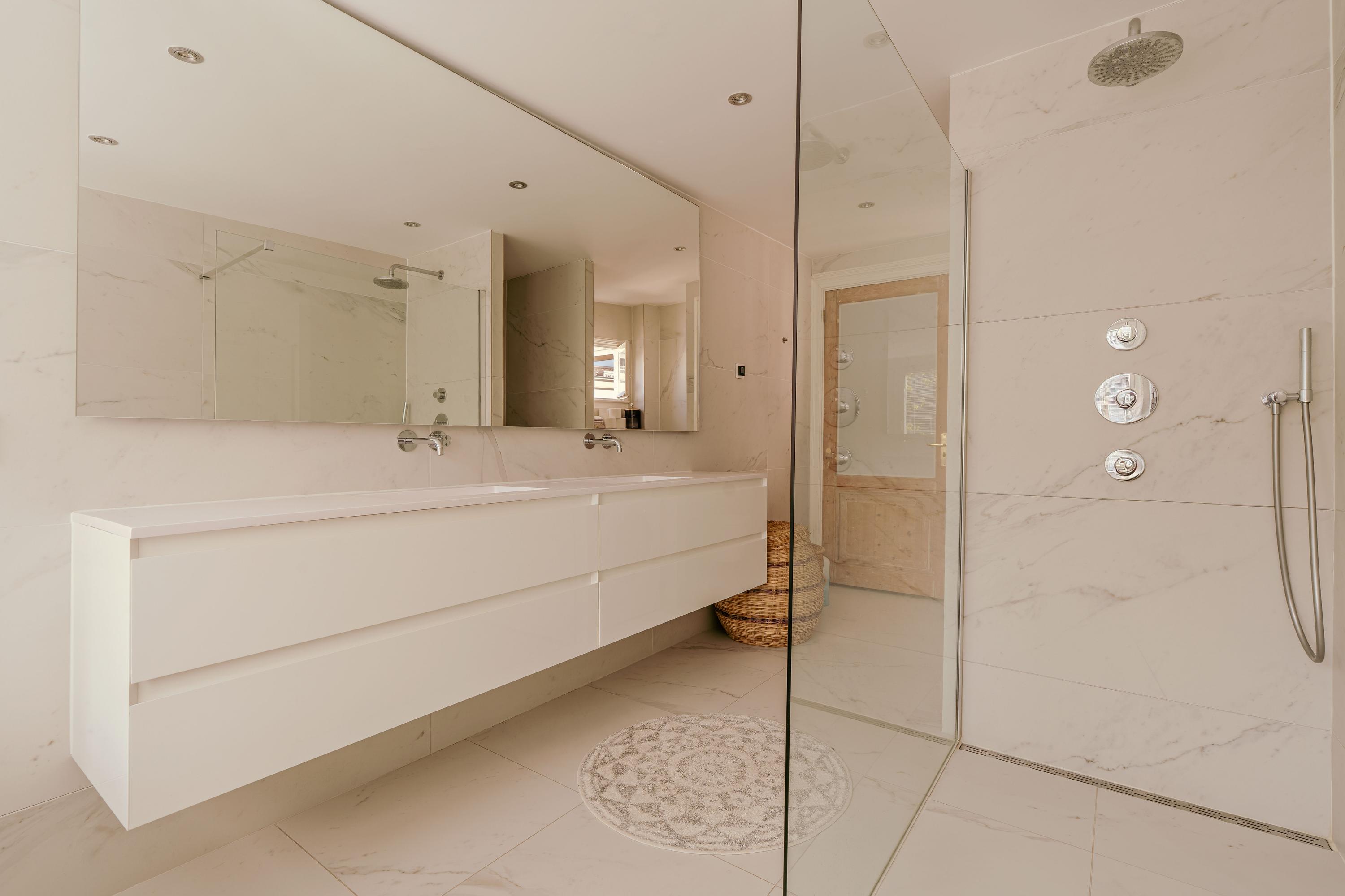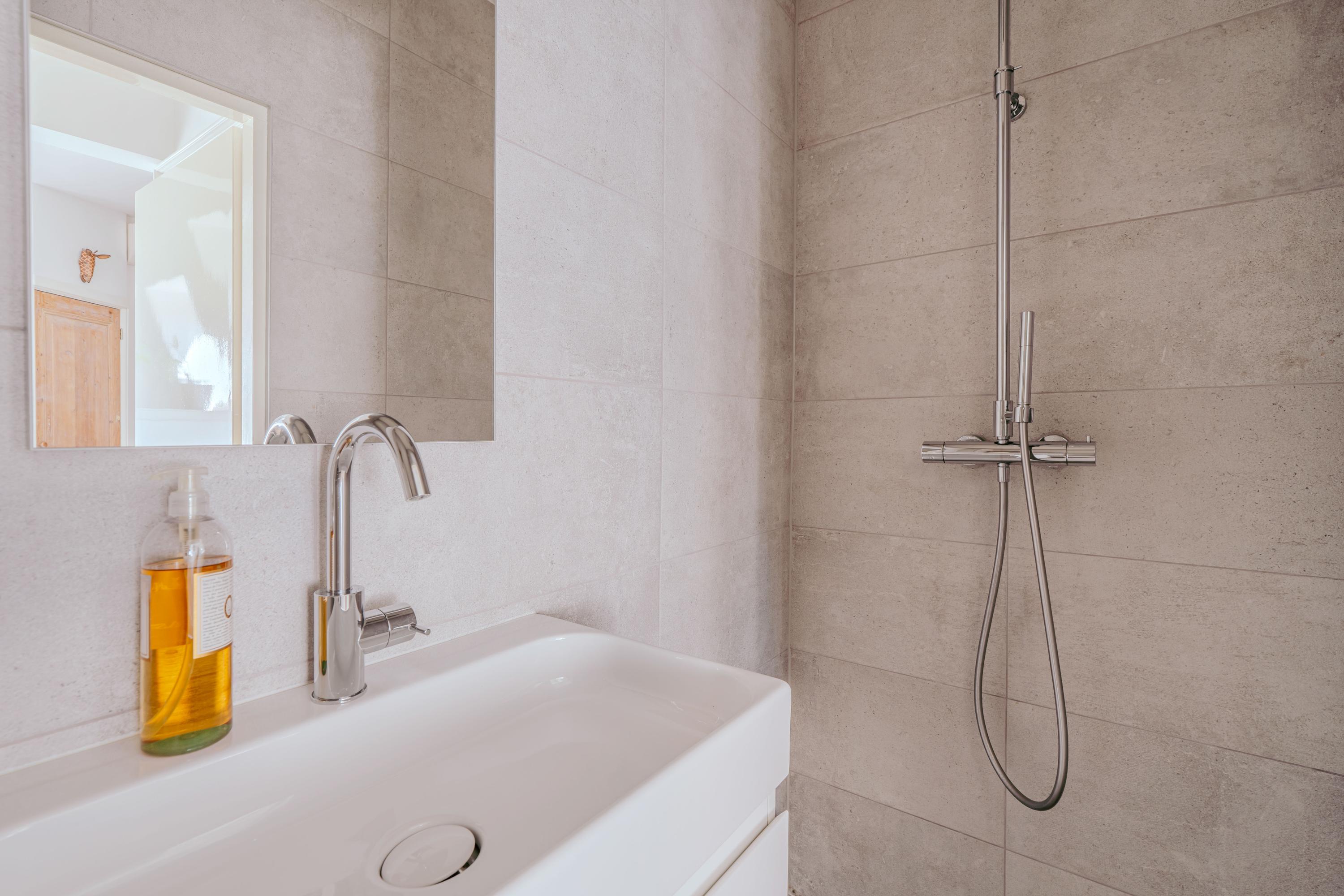 The spacious kitchen, equipped with built-in luxury appliances, adjoins the central living area, softened by double glazing and climate comfort through partial underfloor heating and air conditioning. Two elegant bathrooms and a series of storage solutions support daily rituals and longer stays alike. Electric shutters and natural ventilation echo attention to comfort and privacy.