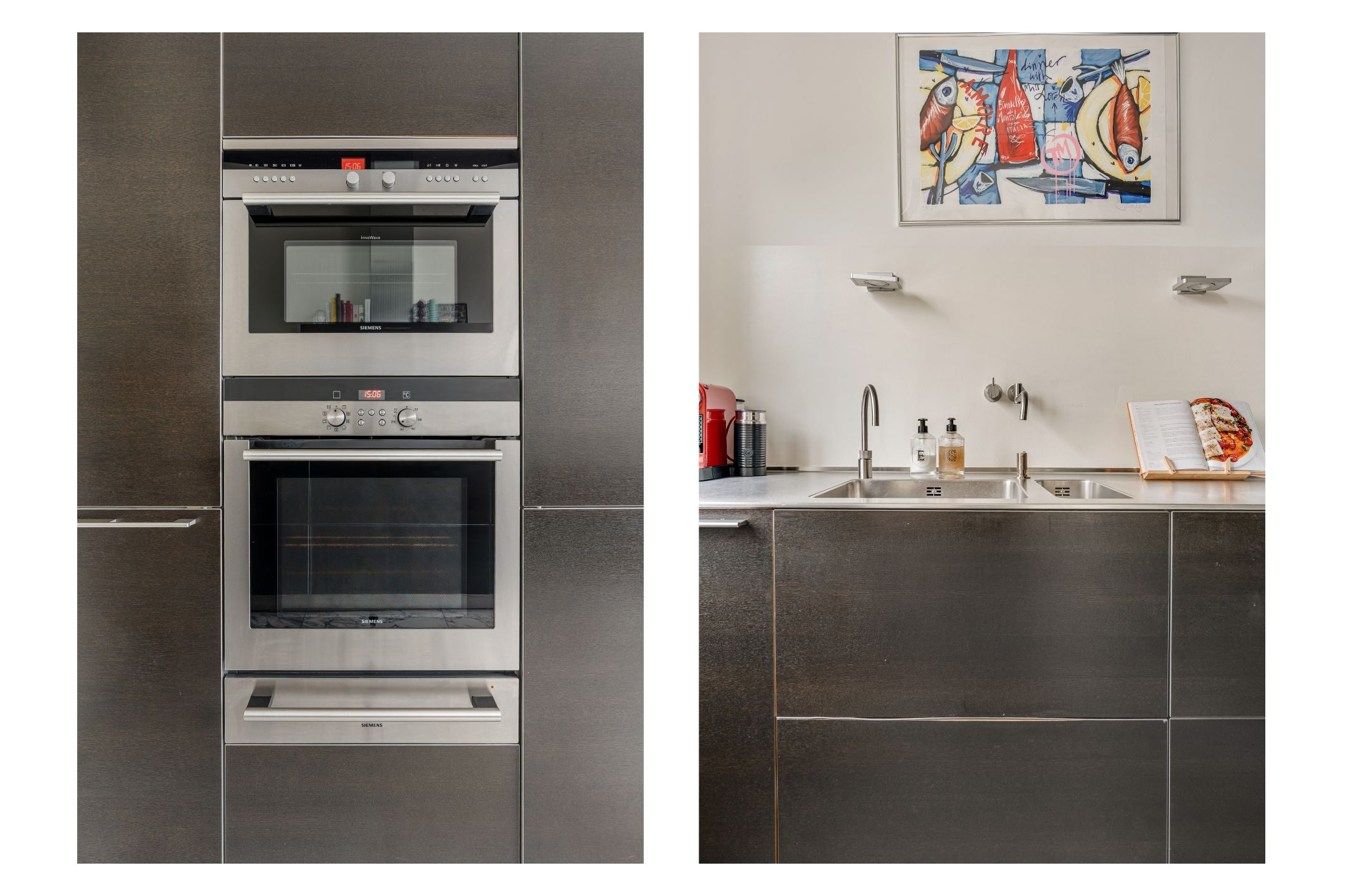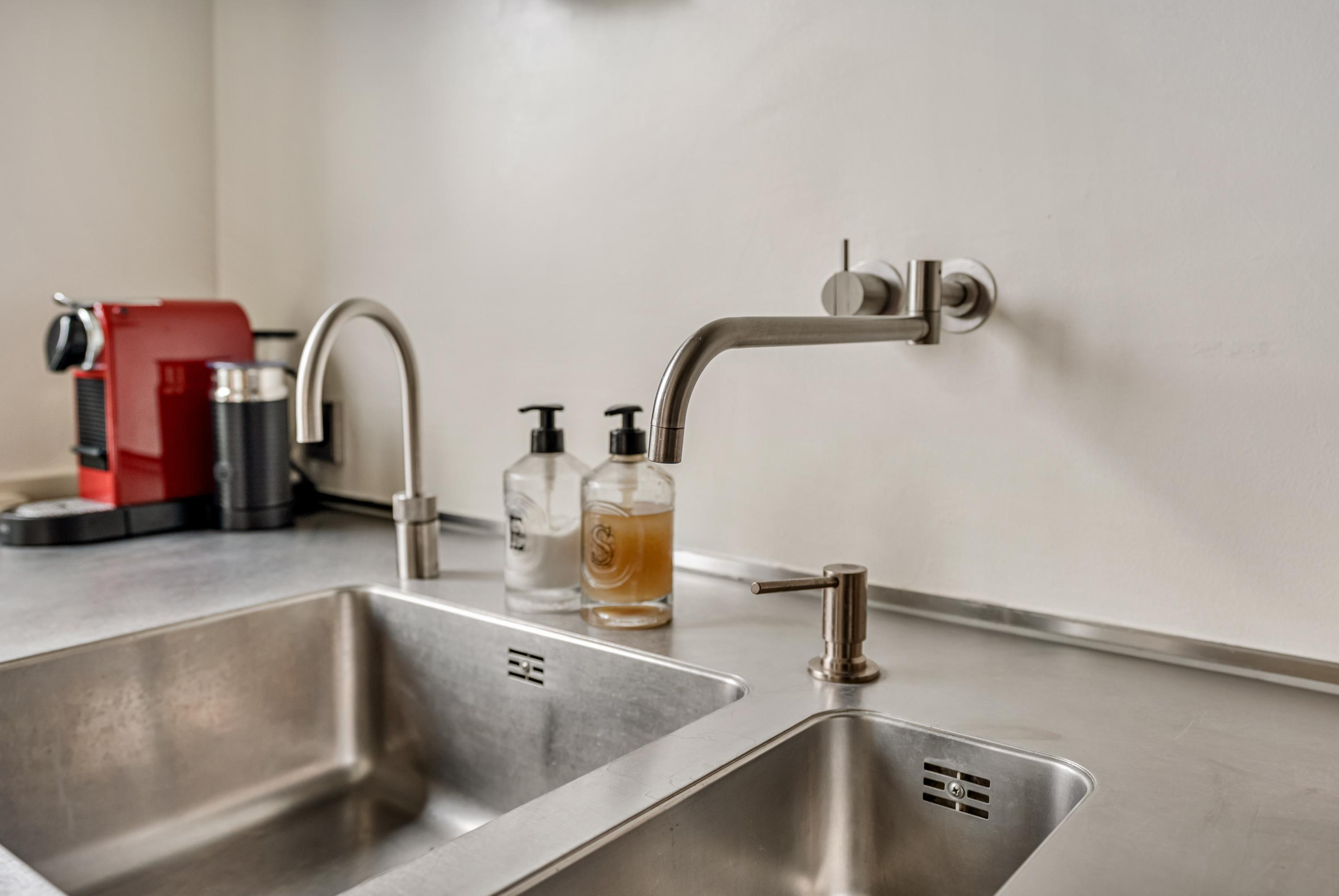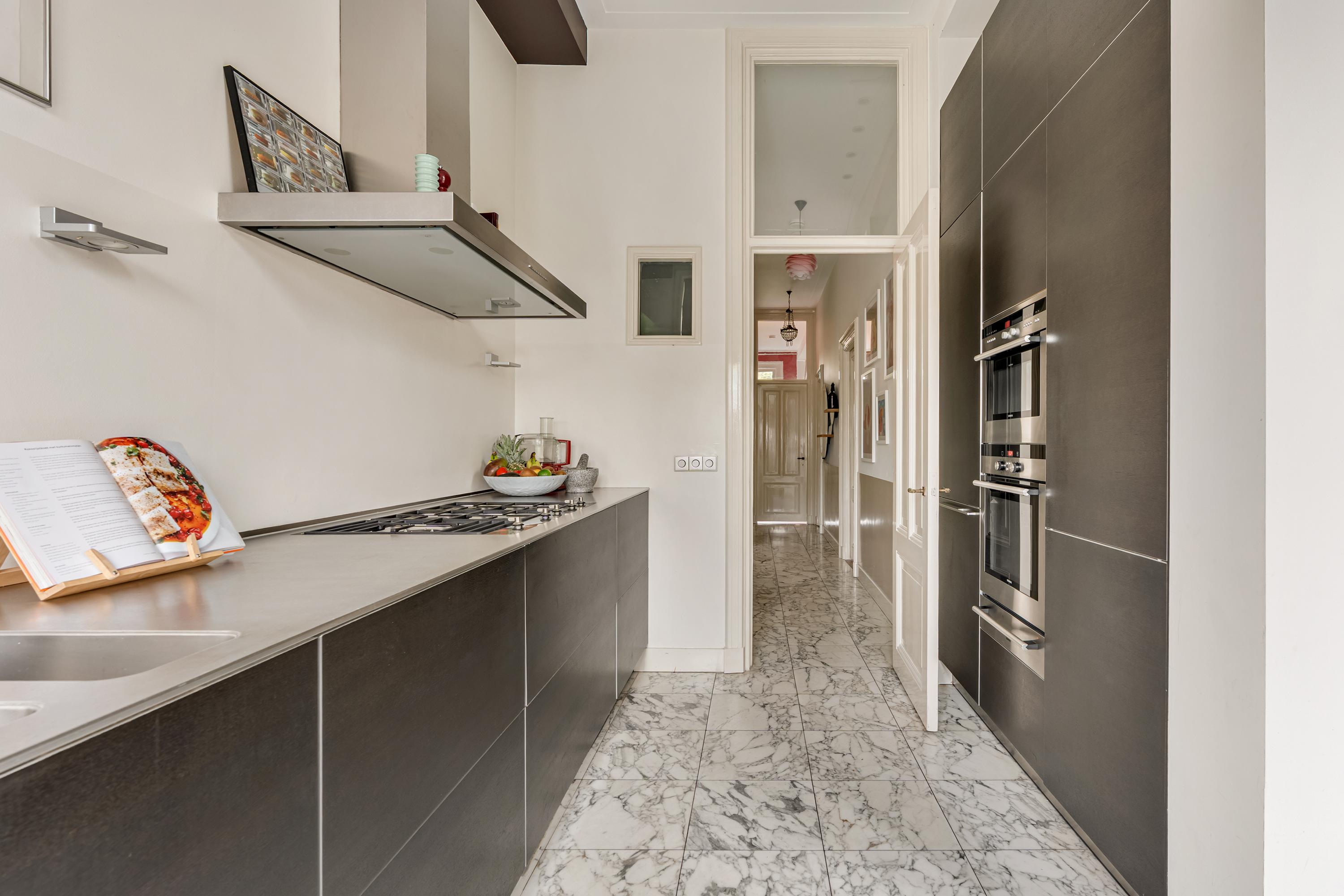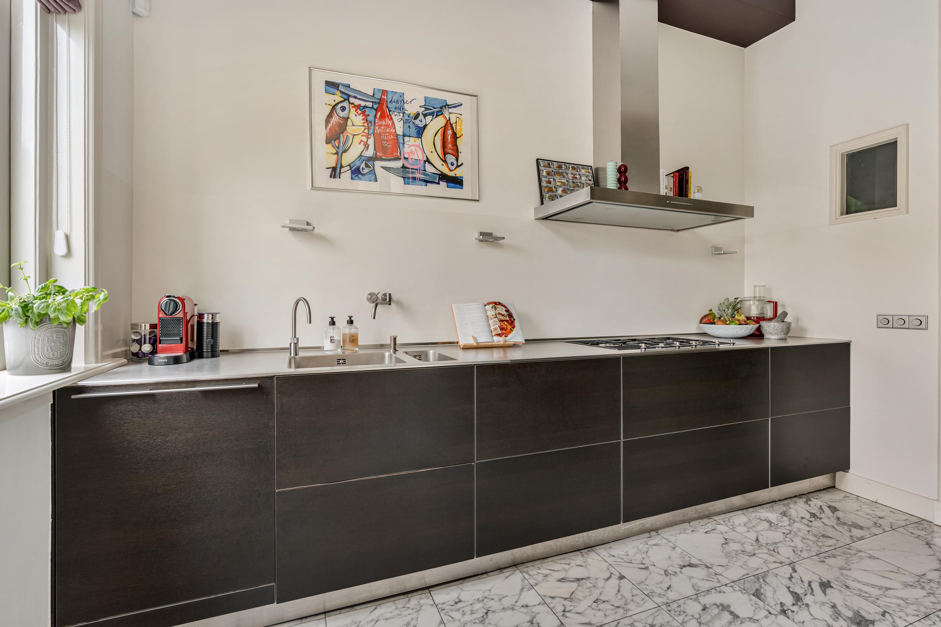 At the rear is the semi-open kitchen, connected to the dining area. The kitchen is modern and features a marble floor and high-quality built-in appliances, including a five-burner gas hob, Quooker tap, fridge-freezer, oven and microwave with plate warmer, and a dishwasher. A stylish and functional space with plenty of storage.