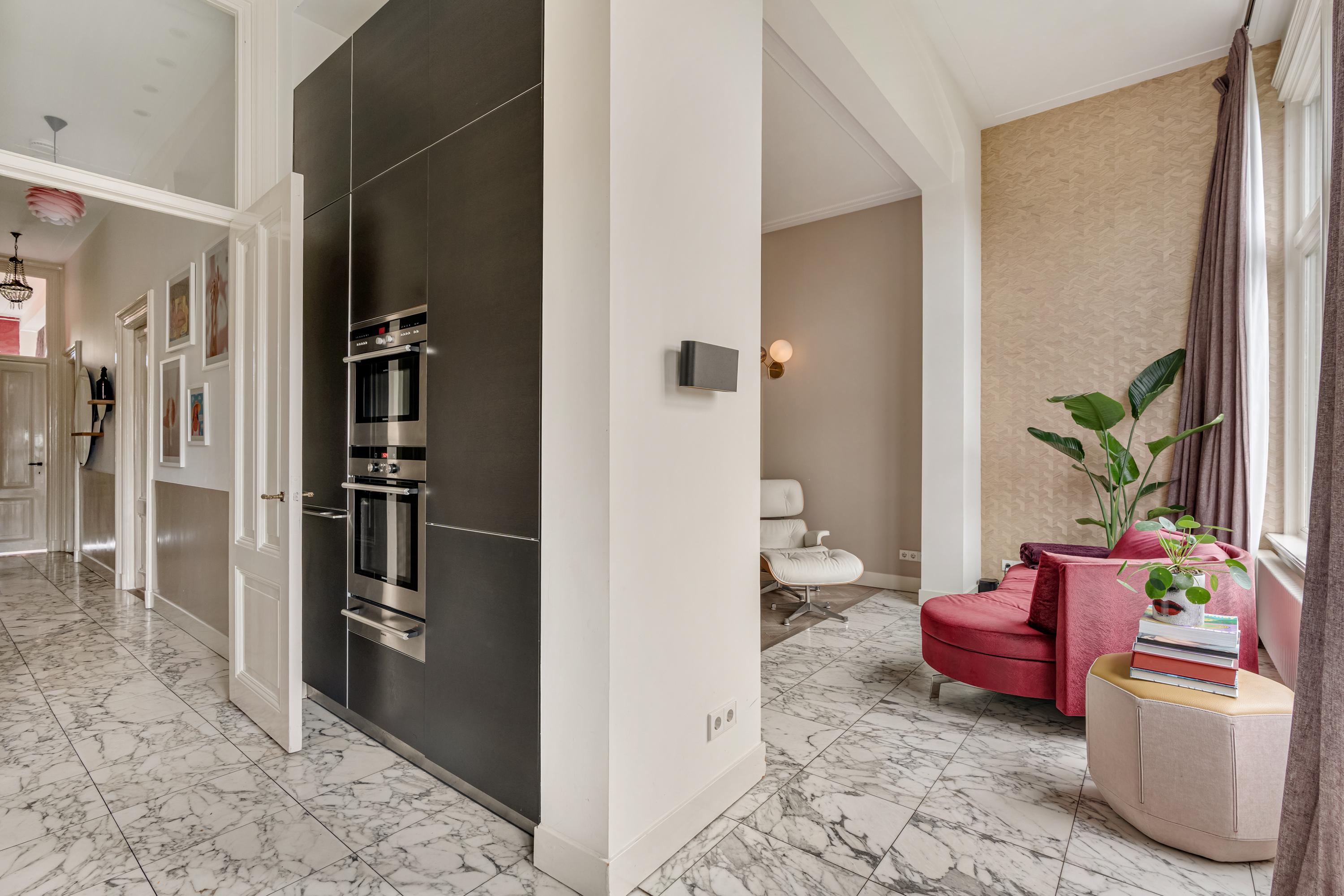 On the distinguished Vossiusstraat, directly bordering the Vondelpark, lies this remarkable upper residence of approximately 183 m², spread over two floors and featuring several outdoor spaces, including a spacious roof terrace of no less than 59 m². The home combines the character of a classic Amsterdam townhouse with the comfort of a modern residence. High ceilings with original ornaments, a light herringbone floor, wooden en-suite doors and marble details give the interior timeless elegance, while the layout and finish create a sense of calm and warmth.