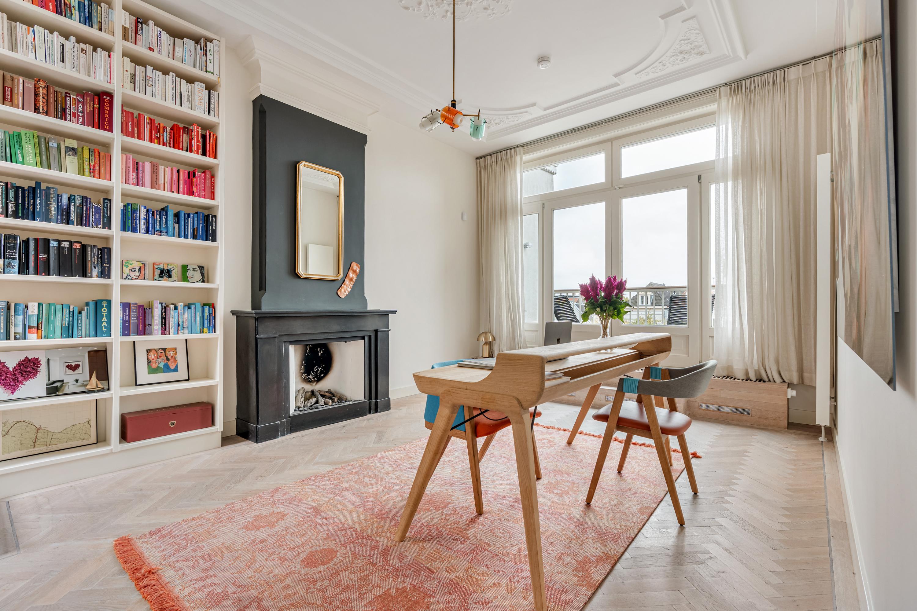 On the third floor, there is a spacious landing with a separate toilet and several rooms, including two bedrooms at the rear, one of which features built-in wardrobes, a fireplace and access to the sunny south-facing balcony. From this room, French doors lead to the generous roof terrace of approximately 58 m², where you can enjoy the sun and panoramic views of the city all day long. This room is currently used as an office but can easily be converted into an additional bedroom, guest room or studio.