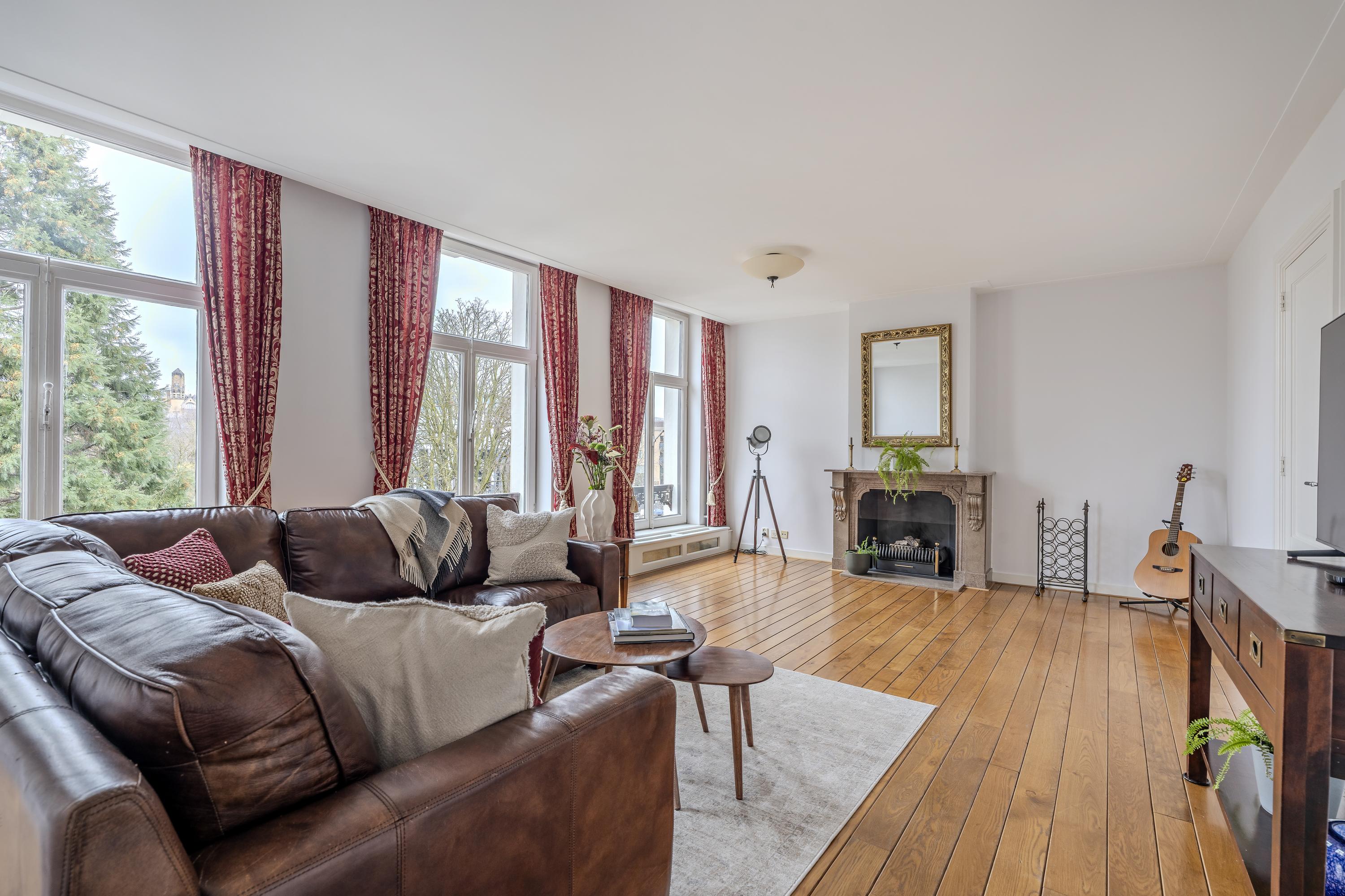 Apartment Amsterdam Vossiusstraat offers a rare confluence of space, privacy, and enduring craftsmanship along one of Amsterdam's most revered addresses. This 130 m² duplex resides in a monumental building directly adjacent to Vondelpark, enveloping you in verdant views and the cultural pulse of Oud-Zuid. From the expansive living room with fireplace and wide French balconies, the lushness of the Vondelpark and the curve of the Singelgracht become part of daily rhythm. The dining area, with an open kitchen and island, flows onto a south-east facing balcony of approximately 4 m², where morning light reveals glimpses of the Rijksmuseum and the energy of P.C. Hooftstraat below.