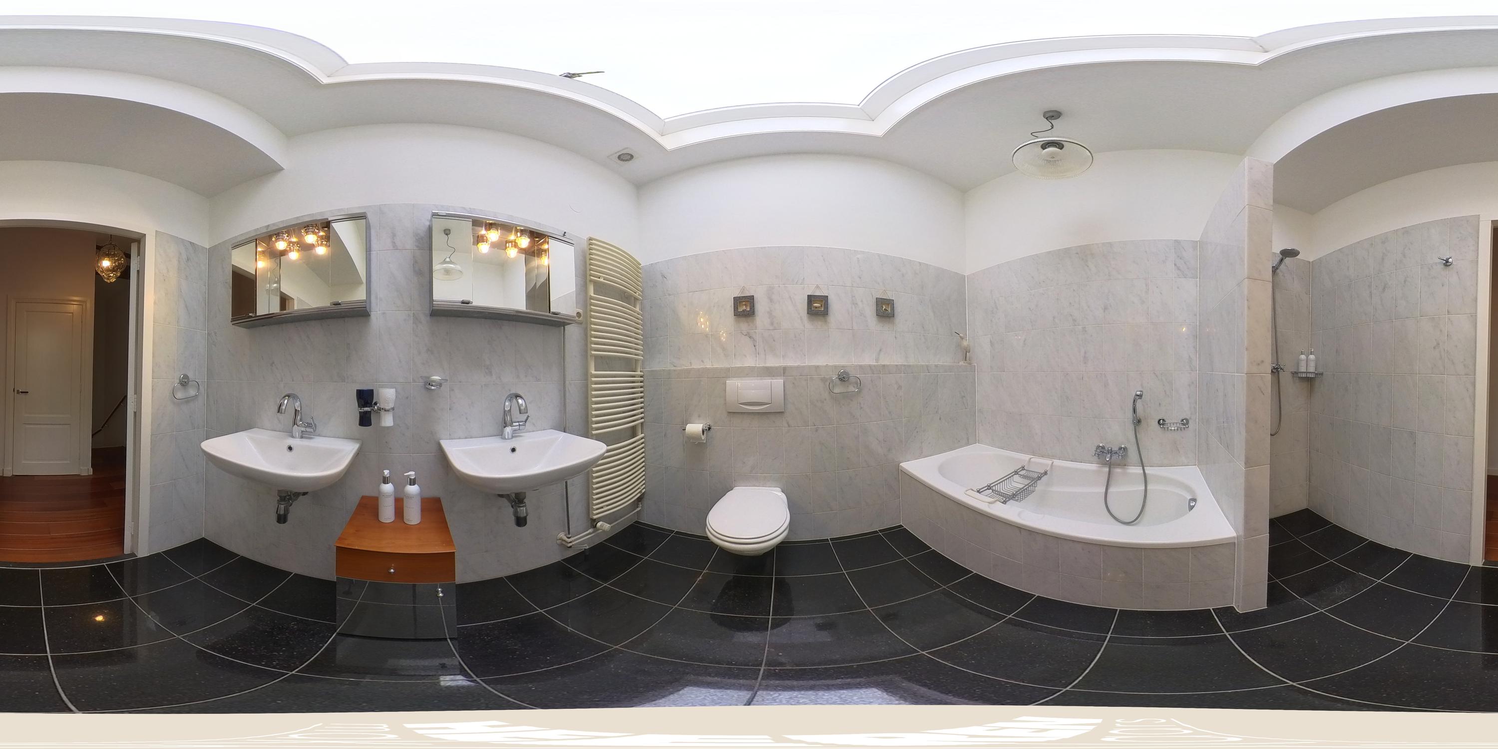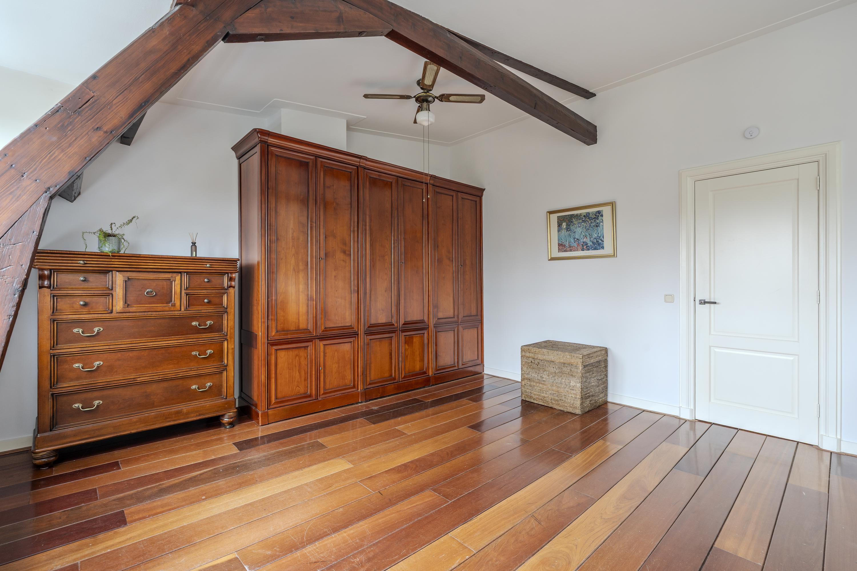 On the top floor, two full-width bedrooms each offer a distinct outlook: one frames the tranquil foliage of the park, the other surveys a green courtyard. Original timber beams and large windows suffuse these rooms with character and natural light. The central bathroom features a bathtub, walk-in shower, double vanity, and elegant finishes, complemented by a dedicated utility area with washing machine and dryer storage.