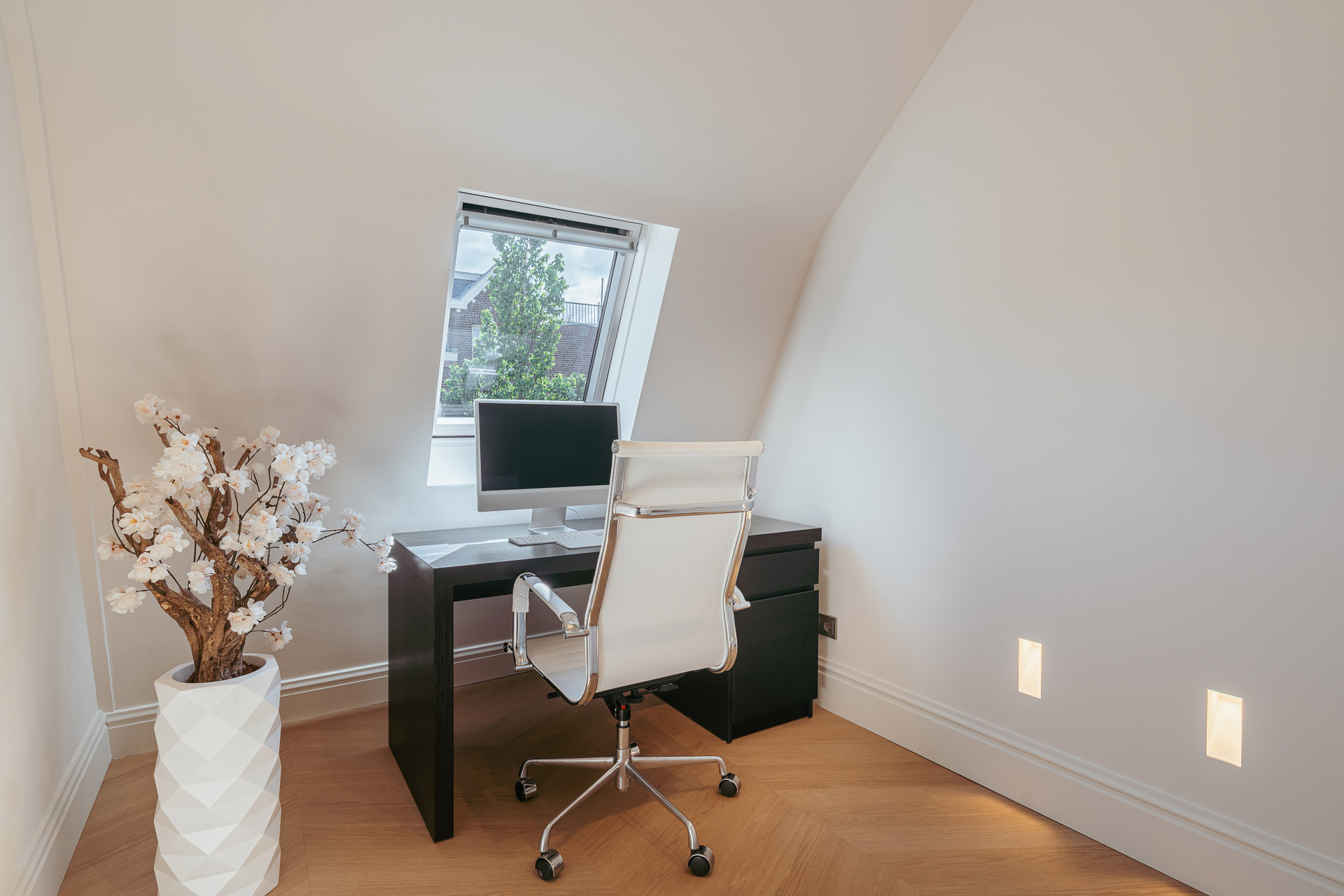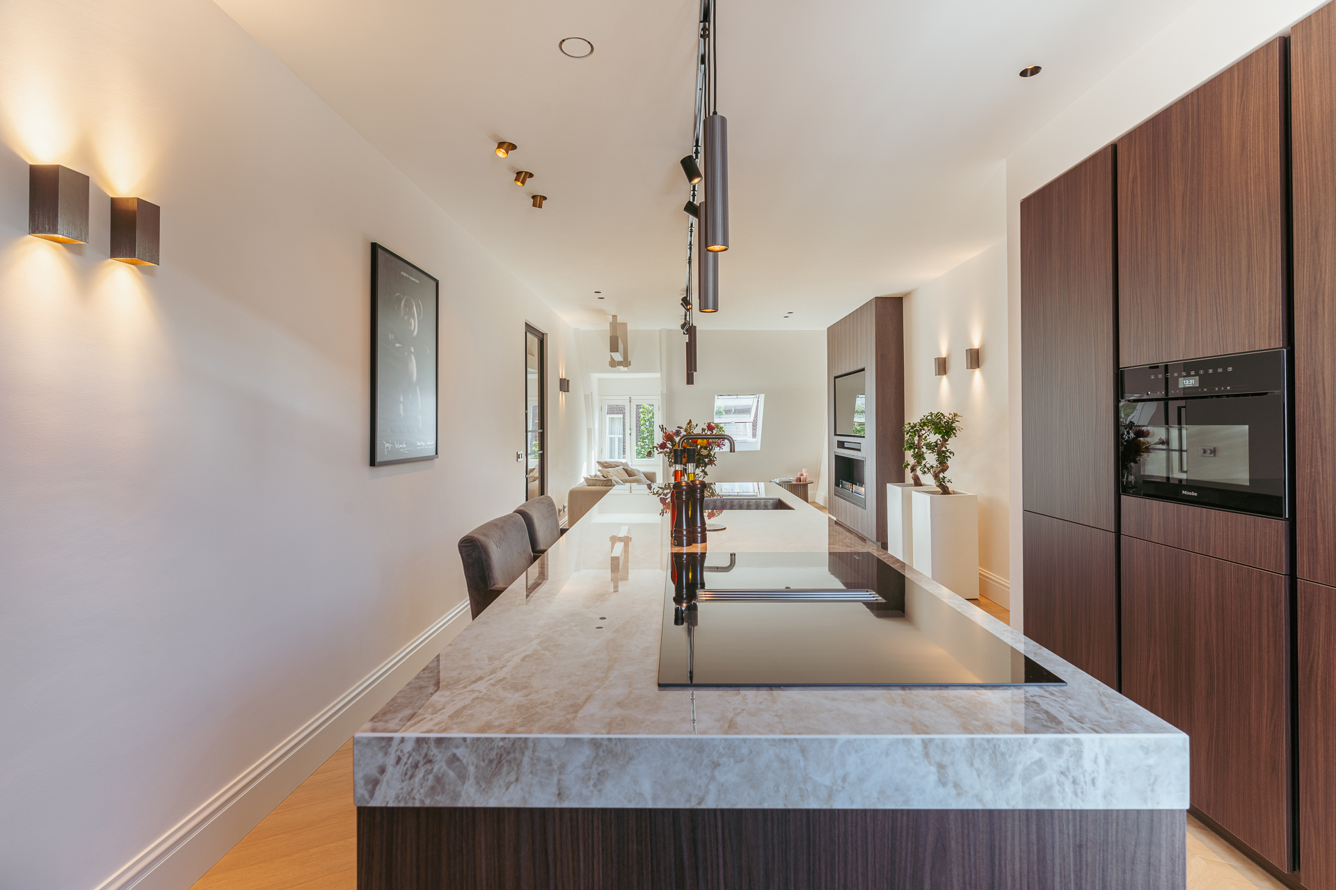 On the top floor, you enter through a sleek integrated sliding door into a beautiful, spacious hallway that provides access to all rooms. The heart of the home is the open-plan living and dining area, which spans the entire length of the apartment. With windows on both sides, the space is flooded with natural light. At the front is the sitting area, complete with a cozy bio-ethanol fireplace stylishly integrated into a built-in cabinet with TV. At the rear lies the modern open kitchen with a cooking island. Finished with a Dekton countertop, the kitchen is equipped with every luxury appliance imaginable, including a wine cooler, Quooker tap, dishwasher, fridge/freezer, Miele combi-oven, and a Miele induction hob with integrated extraction system. The bar section of the island also makes this a sociable spot to cook together or enjoy a glass of wine with family and friends.