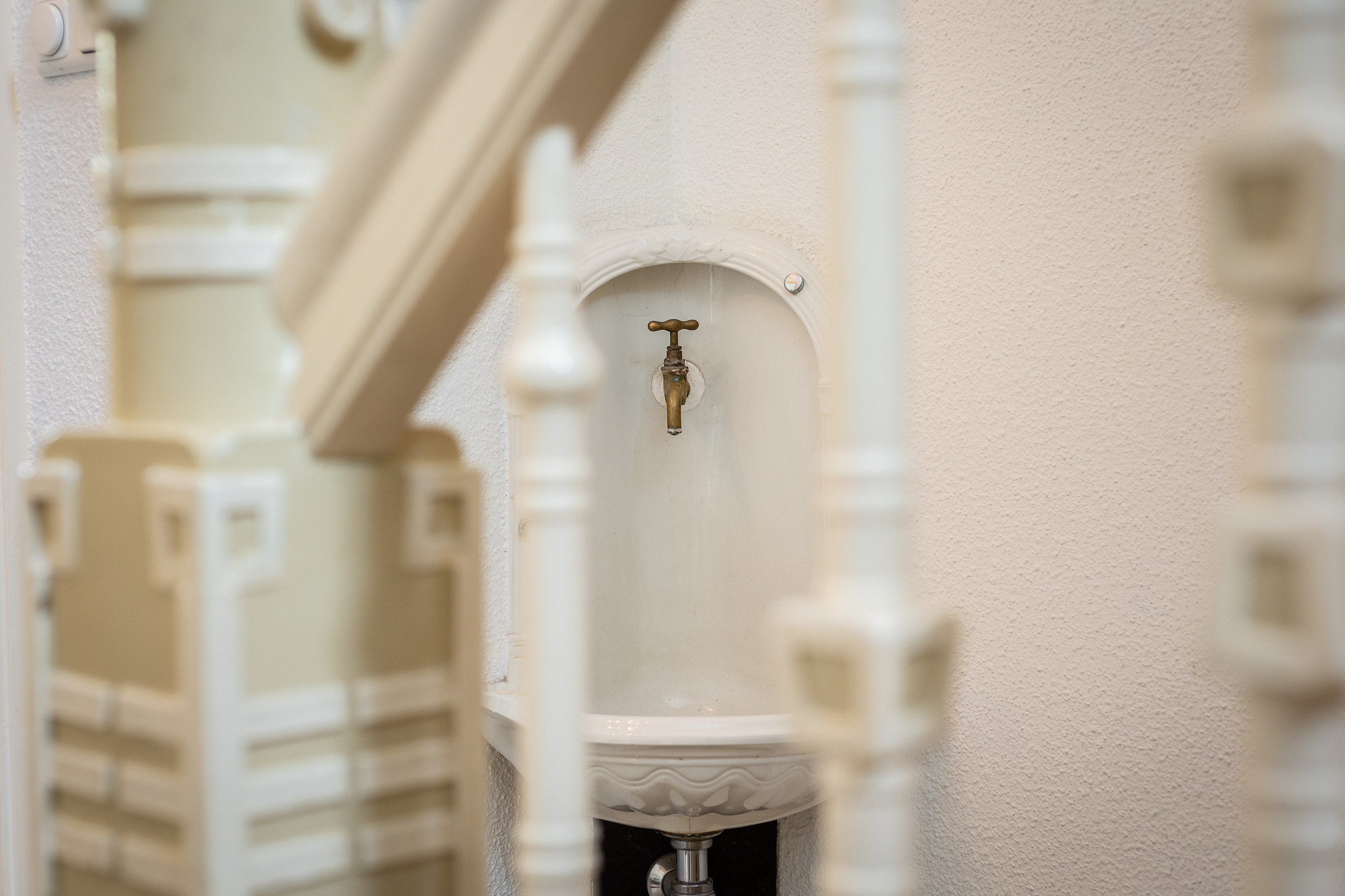 The first floor is accessed via the monumental burgundy staircase. The master bedroom has two balconies, one with a loggia, and fitted wardrobes. The modern bathroom has a walk-in shower, bath, double basins with columns and underfloor electric heating. French doors lead to the roof terrace. A separate cloakroom and second toilet complete this floor.