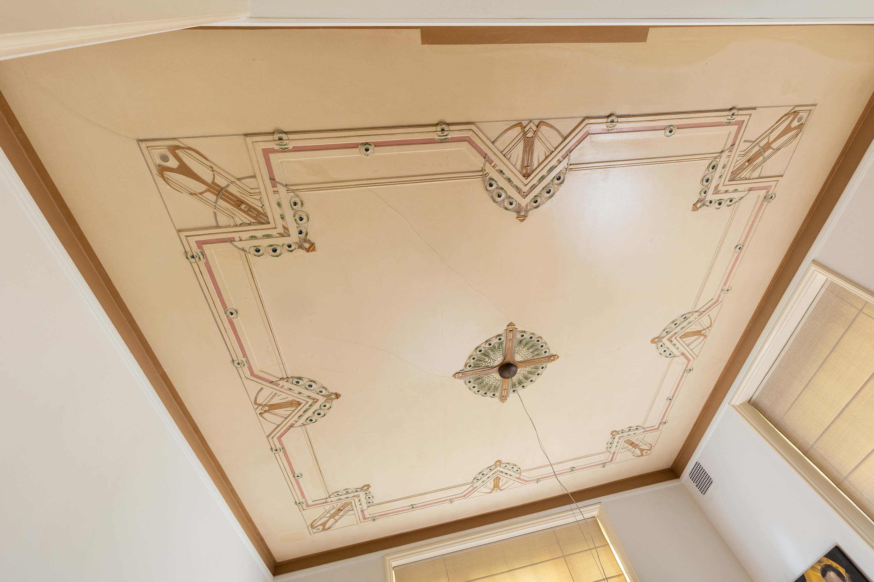 To the left of the hall is a spacious study, ideally situated at the front of the house, with a unique oil-painted ceiling in original colours. This room offers tranquillity and character, perfect as a home office or study.