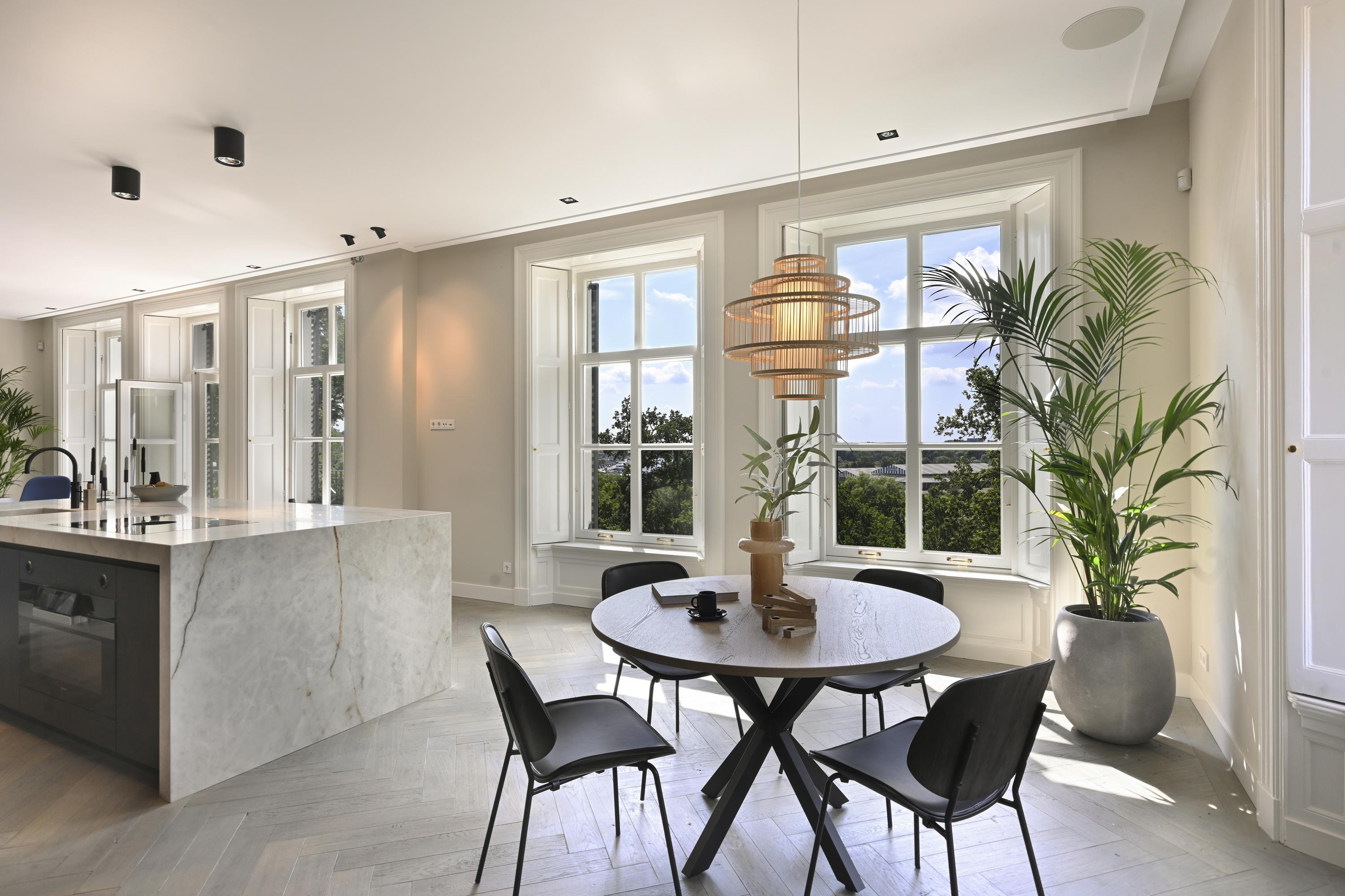 In de statige entree staat u even stil bij de imposante eikenhouten trappartij die fraai wordt uitgelicht door de imposante kroonluchters. Of pakt u toch liever de lift waarmee alleen u naar uw appartement op de eerste etage kunt? Eenmaal thuis geniet u van volop licht en ruimte. Door de grote raampartijen op het zuiden ontvouwt zich een geweldig panorama over de Neder-Rijn en het uiterwaardenpark van Meinerswijk. Op zonnige dagen zit u uiteraard op het royale terras met een goed glas gekoelde wijn. Uw appartement is uiteraard voorzien van alle denkbare technologische gemakken. En van twee ruime slaapkamers, twee badkamers en een aparte werkkamer. Hoge plafonds en een hoogwaardige afwerking maken uw Rijnappartement helemaal compleet. Een ideaal thuis voor wie wil genieten van rust, ruimte en luxe, met de Arnhemse binnenstad vlakbij.