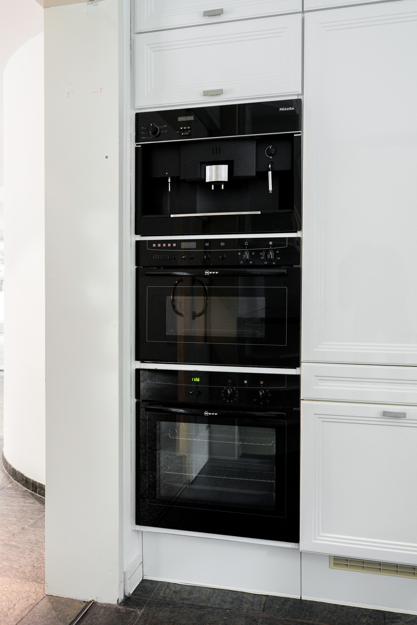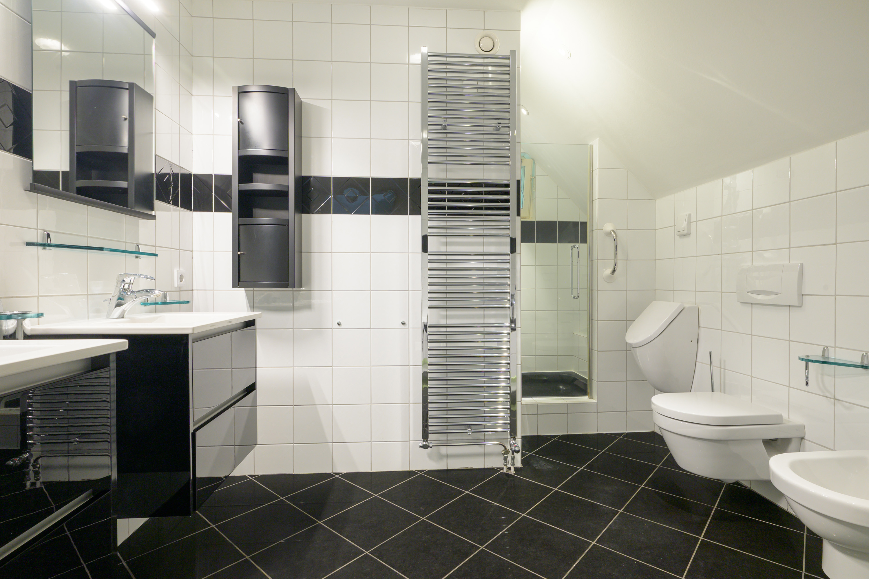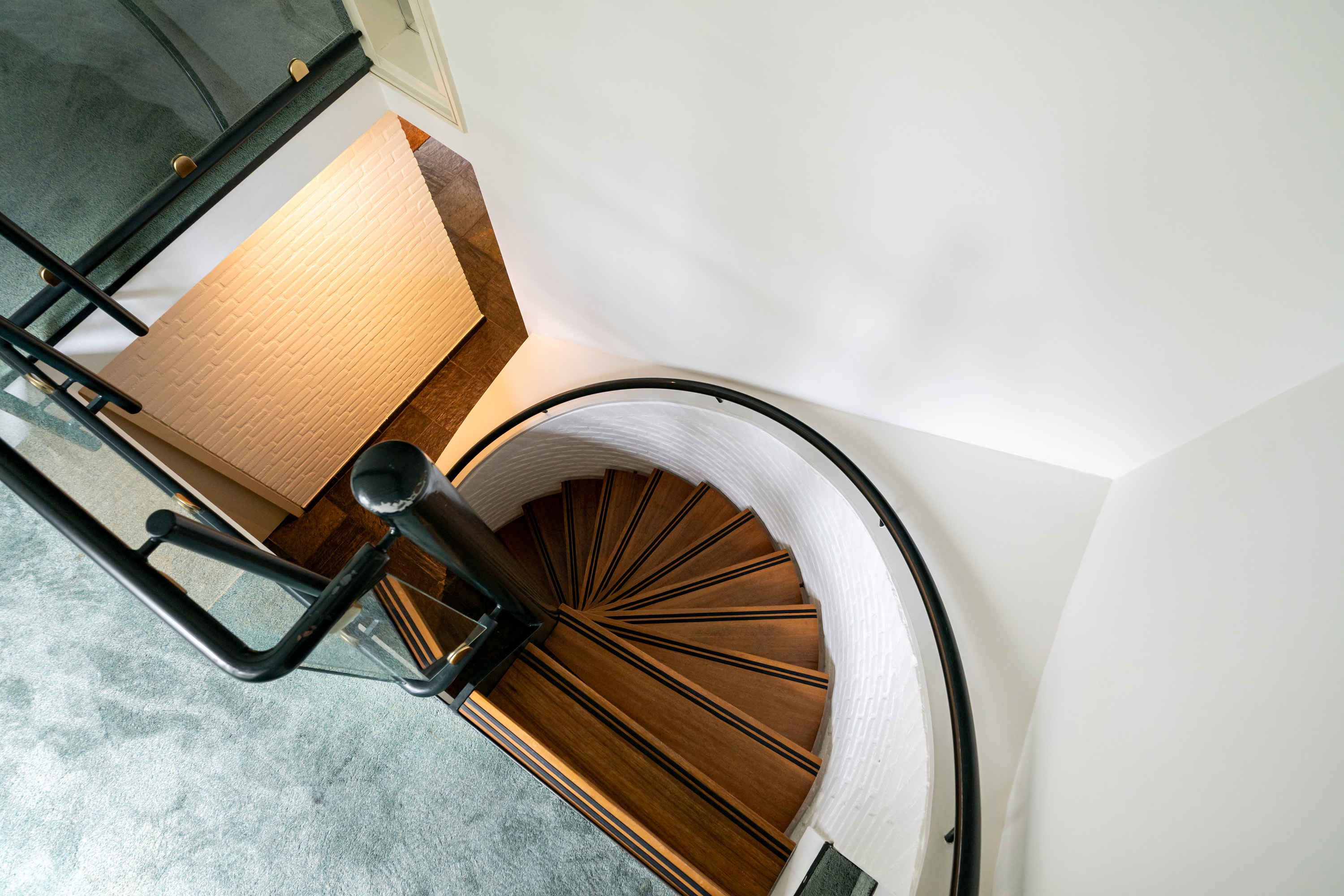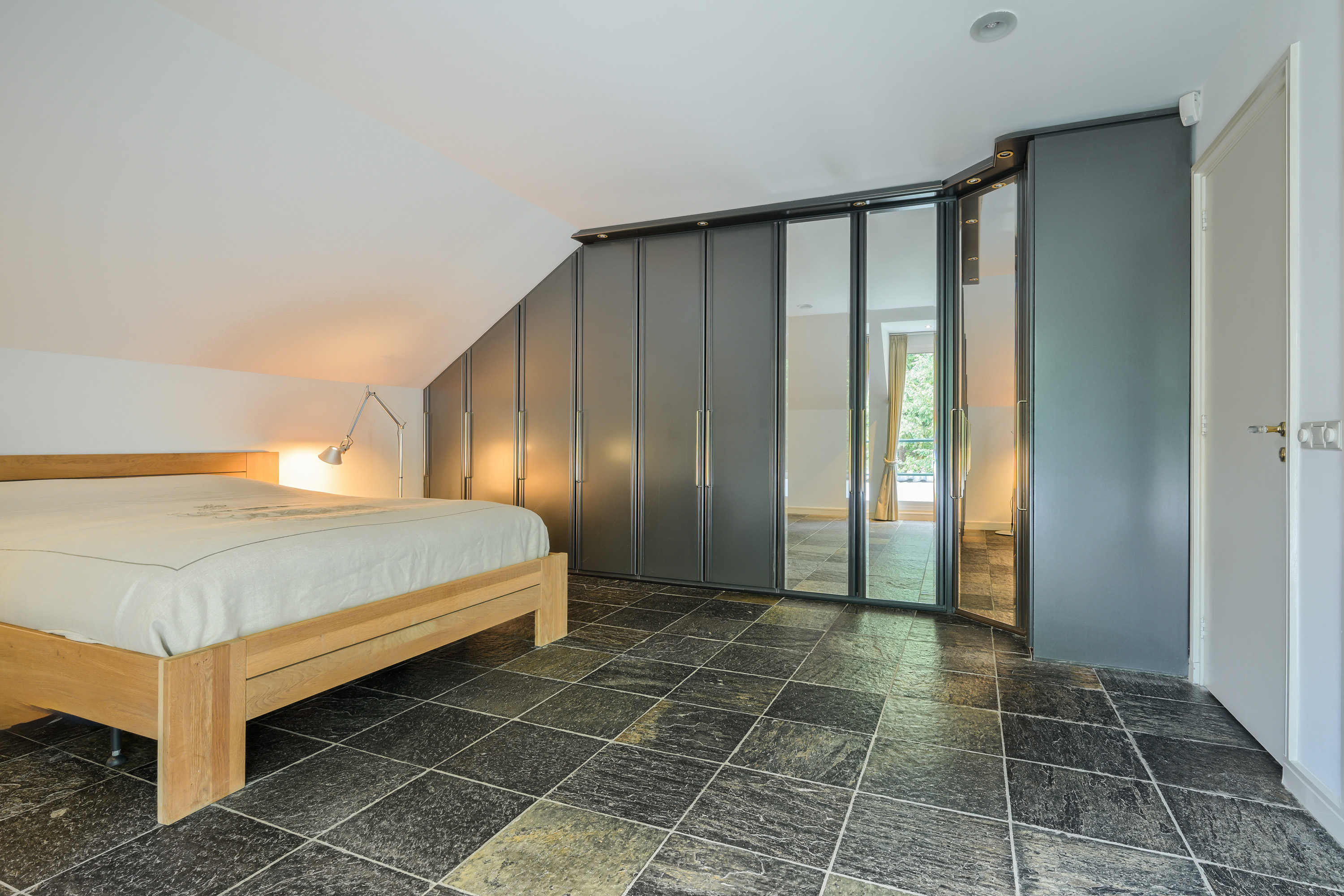 Five flexible bedrooms allow for individual privacy and adaptation, with dedicated spaces easily reimagined for study, studio, or guest purposes. The primary suite opens directly onto a balcony, while the lower level provides additional living or working areas. Bathrooms are finished with contemporary fittings, walk-in showers, and designer radiators to maintain quiet comfort.