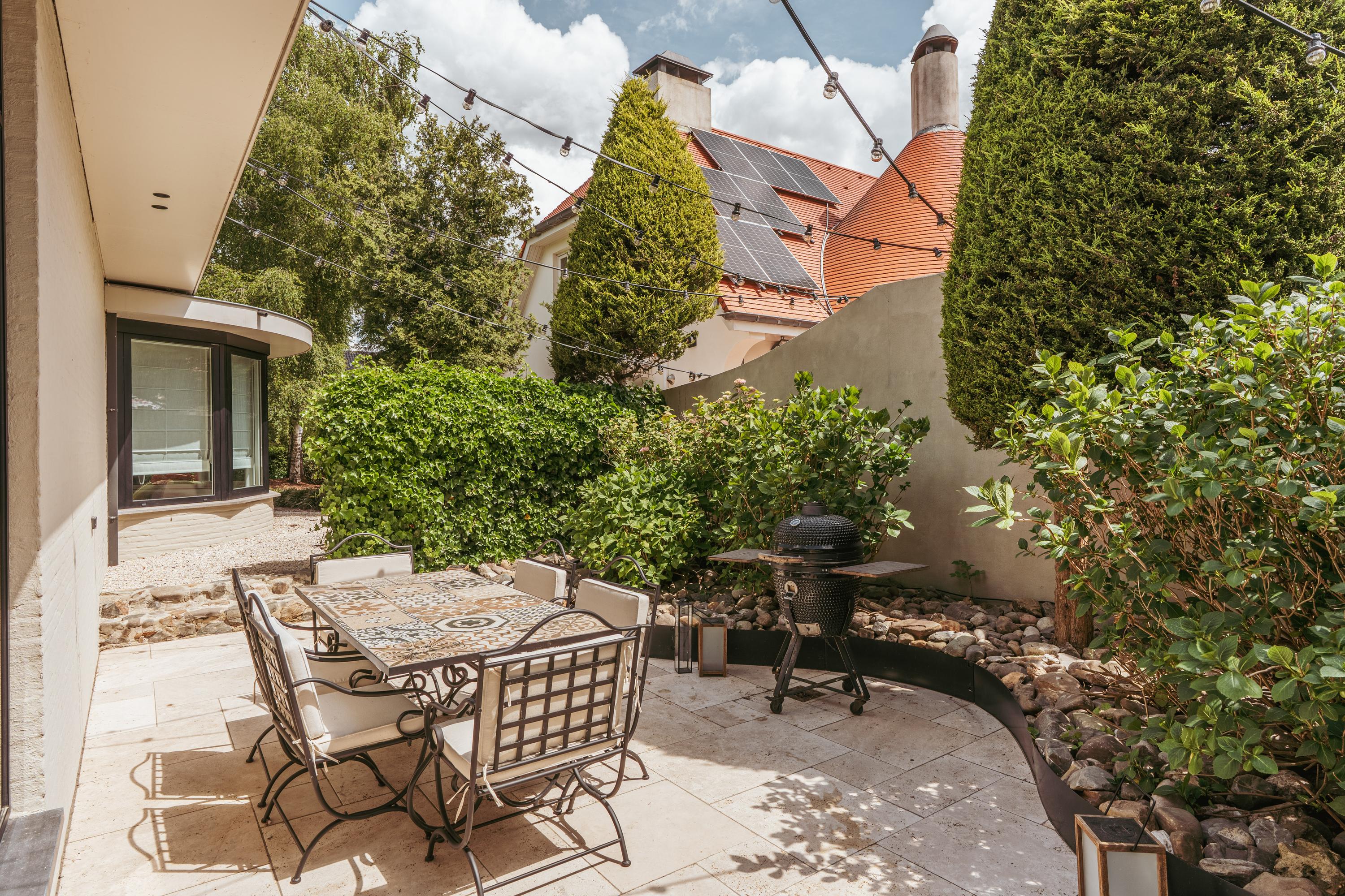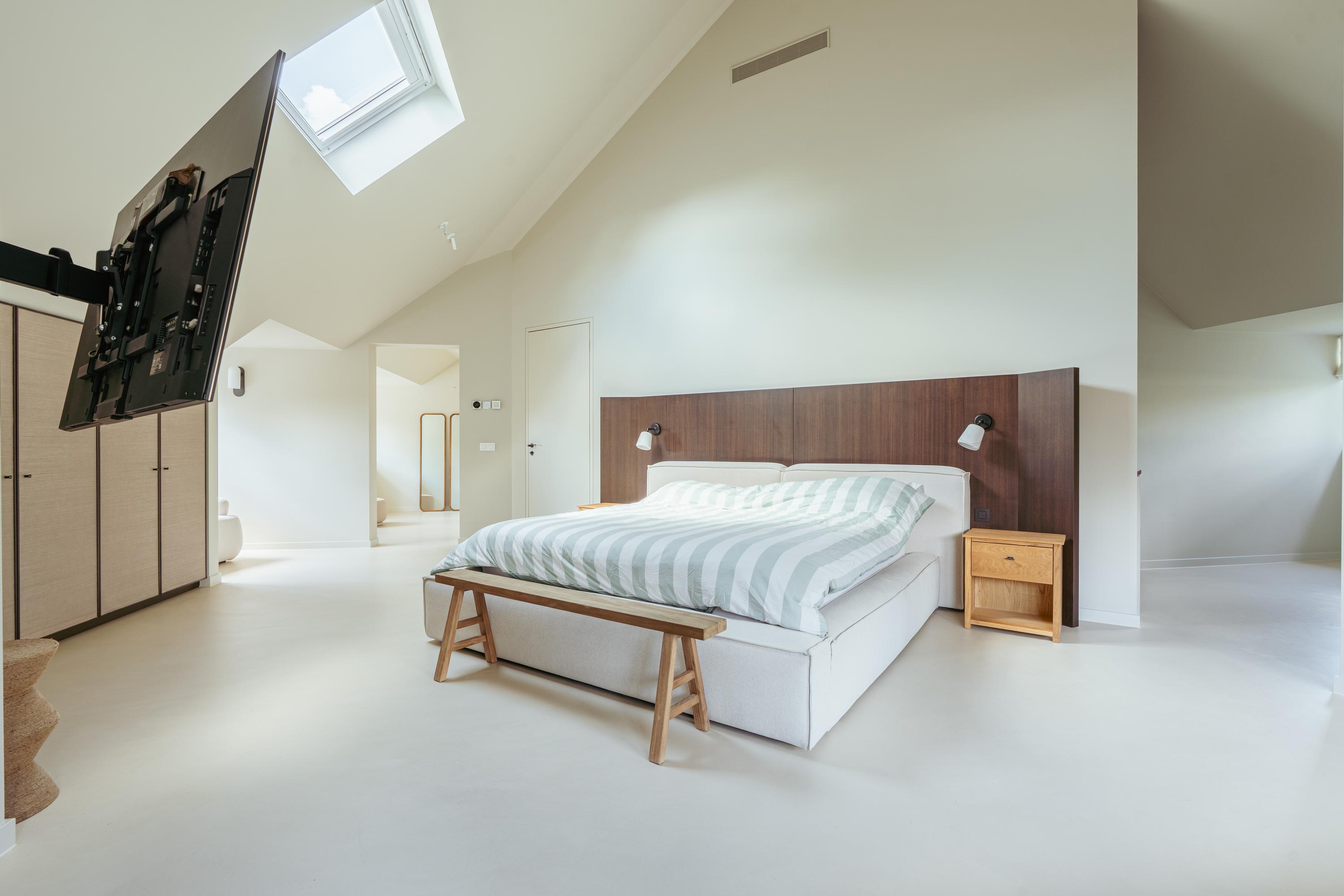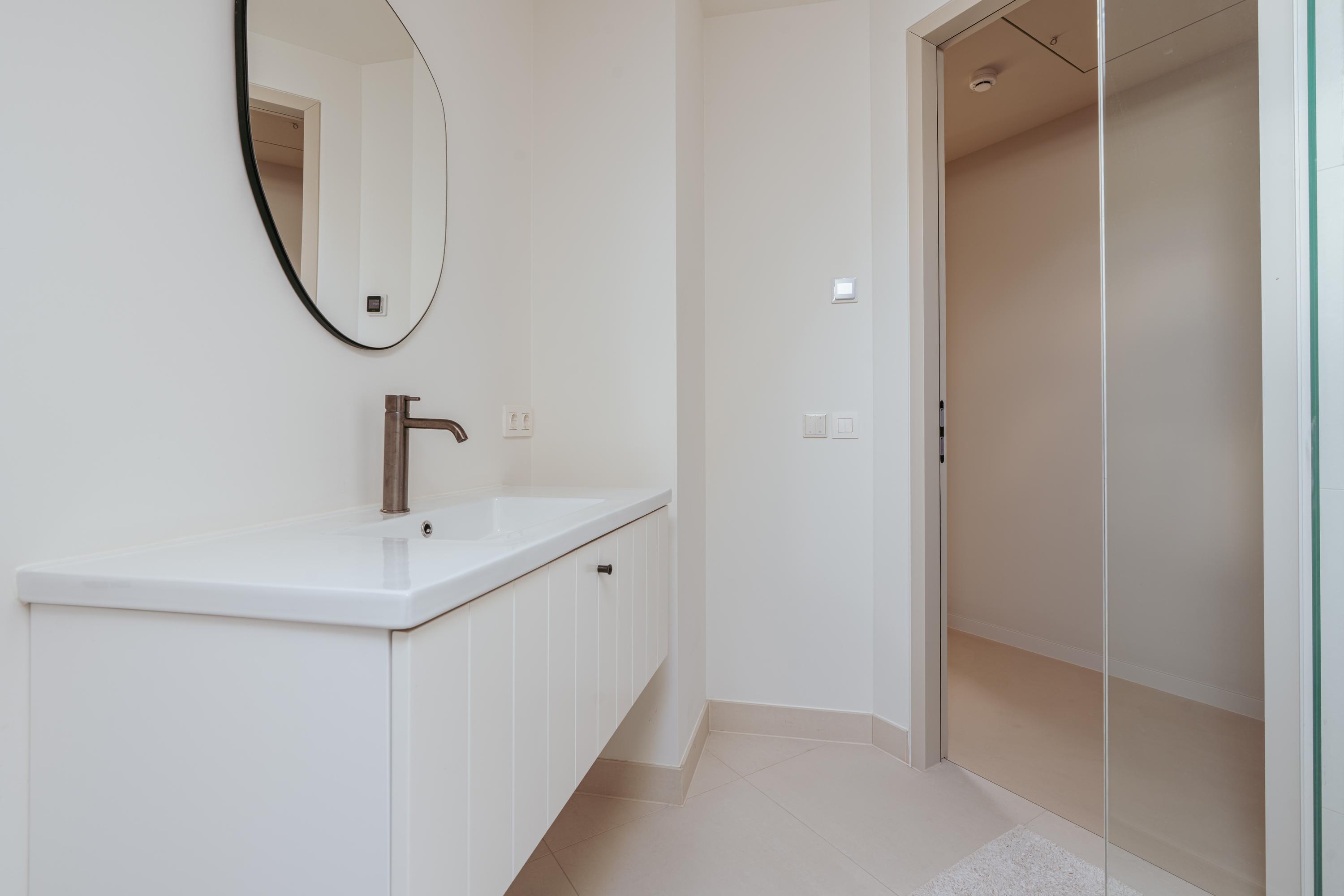 Upstairs, three expansive bedrooms promise flexibility, while the master suite features a freestanding tub, walk-in wardrobe, and built-in cabinetry. Two bathrooms offer refined fixtures and walk-in showers. The villa’s garage is currently fitted as a private gym, and a loft attic adds valuable storage. Practical features include a home automation system, solar panels, advanced insulation, and energy label A. Facilities include an alarm, air conditioning, fiber optics, and balanced ventilation.
