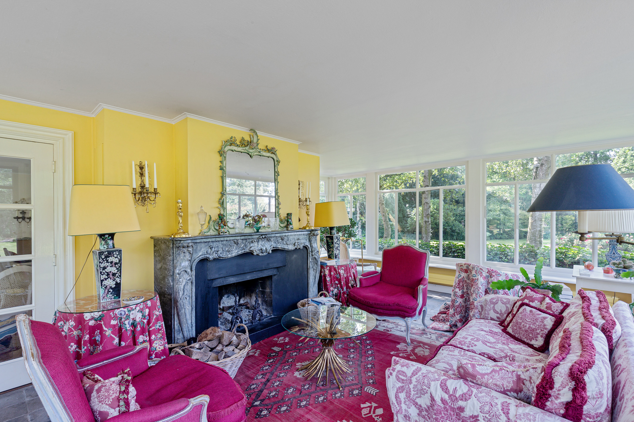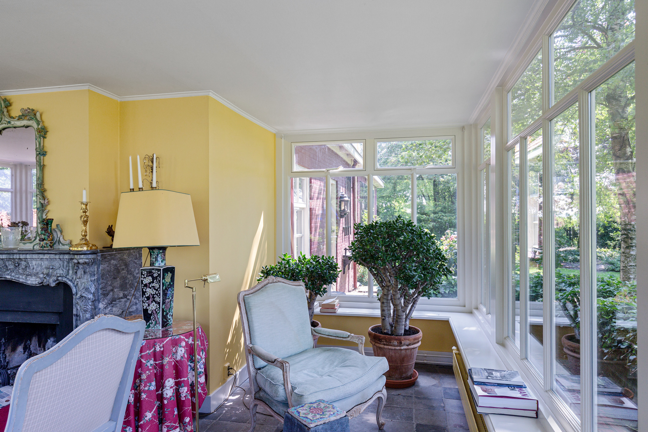 The sitting room and conservatory showcase unique period details, including a marble fireplace from an Amsterdam canal house (circa 1740) and French doors opening onto the garden. Beneath the conservatory lies a hidden wine cellar with an electric hatch, laid with 18th-century tiles, 17th-century oak wine racks, and original cabinet doors.