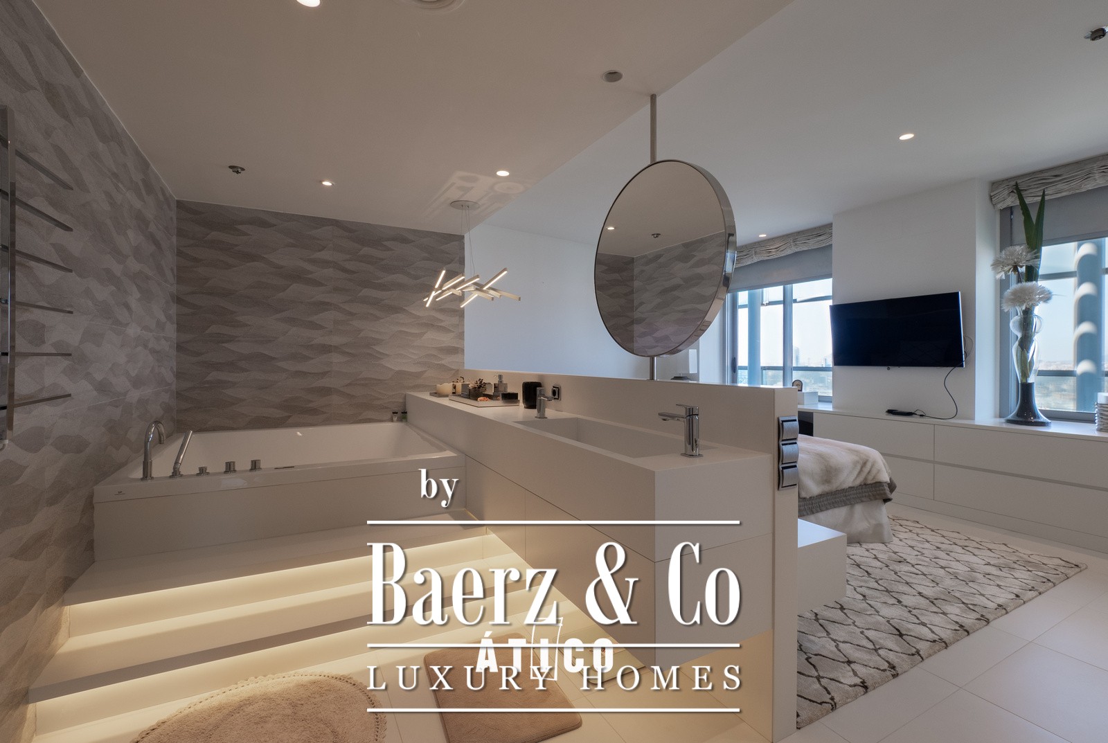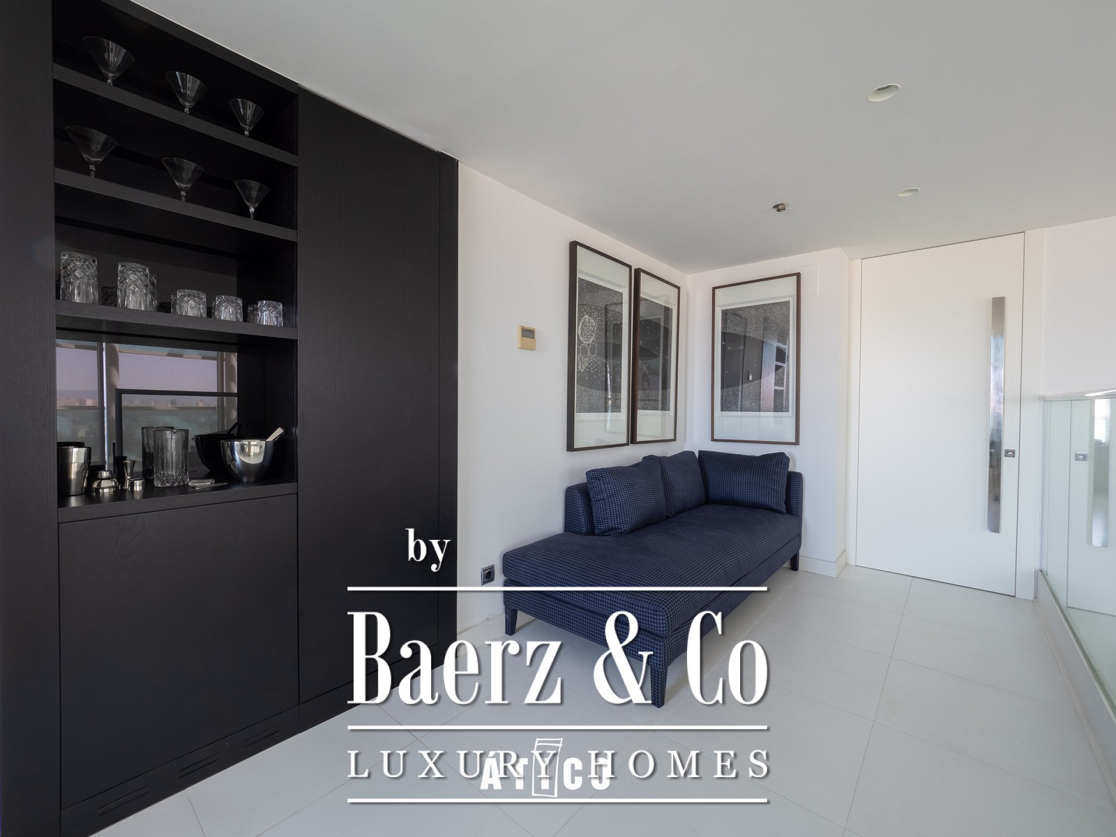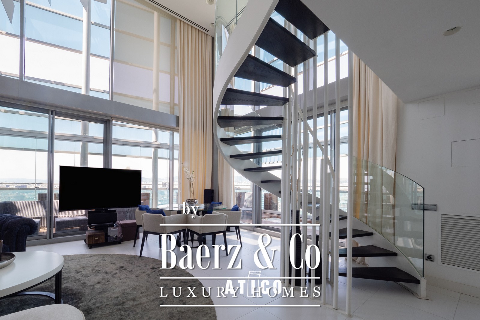Upon entering, you will be greeted by a bright, open-plan space that maximises the views of the sea and the park with its surrounding waterfalls. The modern and sophisticated design, together with high-quality materials, creates a welcoming and elegant atmosphere. The spacious living room, bathed in natural light thanks to its large windows, offers stunning panoramic views of the vibrant city of Barcelona, ​​as well as access to a terrace that surrounds the entire apartment and features a private pool.