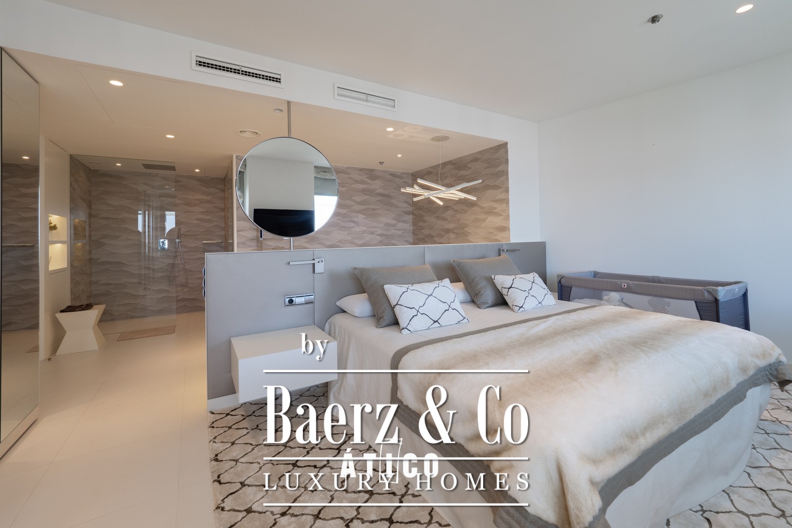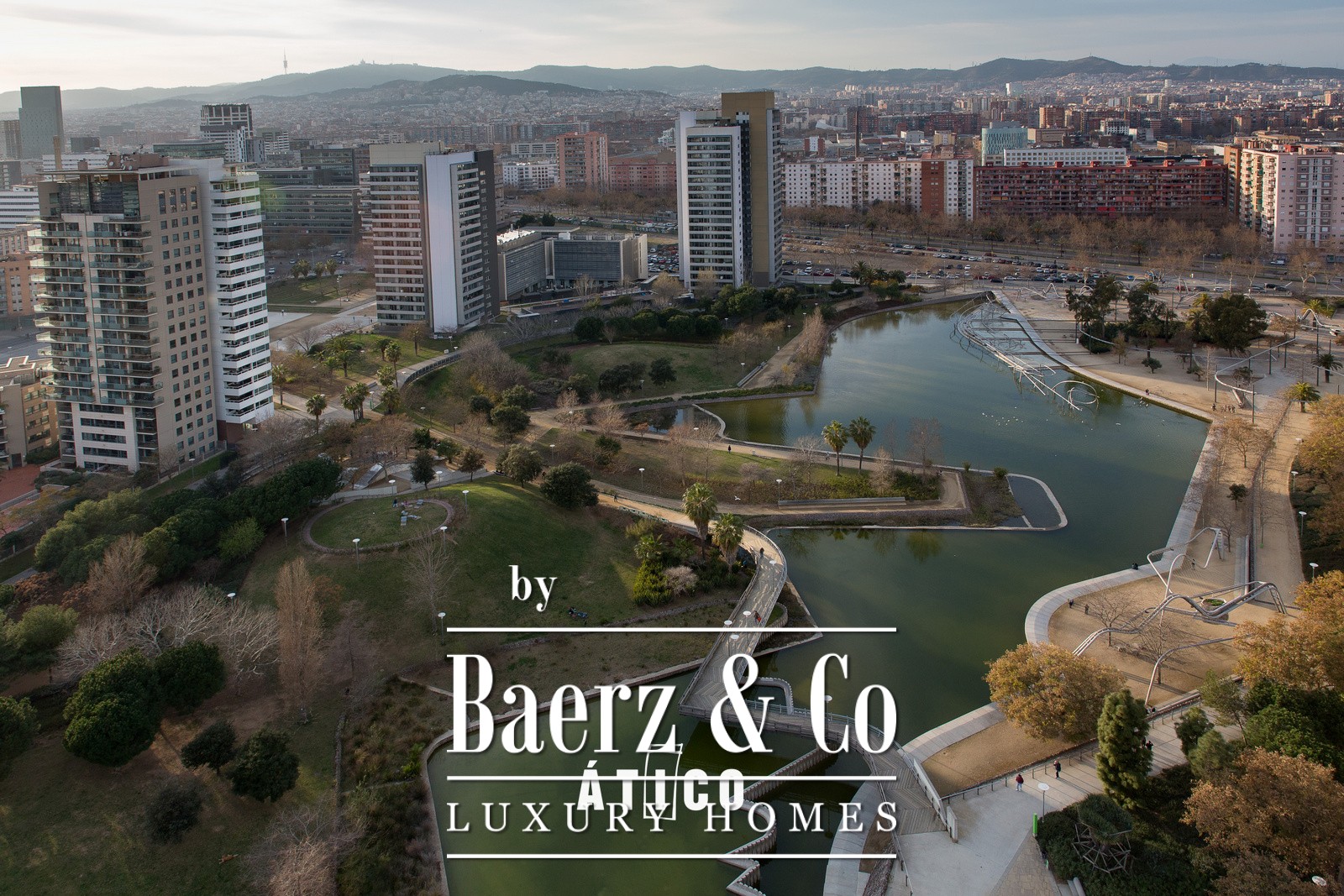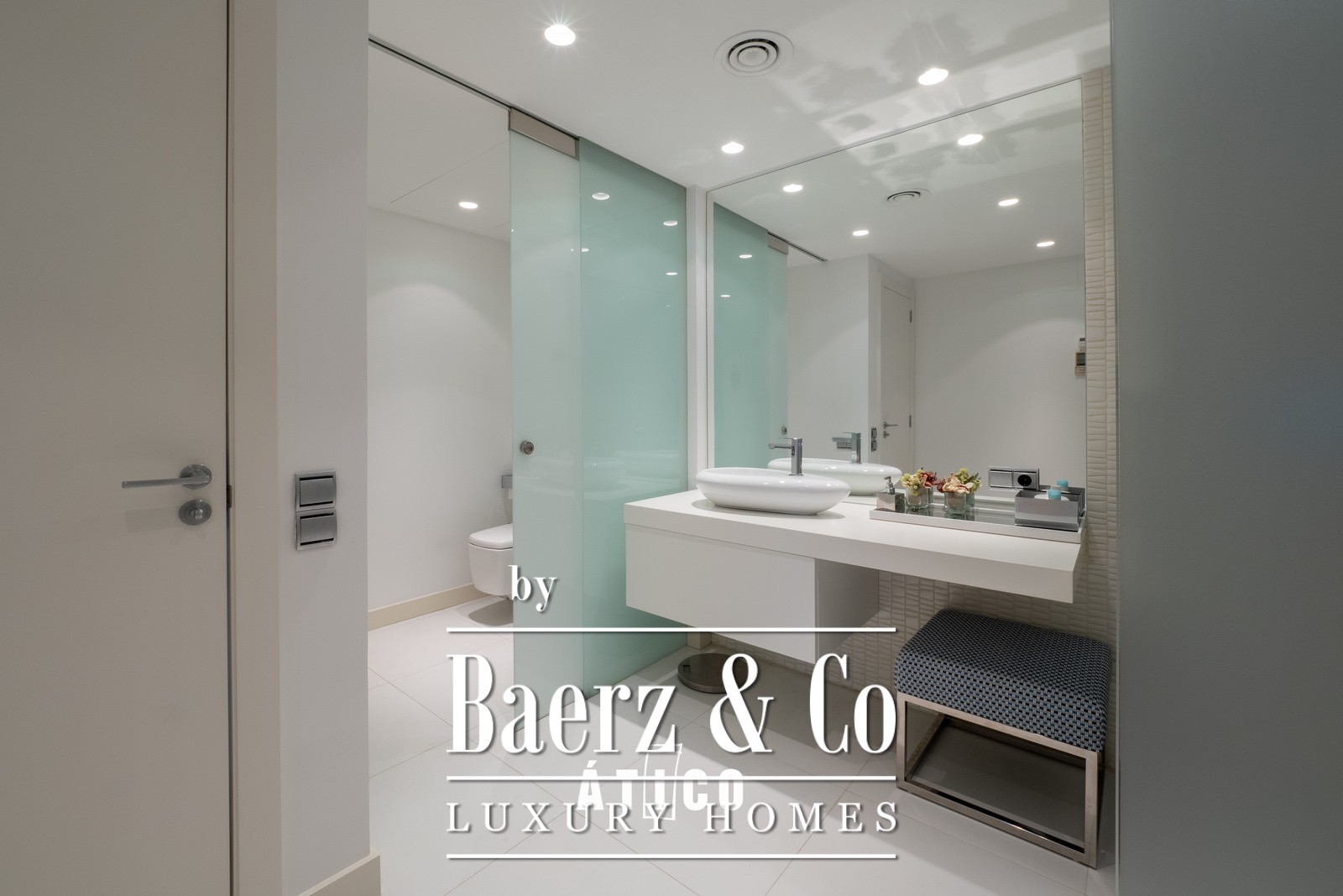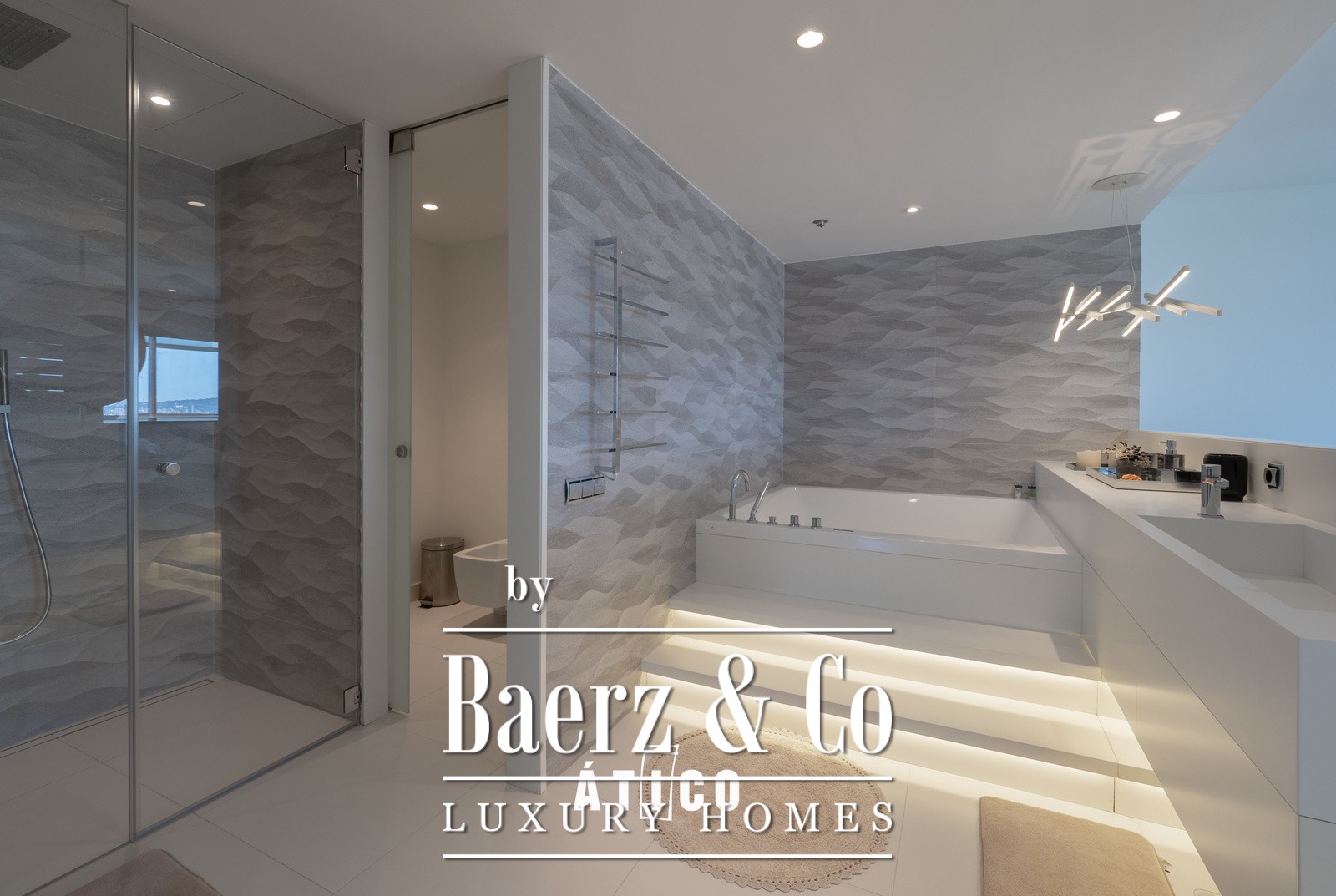 Upon entering, you will be greeted by a bright, open-plan space that maximises the views of the sea and the park with its surrounding waterfalls. The modern and sophisticated design, together with high-quality materials, creates a welcoming and elegant atmosphere. The spacious living room, bathed in natural light thanks to its large windows, offers stunning panoramic views of the vibrant city of Barcelona, ​​as well as access to a terrace that surrounds the entire apartment and features a private pool.