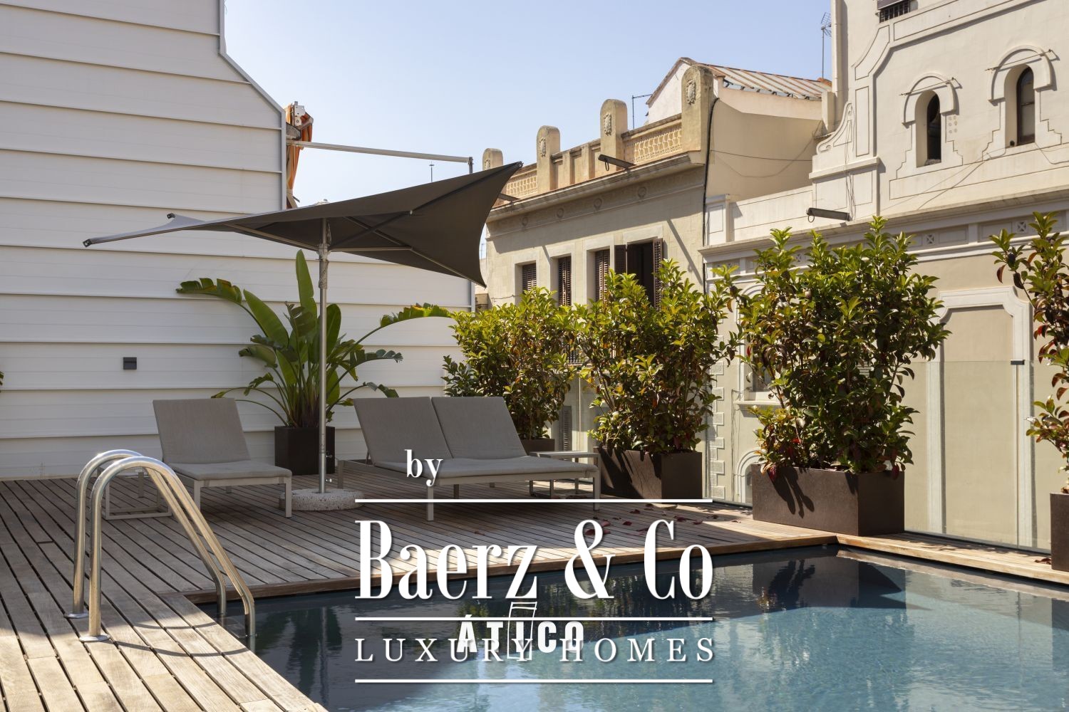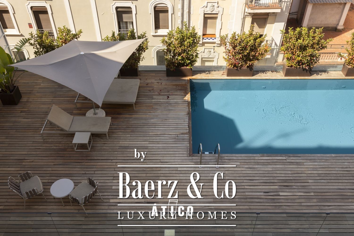 Via stairs from the living room, or directly from the building's elevator with an exclusive access key, we access the jewel of this penthouse, its solarium terrace with a private pool - an urban oasis. It is the perfect place to enjoy the Barcelona climate, have family or friends gatherings, or moments of individual relaxation.