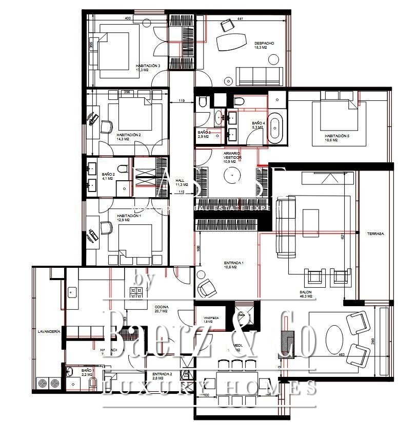 Light defines the experience: all six bedrooms are exterior, and the three winds orientation ensures cross ventilation and sunlight from morning to evening. The 46 m² main living room opens directly onto a private terrace overlooking the garden, while the 16 m² dining room and 20 m² kitchen together shape the daily rhythm of the home. Four bathrooms, a dedicated office, and a master suite with a 10.9 m² dressing room provide space for both privacy and gathering.