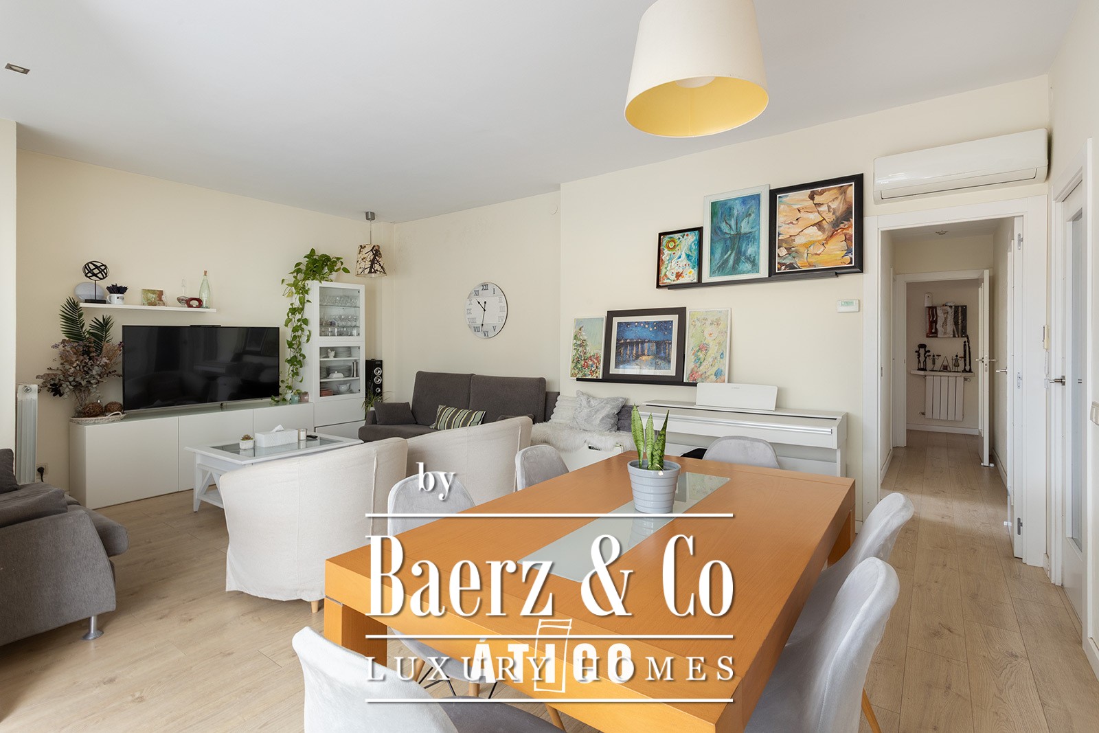 Within, three generously sized bedrooms include one with a walk-in wardrobe, offering both privacy and daily practicality. The large living and dining area flows onto the terrace, amplifying space through natural light and seamless indoor outdoor rhythm. Each room faces outward, ensuring distinguished ventilation and an atmosphere attuned to Barcelona’s gentle climate.