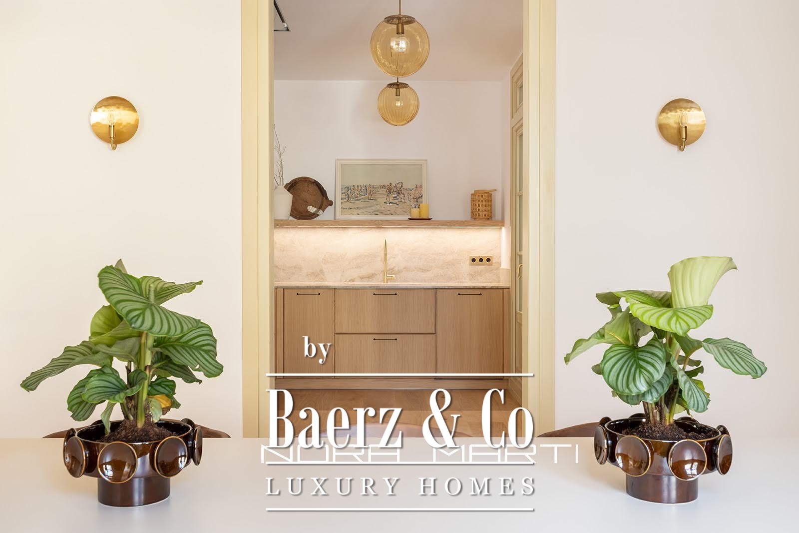 Each of the three exterior bedrooms features double beds, bespoke wardrobes, and en-suite bathrooms finished with aged brass fixtures from a notable Catalan maker. Decorative lighting from Catalonia and England, including vintage and antique pieces, enriches the ambiance. The inviting green terrace offers rare tranquility in Passeig de Sant Joan, presenting opportunities for relaxation, entertaining, and a distinct sense of space in central Barcelona. This luxury apartment for sale in Passeig de Sant Joan combines timeless materials and contemporary comfort in an exceptional urban address.