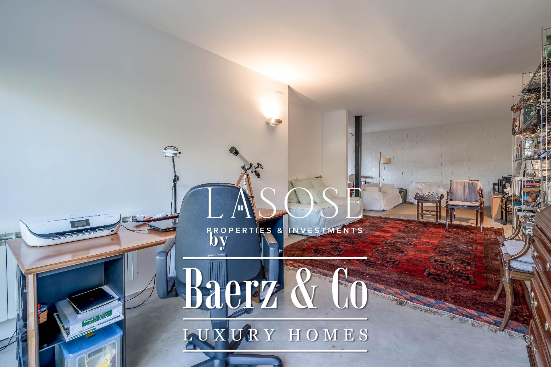 Upstairs, two generous bedrooms are accompanied by a spacious dressing room and a full bathroom. Large windows introduce abundant natural light, paired with parquet underfloor heating for comfort. On the lower floor, a self-contained 115 m² summer apartment includes a dressing room, bathroom, and garden access. Outdoor amenities feature a private pool and landscaped spaces, all within a discreet residential enclave.