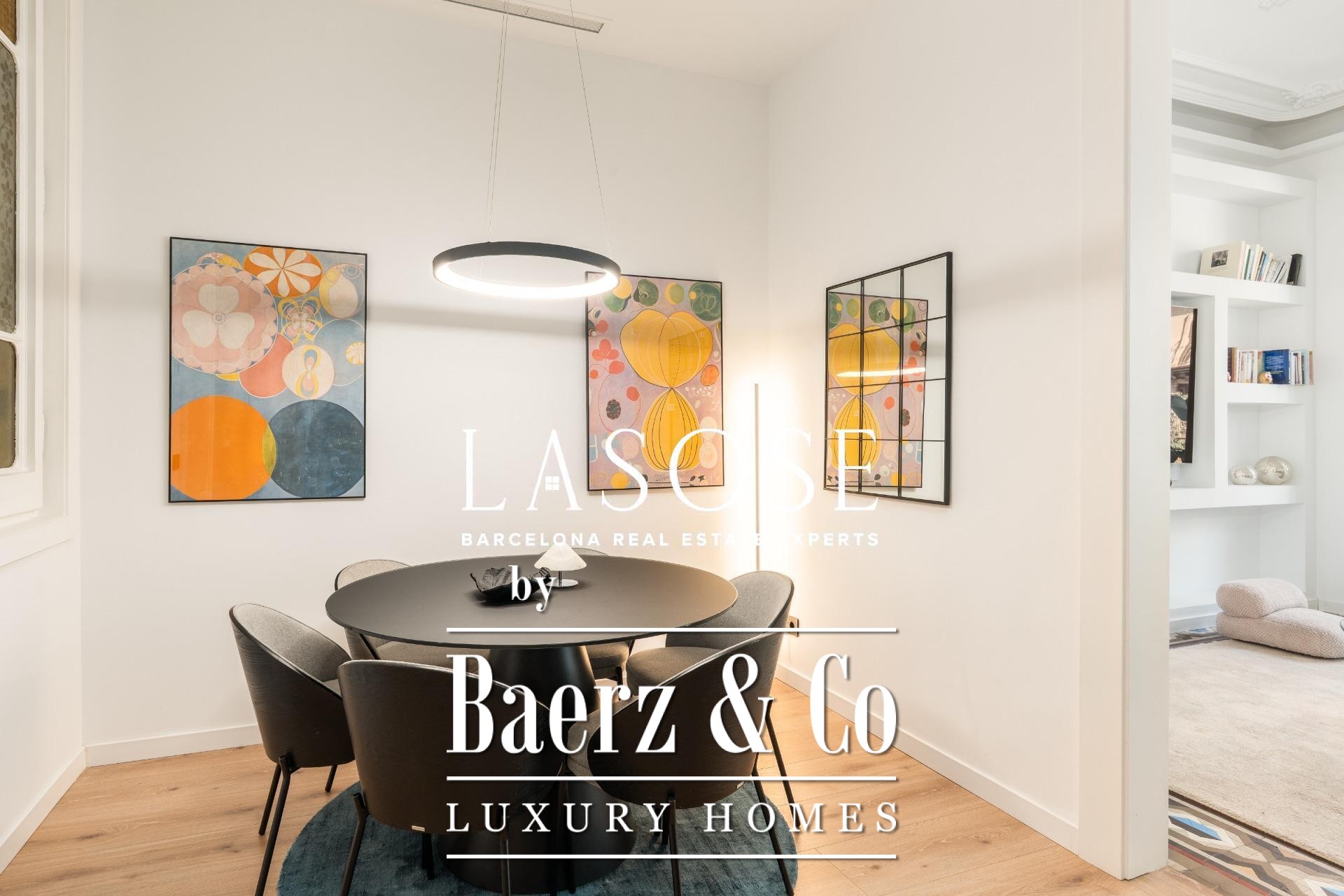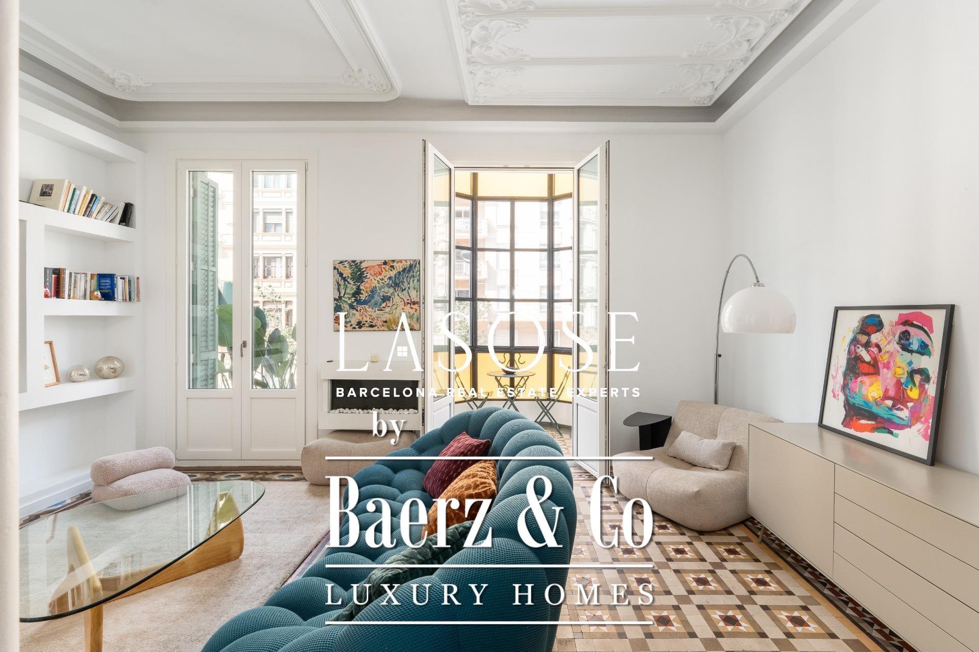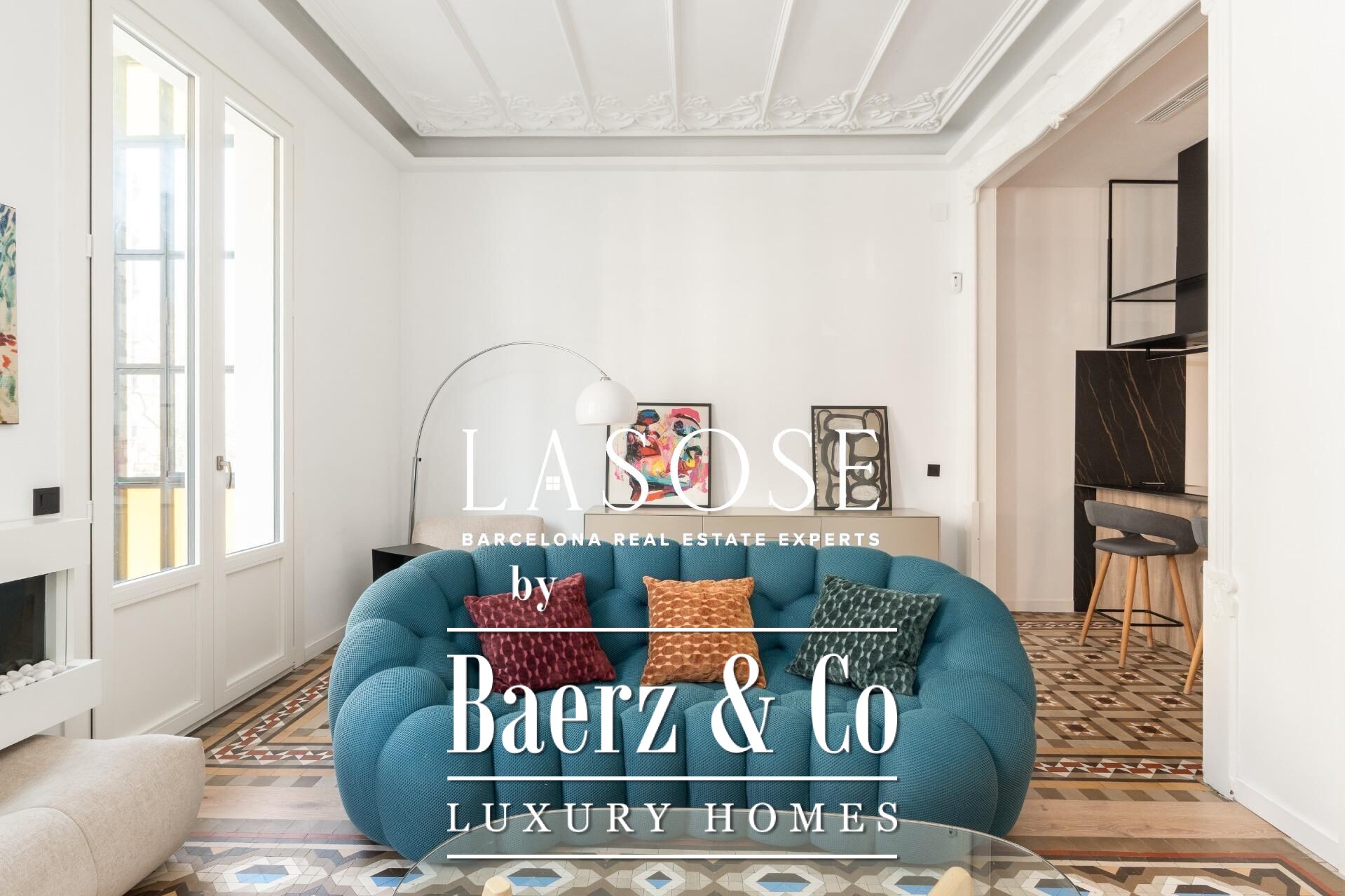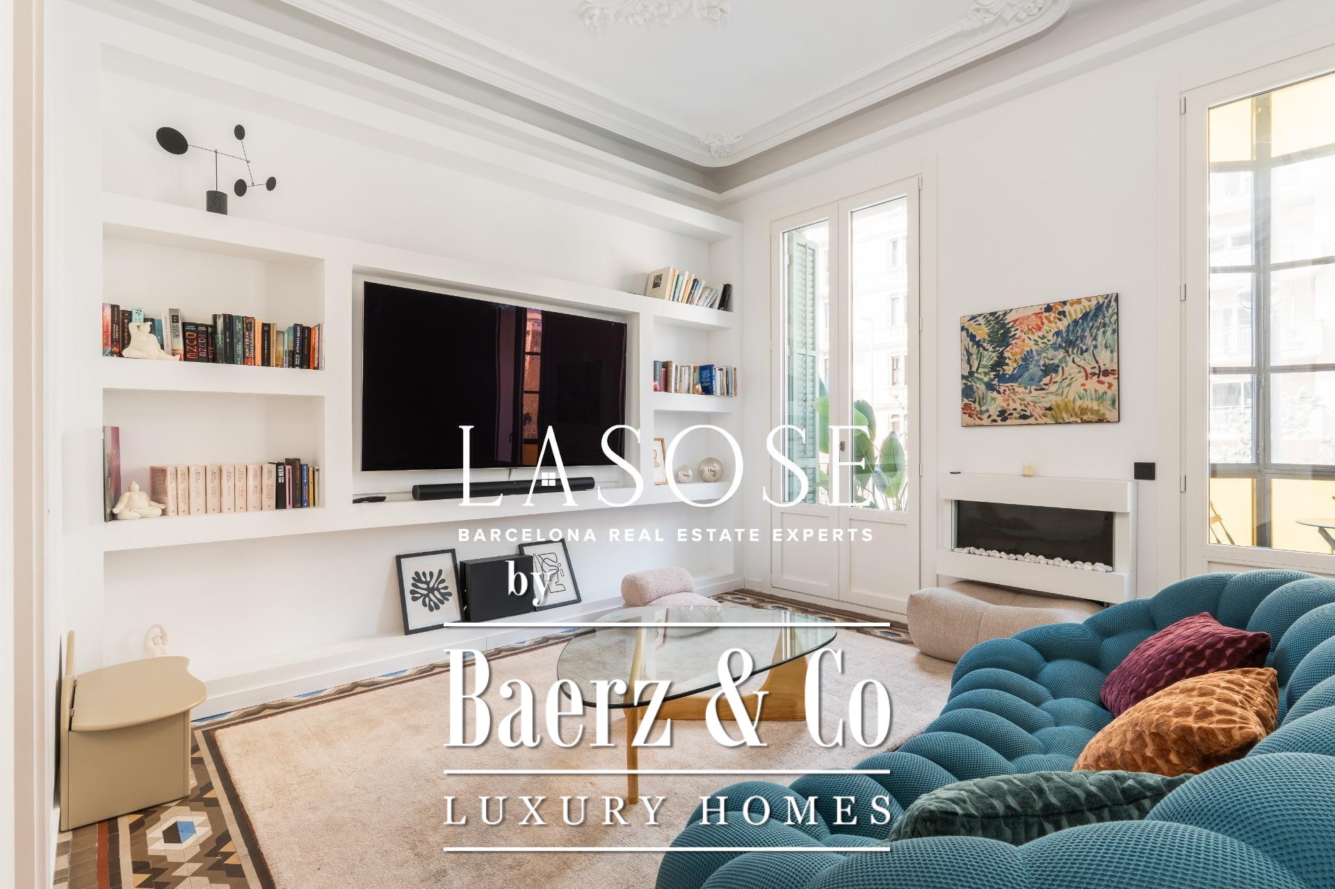 Apartment Barcelona Eixample is quietly positioned on the Principal floor of a protected Modernist building near Passeig de Sant Joan. Completed just two years ago, the most recent renovation blends contemporary luxury with the building’s original charm, highlighting Nolla mosaic hydraulic floors, high ceilings adorned with decorative moldings, and refined architectural details throughout.