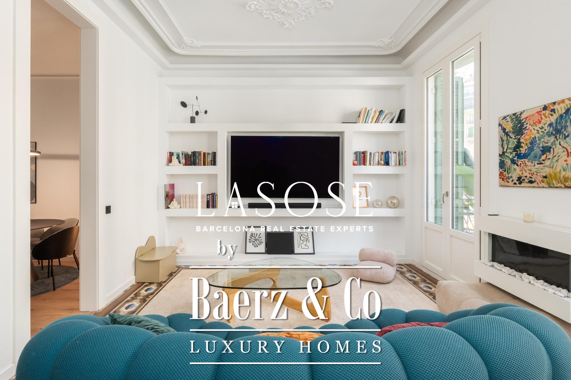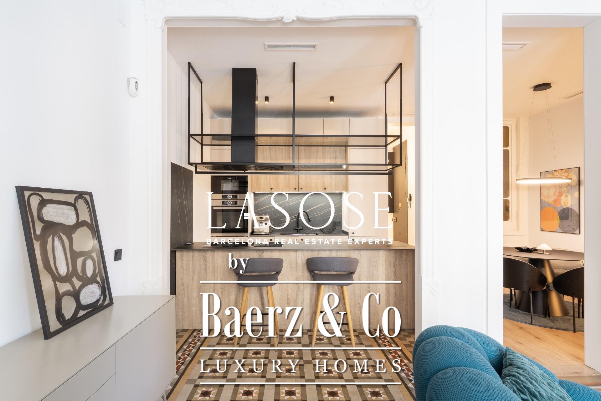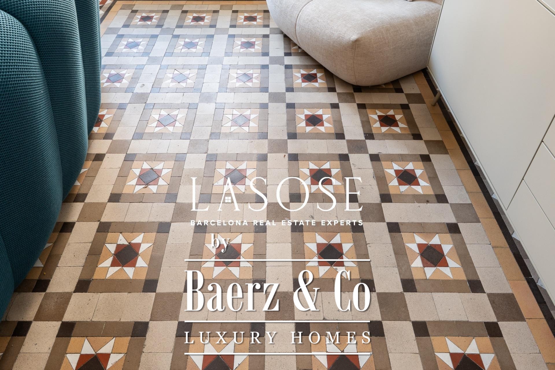 Apartment Barcelona Eixample is quietly positioned on the Principal floor of a protected Modernist building near Passeig de Sant Joan. Completed just two years ago, the most recent renovation blends contemporary luxury with the building’s original charm, highlighting Nolla mosaic hydraulic floors, high ceilings adorned with decorative moldings, and refined architectural details throughout.