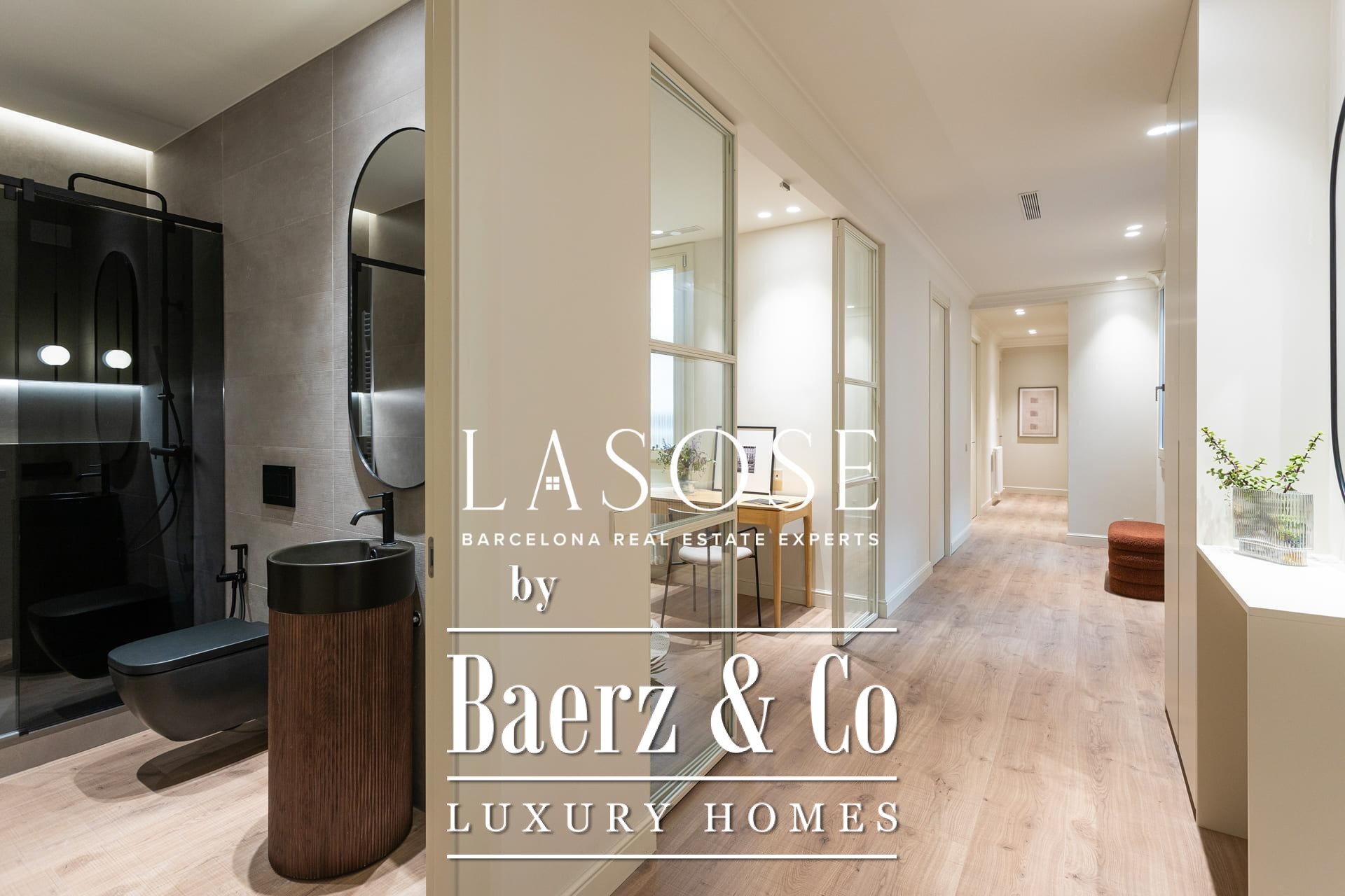 A curated renovation retains the dramatic Catalan vault ceilings and exposed brickwork, lending warmth, history, and authenticity rarely found on the market. The living and dining room blend effortlessly with the designer kitchen, centered around a substantial island, perfect for social gatherings and daily rituals. Two classic balconies bathe the space with east-facing morning light and overlook the stately Roger de Llúria street.