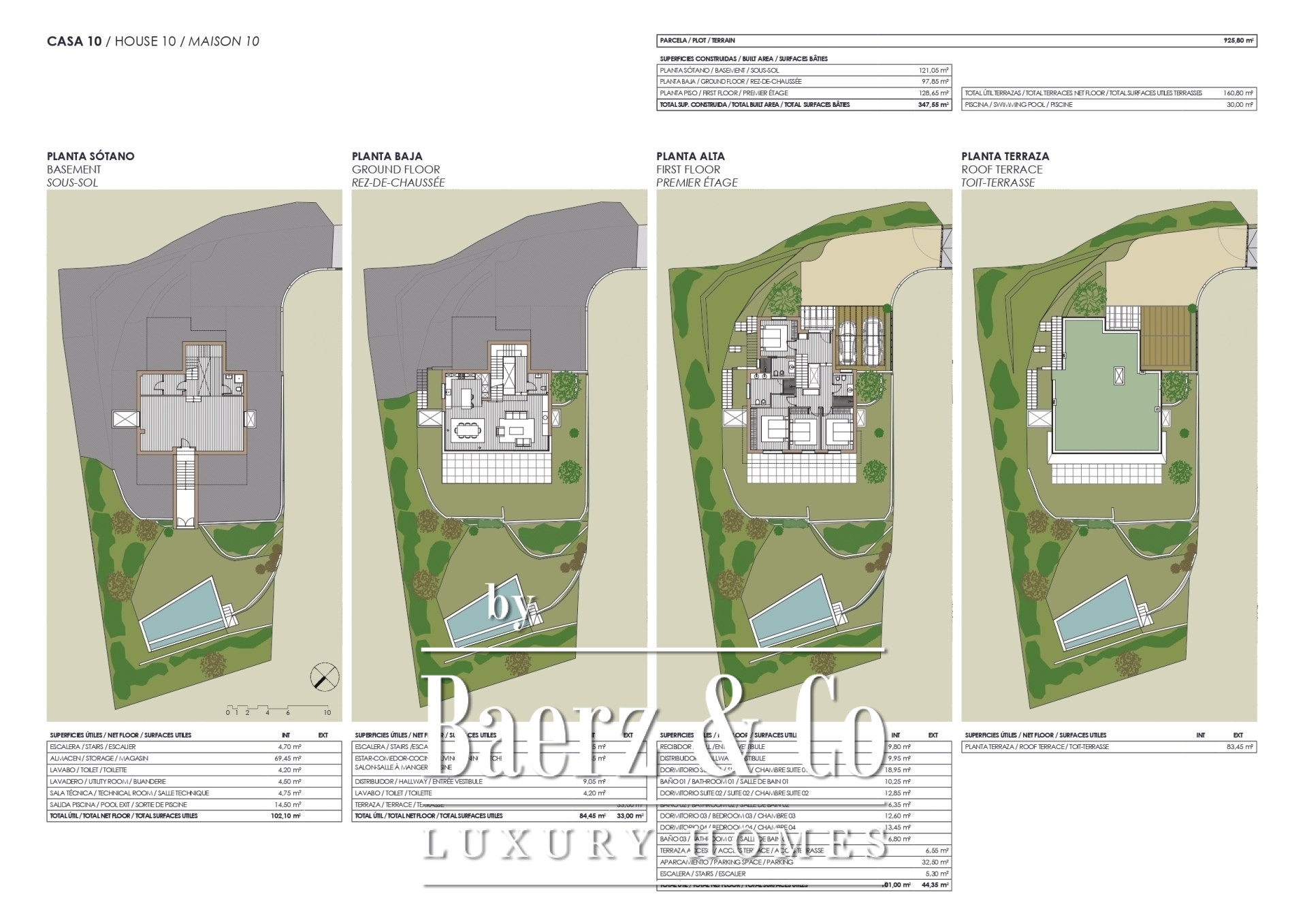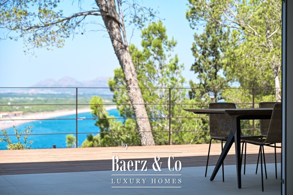 The villa presents 347 m² of living space within a 925 m² plot, including four bedrooms and three bathrooms. Glass-walled interiors invite the outside in, dissolving the boundaries between home and the Mediterranean light. Premium materials and tailored finishes set a serene rhythm throughout, while terraces, a swimming pool, carport, and landscaped garden allow residents to enjoy open-air living in privacy. Security is ensured by an alarm system and gated entrance, while air conditioning and heating deliver year-round comfort.