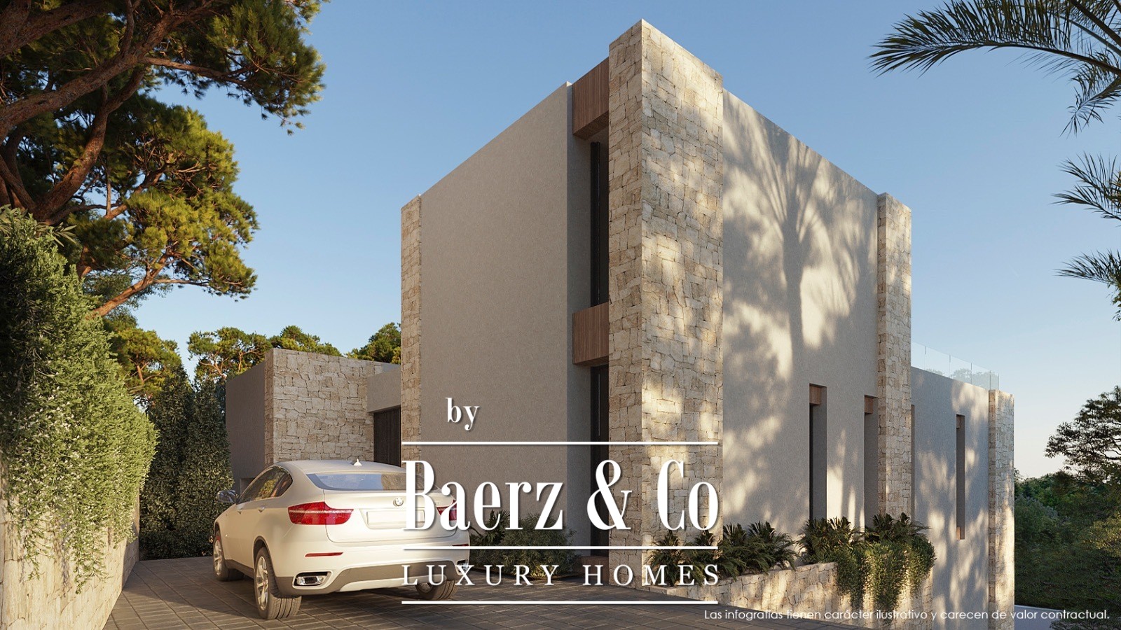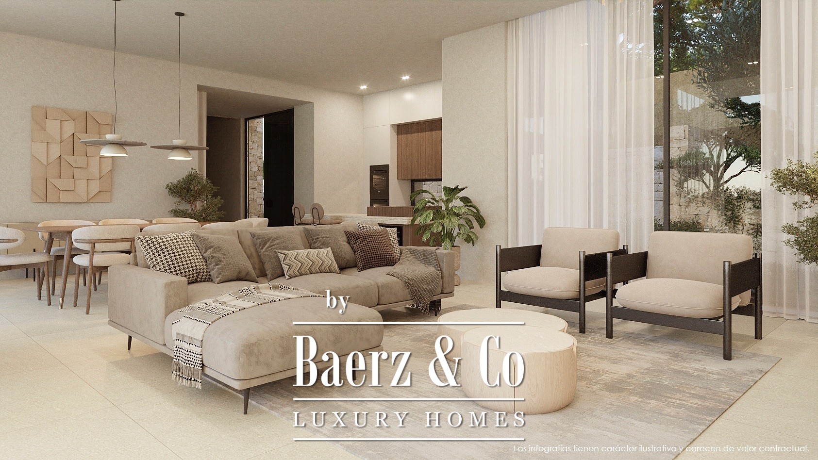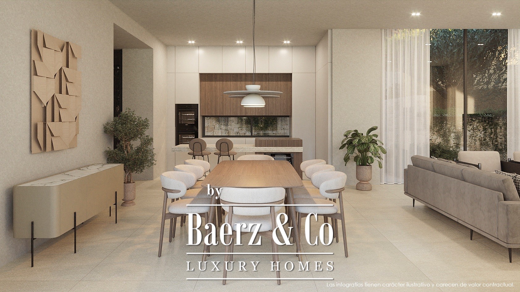 Arranged across three meticulously planned floors, this villa spans a plot of 1,021 m² with a built area of 351 m². Upon arrival, the entry level introduces a considered approach to daily comfort, comprising a garage, laundry, and technical room, all discreetly positioned. On the main floor, the open living, dining, and kitchen zone becomes the gravitational center of the home, where light and space intertwine. Two large bedrooms, each with en-suite bathroom, bring privacy and ease. Glass doors open to the pool and terraces, where covered and open spaces are crafted for both relaxation and entertaining, seamlessly embracing the Spanish climate.