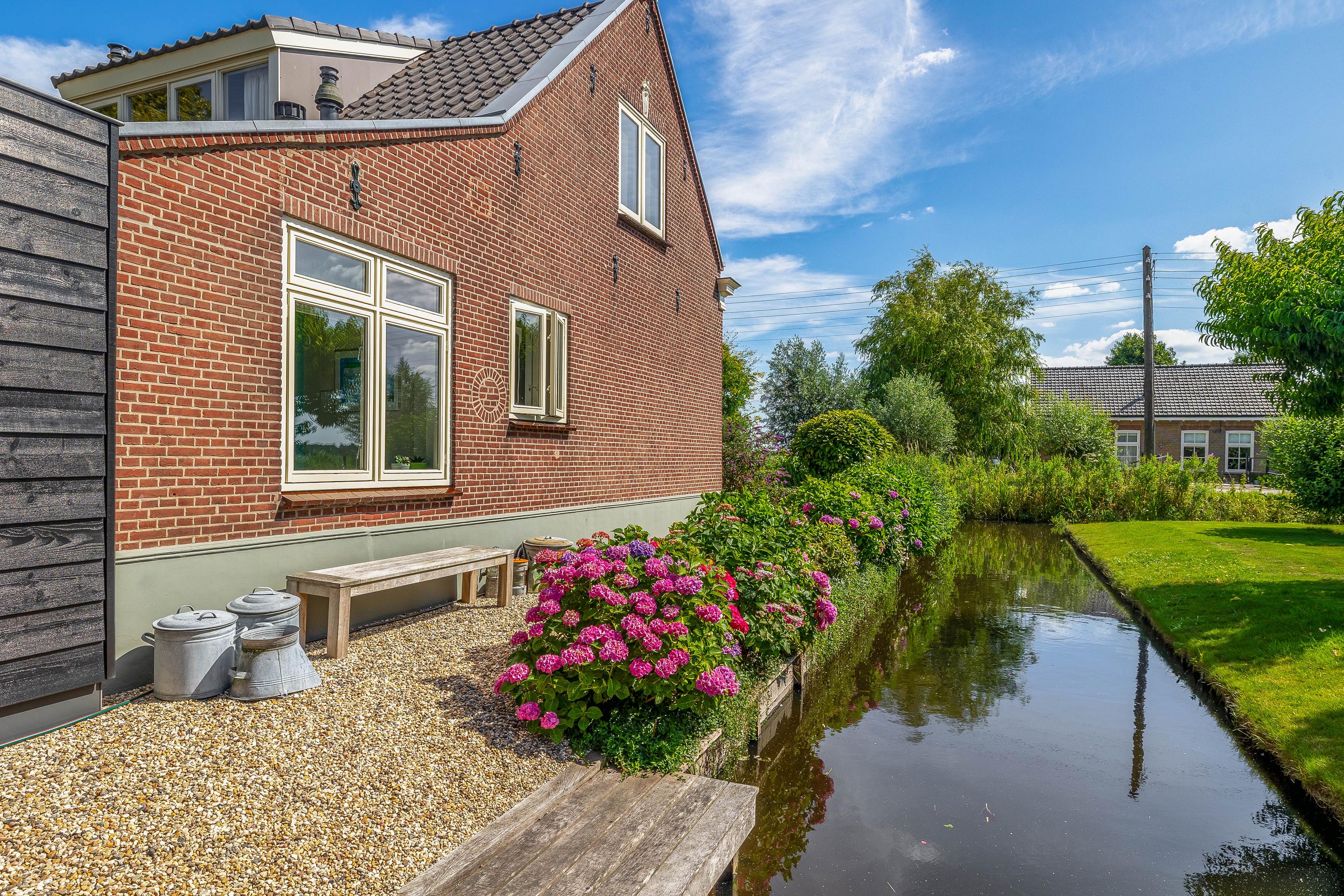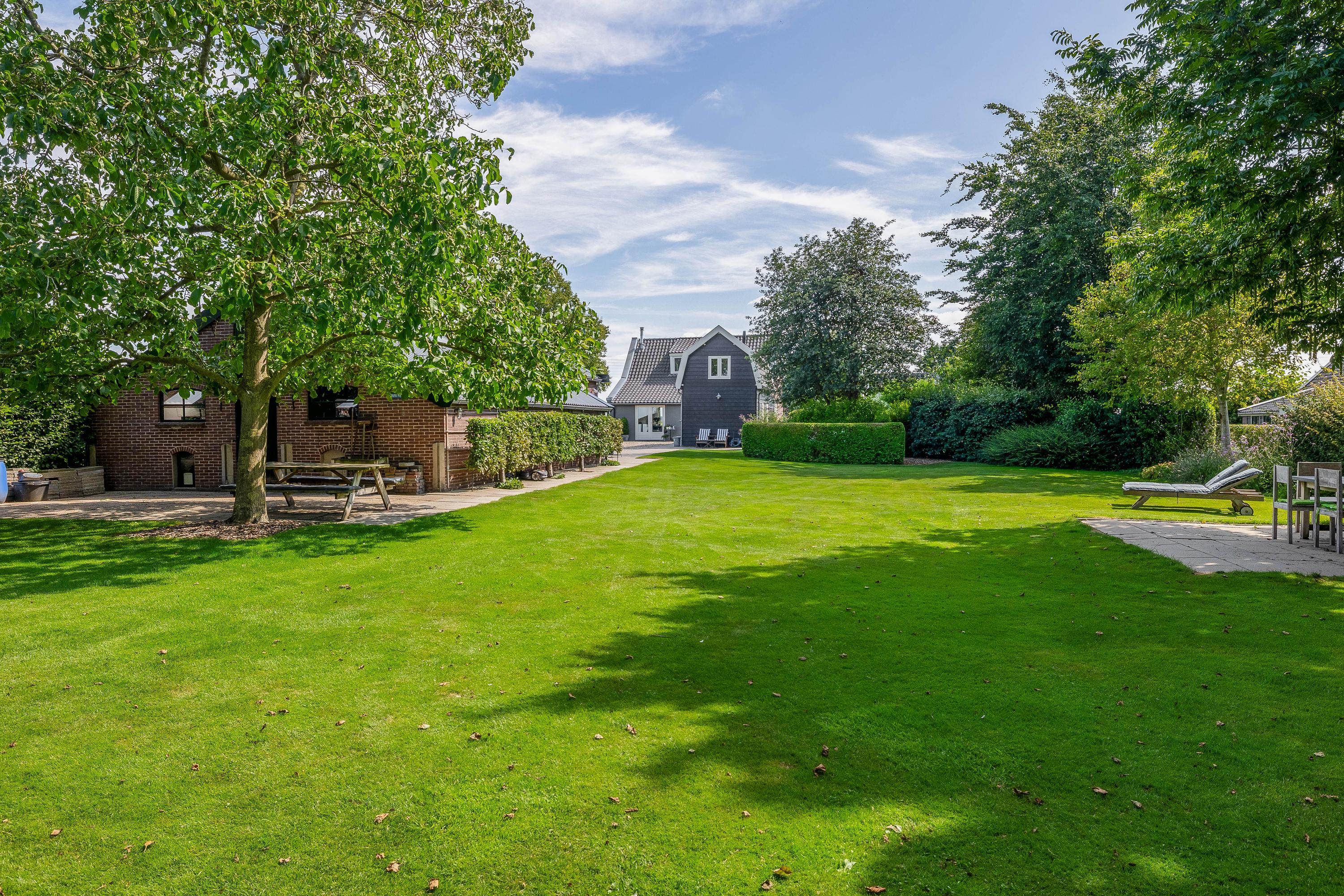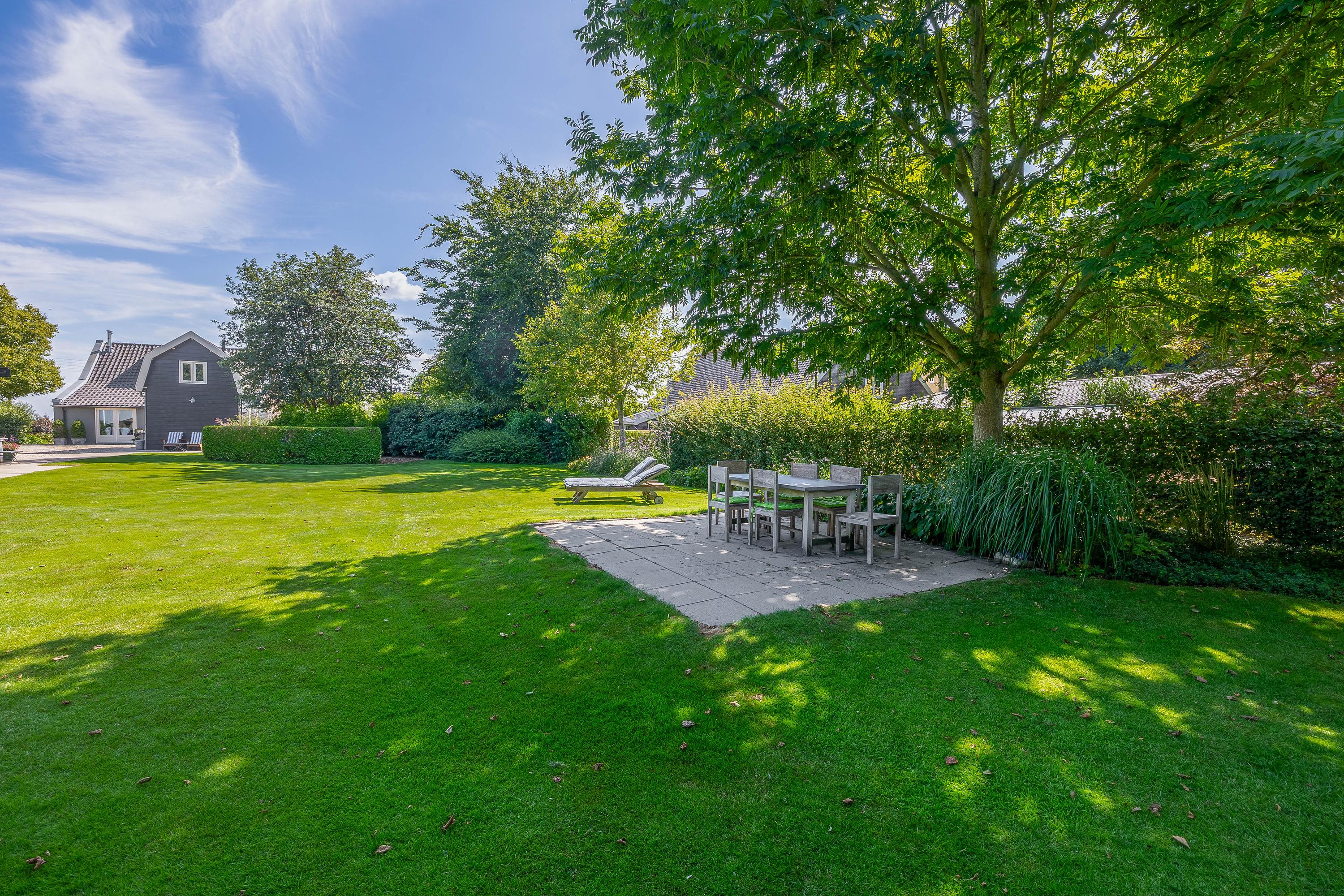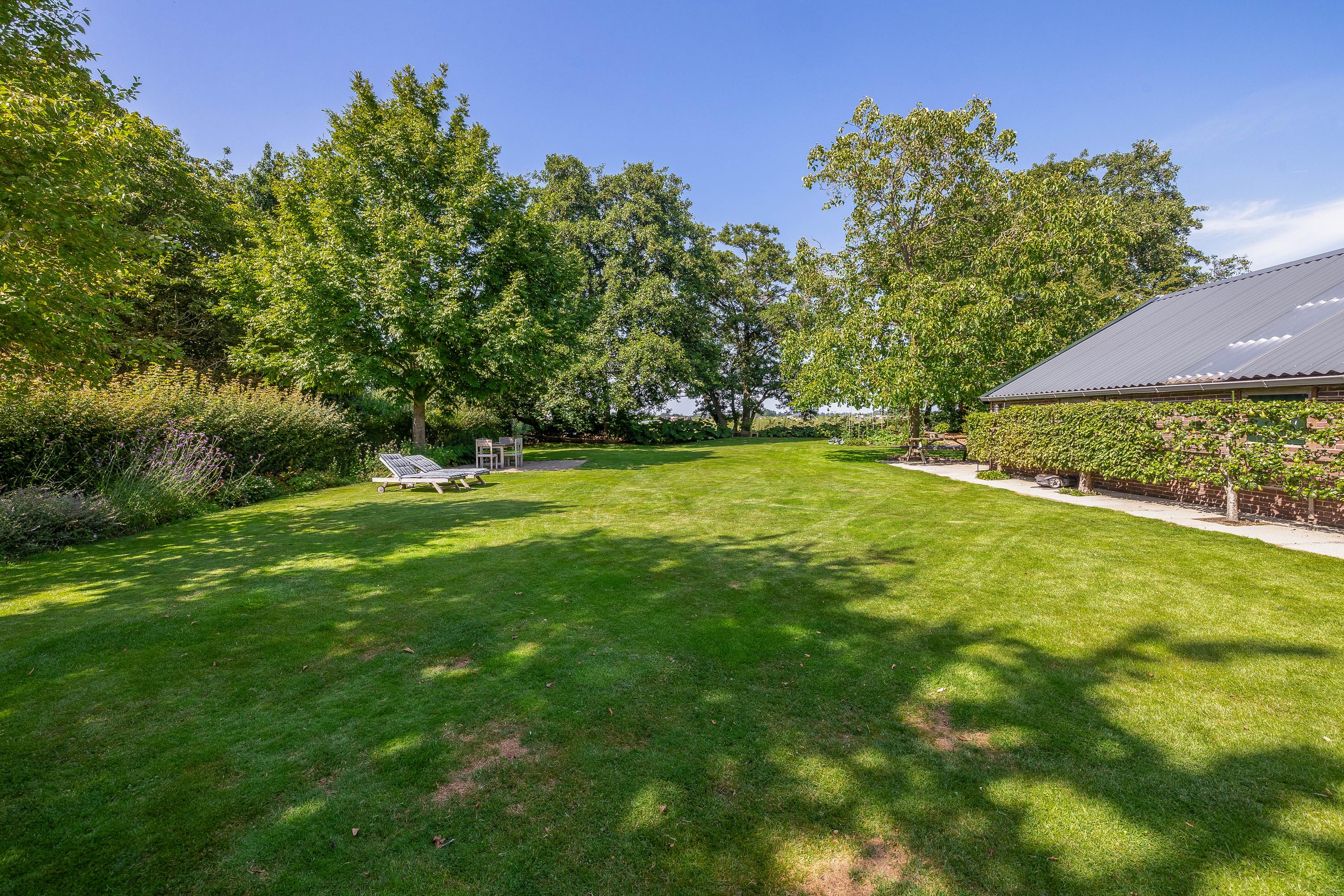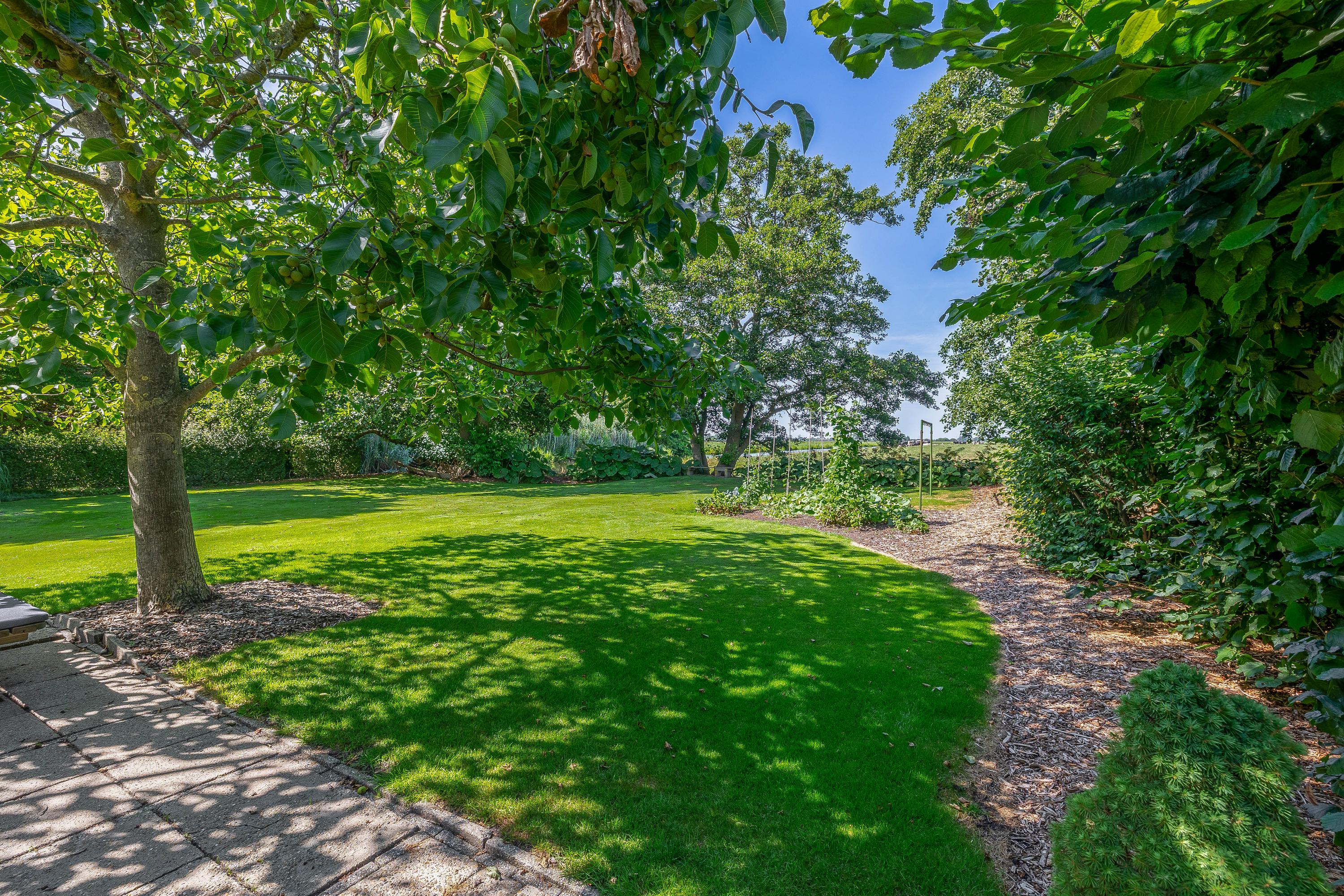 Outside, the property is an oasis of peace and quiet. The surrounding garden is neatly landscaped, green and well maintained, with several seating areas, large lawns, trees, borders, a vegetable garden and charming corners. Thanks to the position of the plot, there are no immediate neighbours, offering plenty of privacy and beautiful views over water and meadowland. The meadow on the eastern side may no longer be built on, ensuring unobstructed views well into the future.