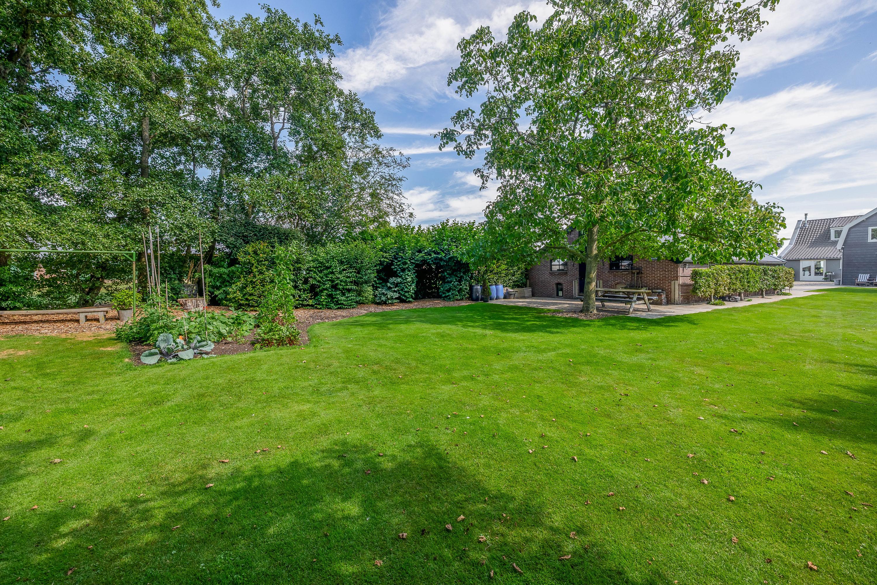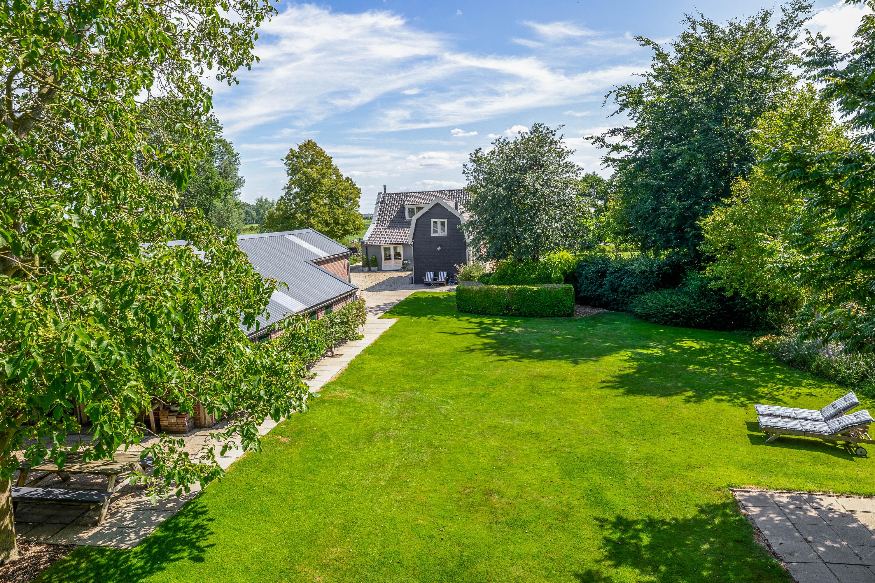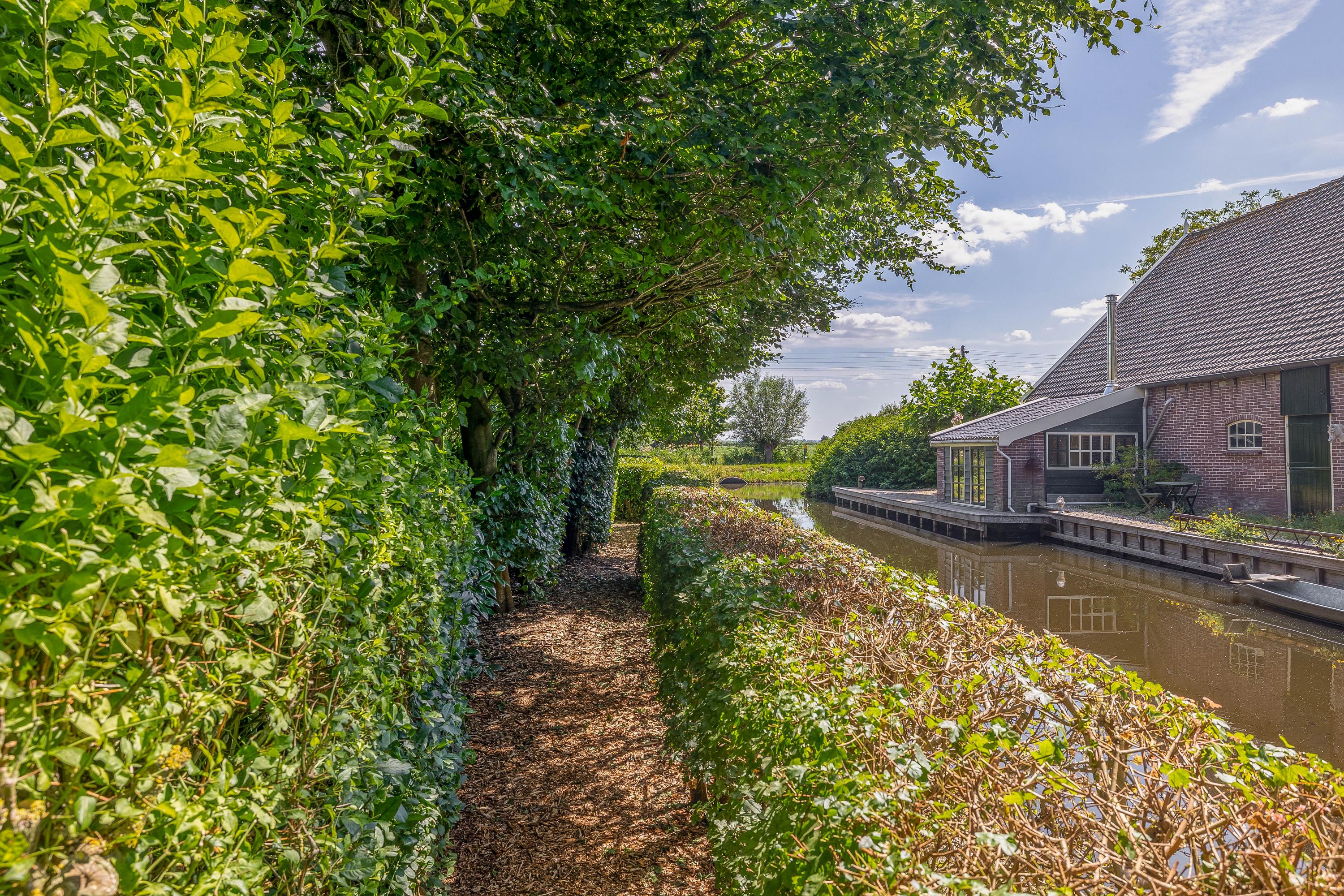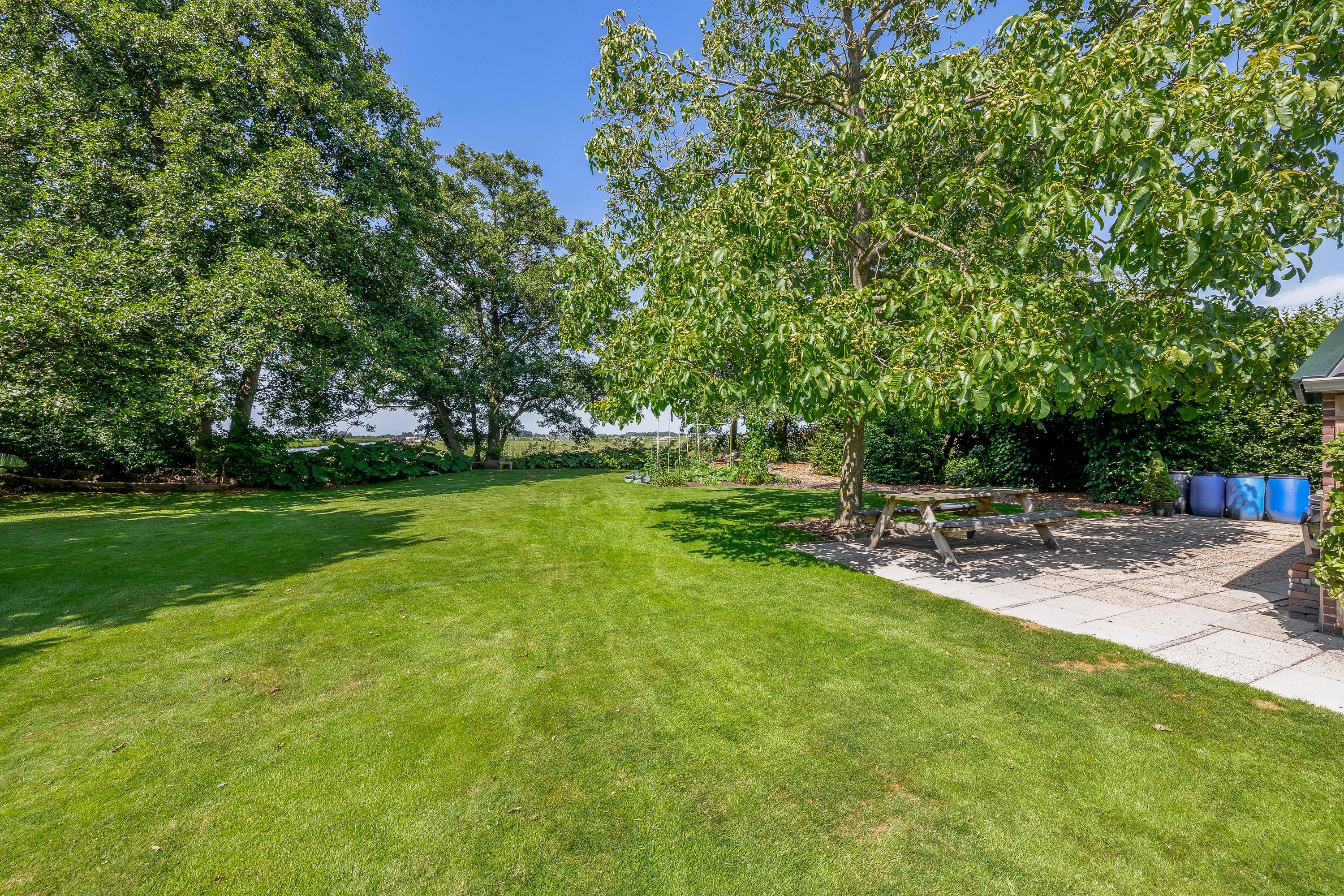 Outside, the property is an oasis of peace and quiet. The surrounding garden is neatly landscaped, green and well maintained, with several seating areas, large lawns, trees, borders, a vegetable garden and charming corners. Thanks to the position of the plot, there are no immediate neighbours, offering plenty of privacy and beautiful views over water and meadowland. The meadow on the eastern side may no longer be built on, ensuring unobstructed views well into the future.