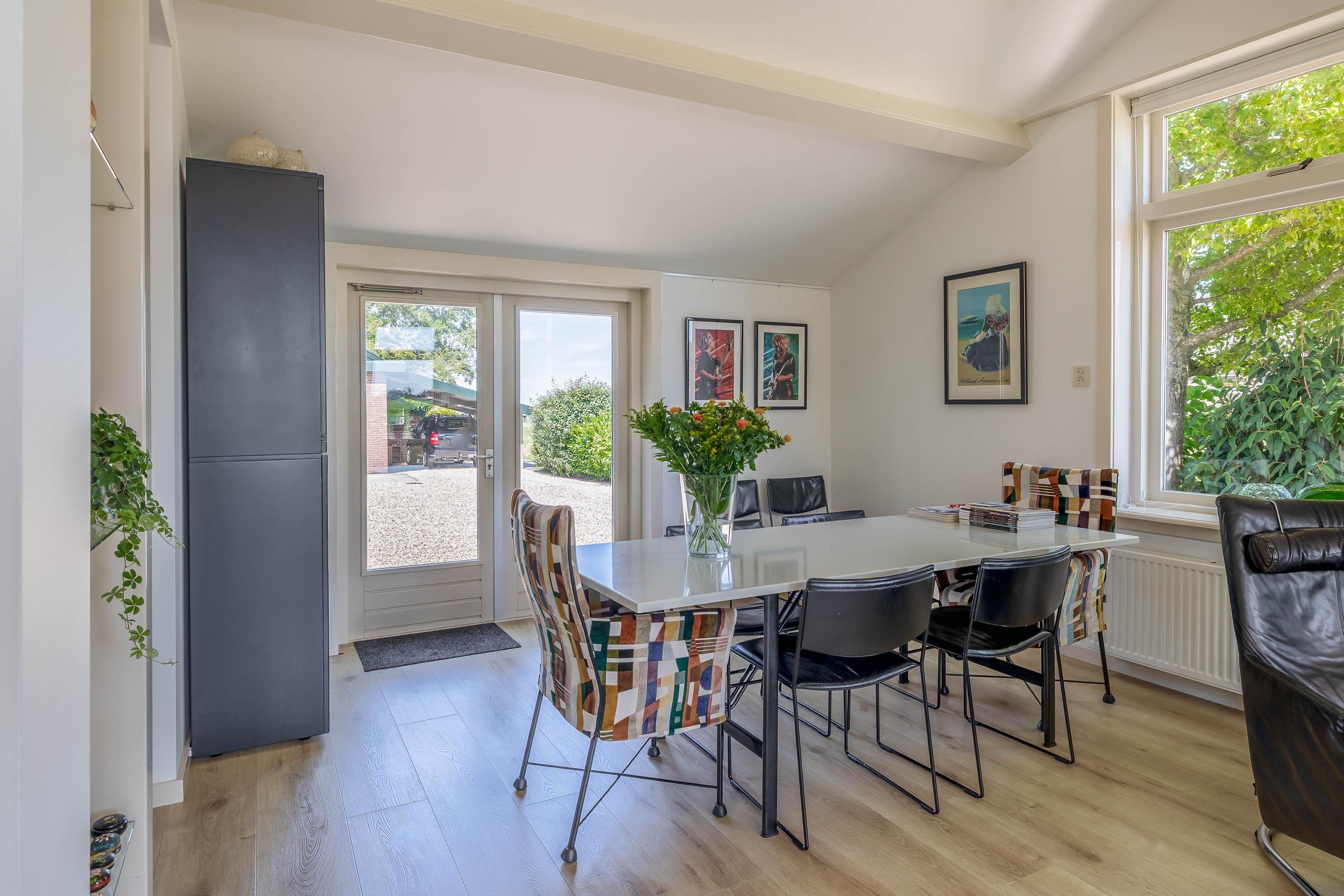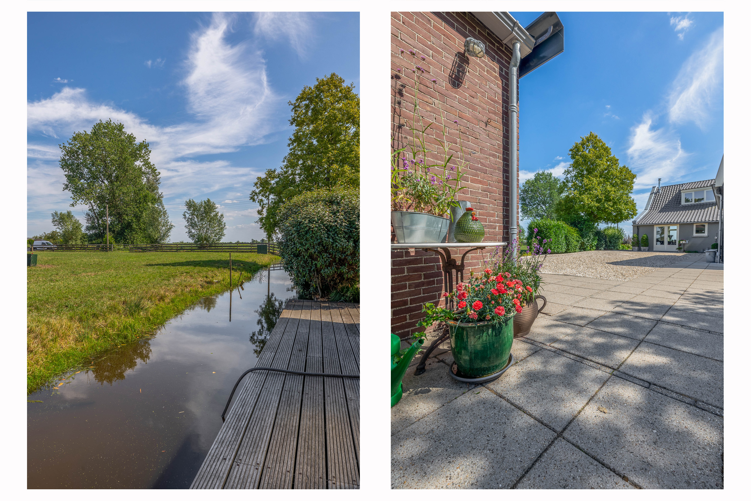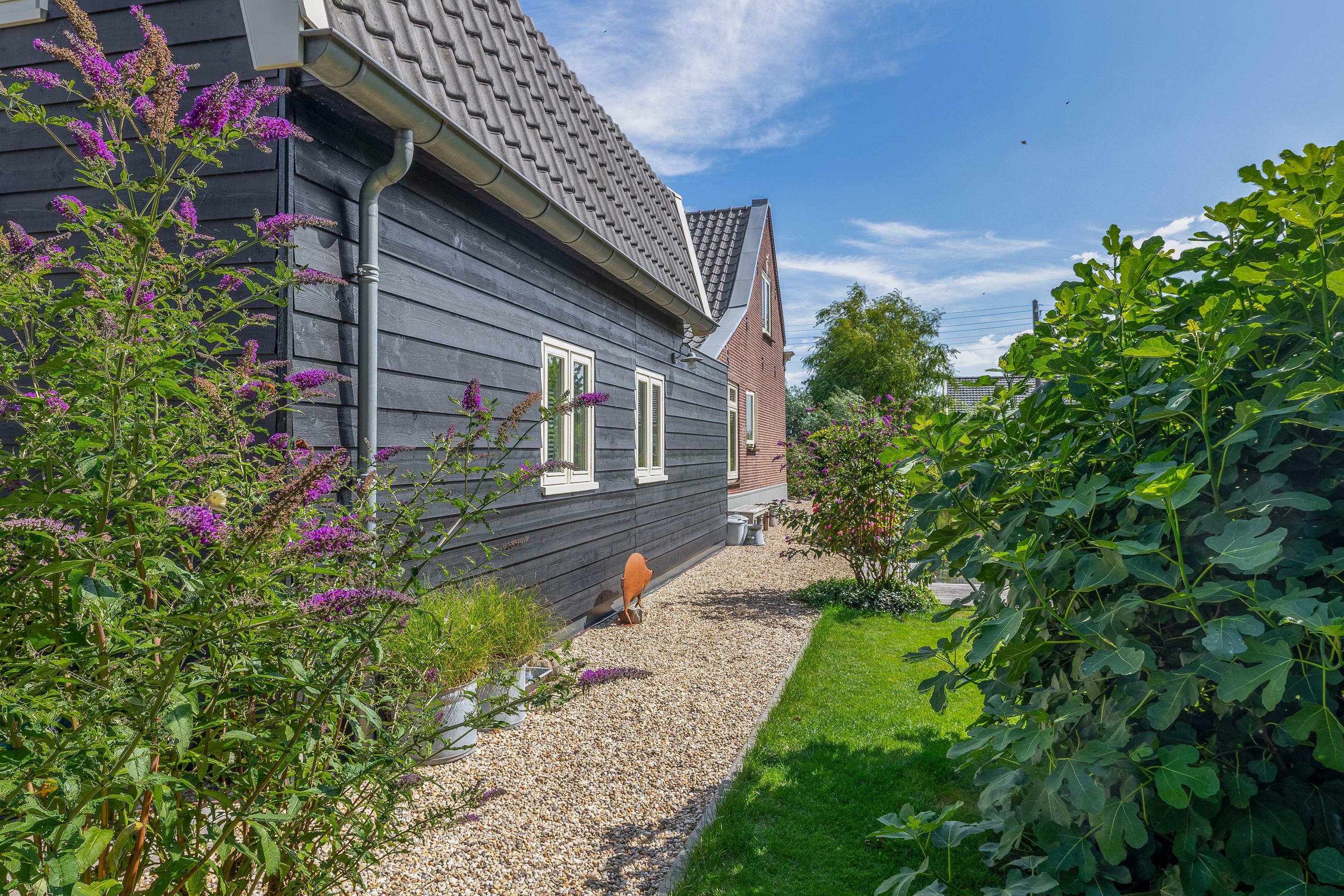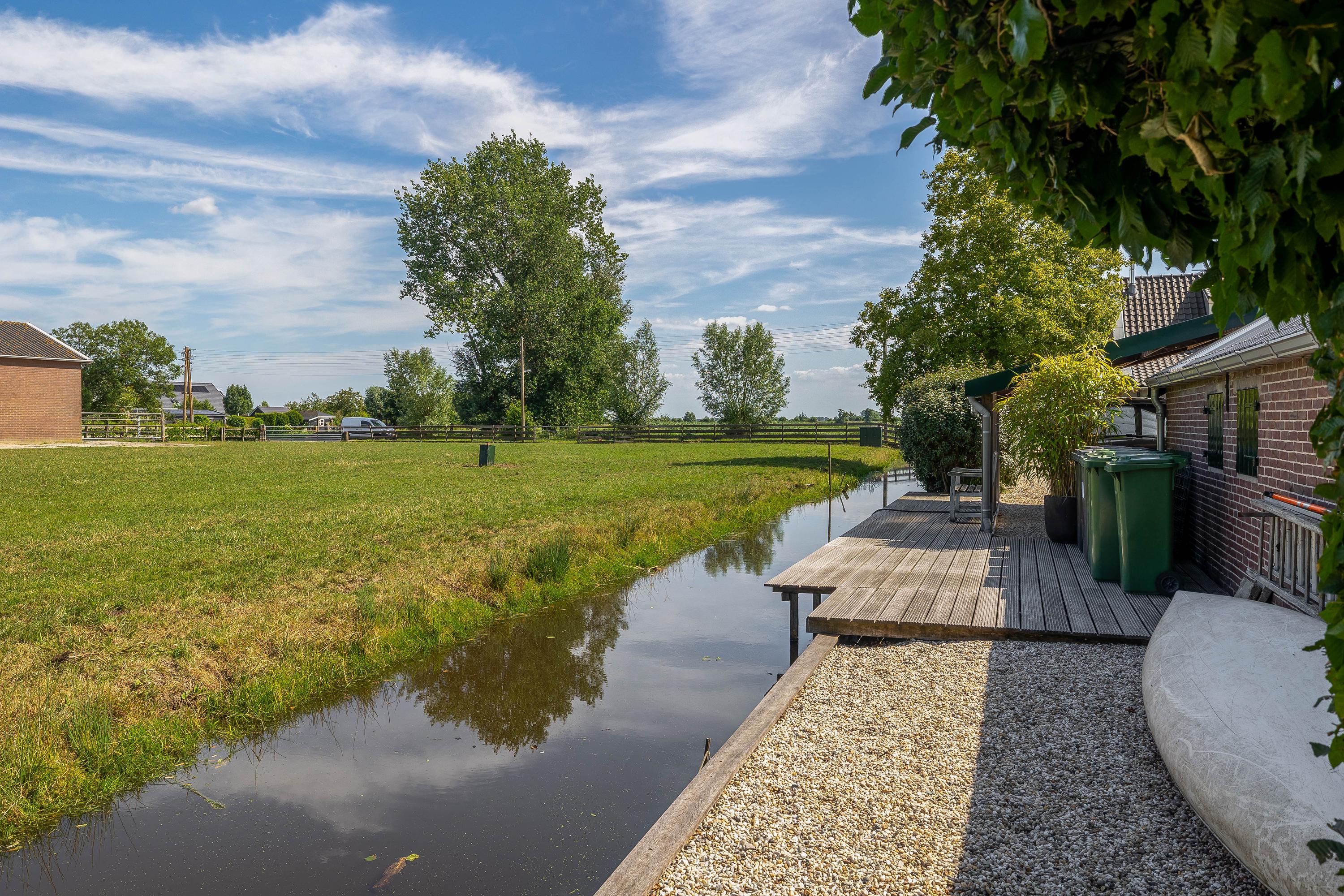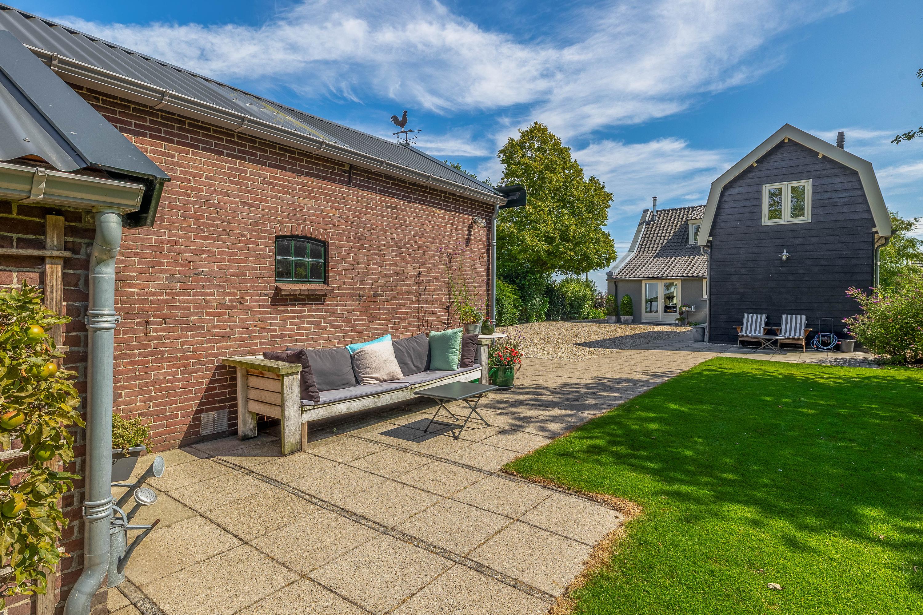 Outside, the property is an oasis of peace and quiet. The surrounding garden is neatly landscaped, green and well maintained, with several seating areas, large lawns, trees, borders, a vegetable garden and charming corners. Thanks to the position of the plot, there are no immediate neighbours, offering plenty of privacy and beautiful views over water and meadowland. The meadow on the eastern side may no longer be built on, ensuring unobstructed views well into the future.