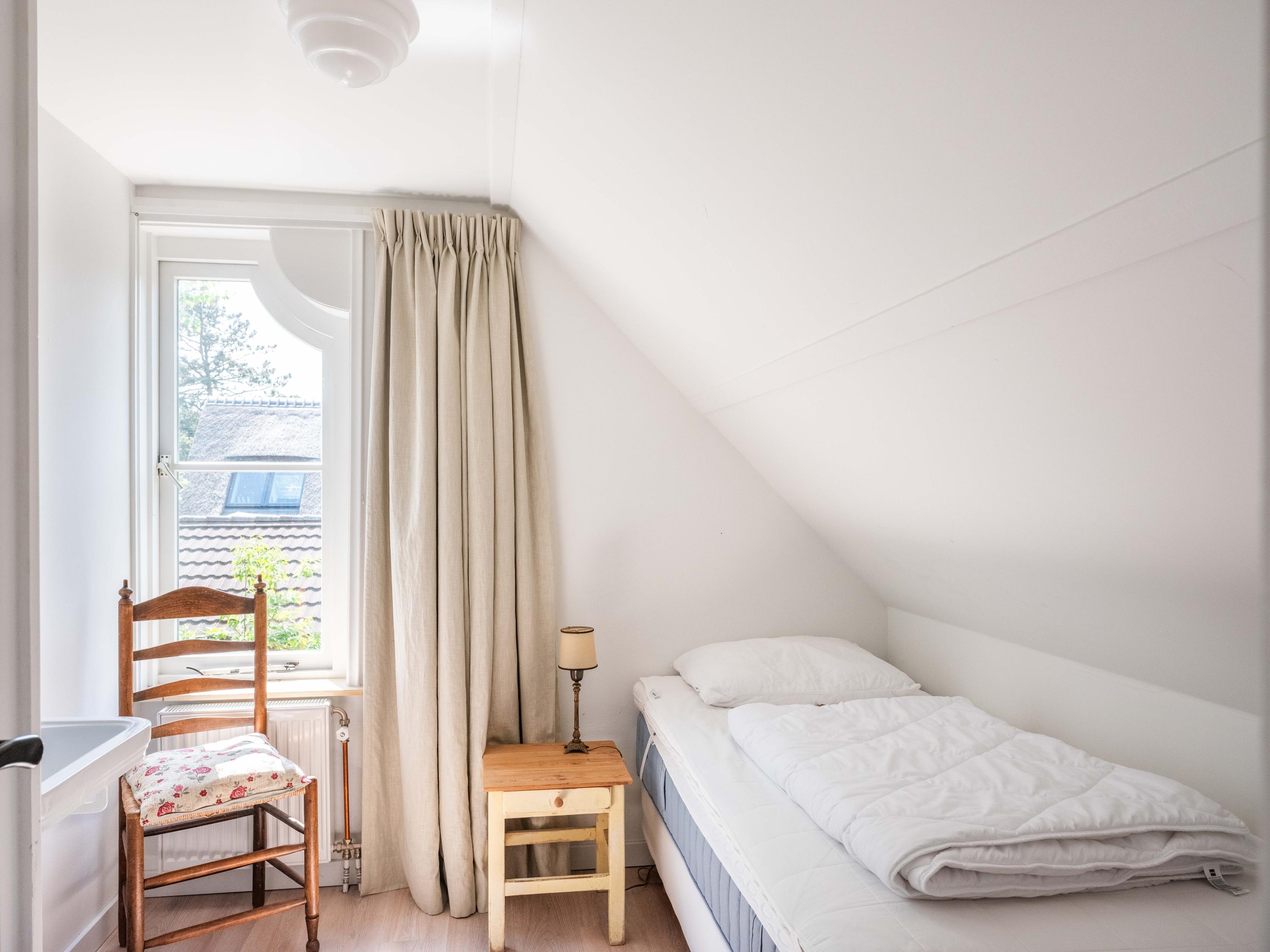 The first floor has three bedrooms, each with a washbasin and built-in wardrobe. Thanks to several dormer windows, there is plenty of light and space. There is a separate central heating cupboard and a second bathroom with a bath, shower, toilet, skylight and mechanical ventilation. From the landing, a small dormer window offers a view of the coast.