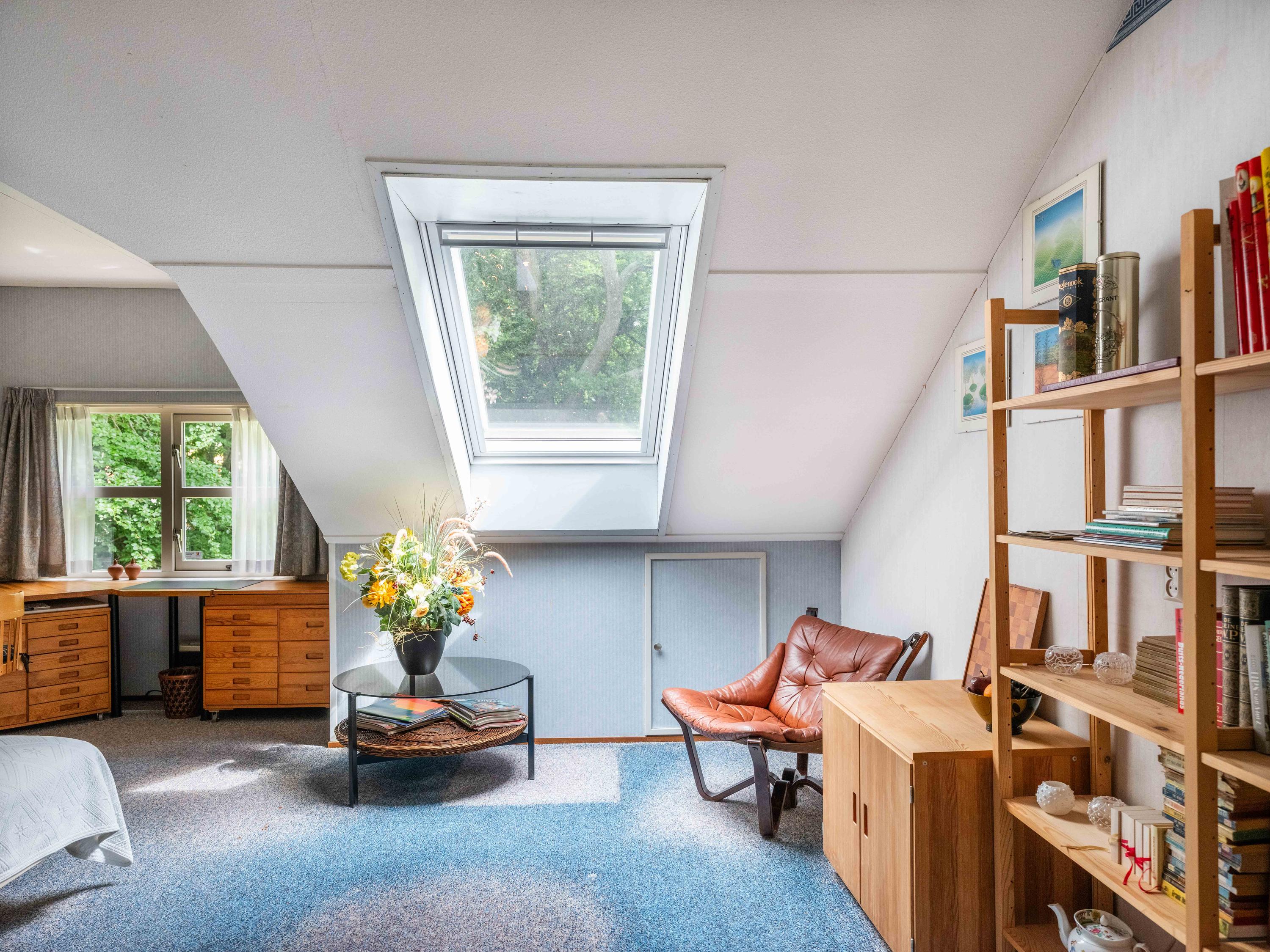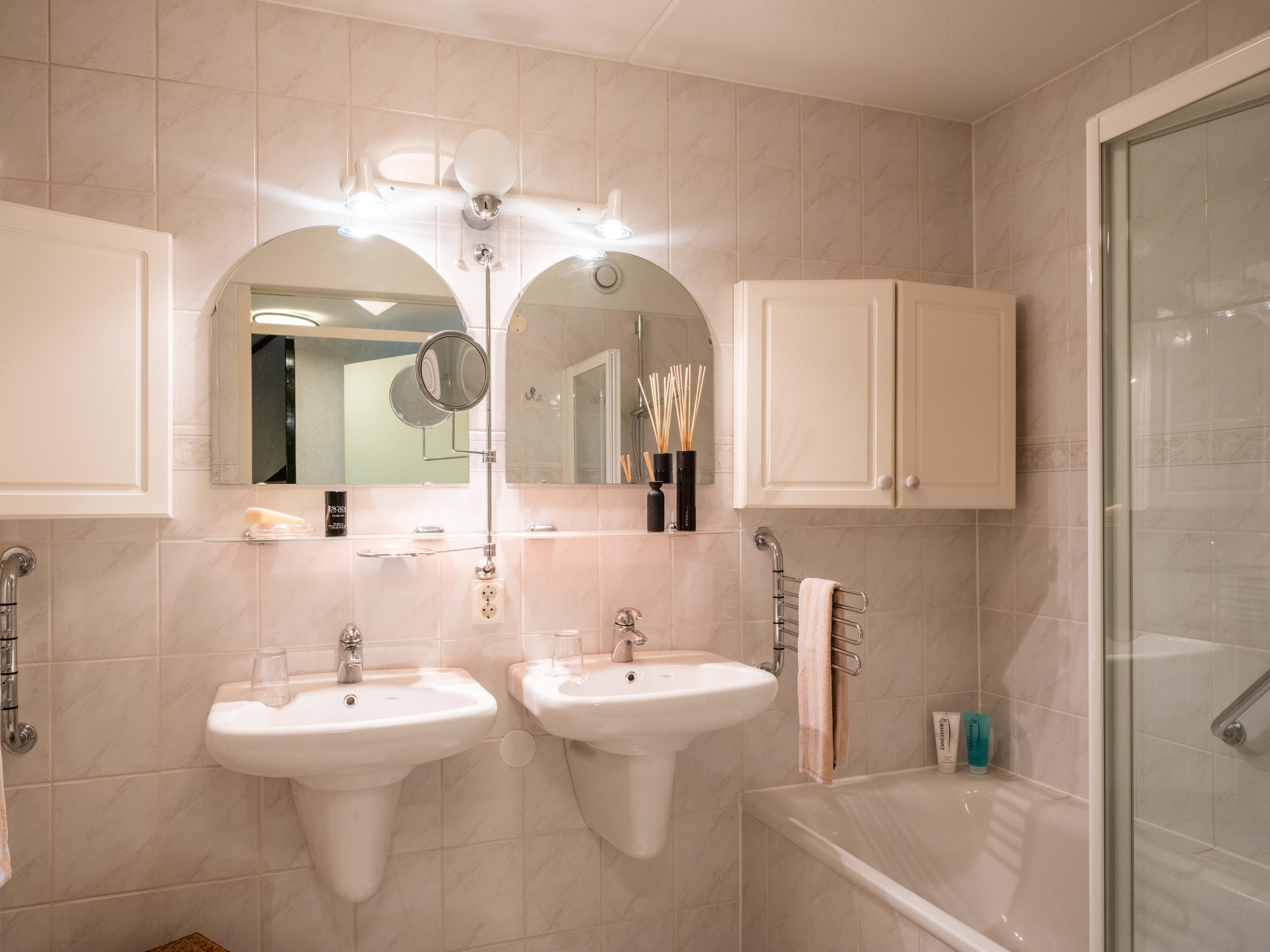 On the ground floor, you will also find a spacious room on the garden side, which can be used as an office, but is also ideal as a bedroom. The bathroom on the ground floor has a bathtub with shower, double sink, and toilet.