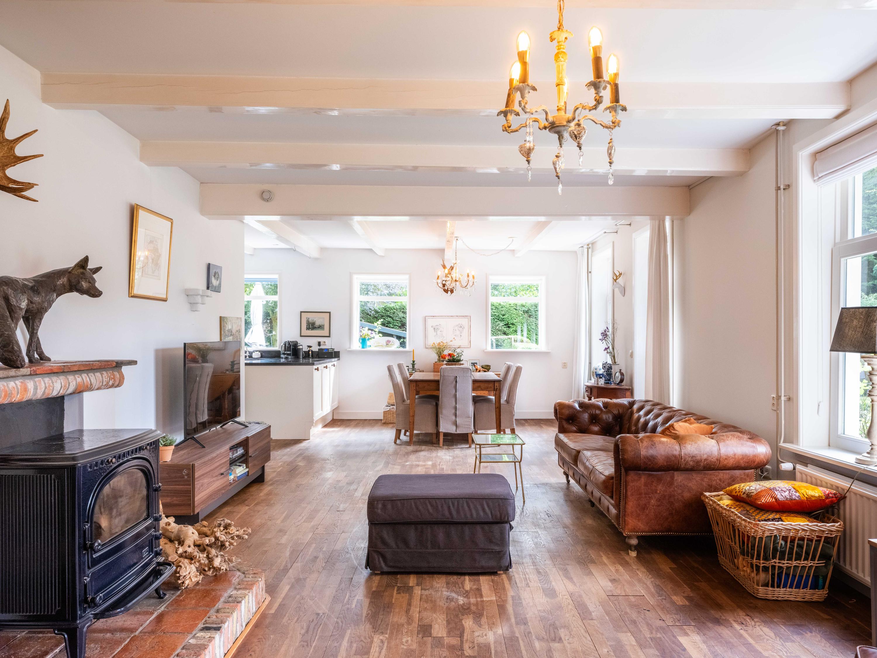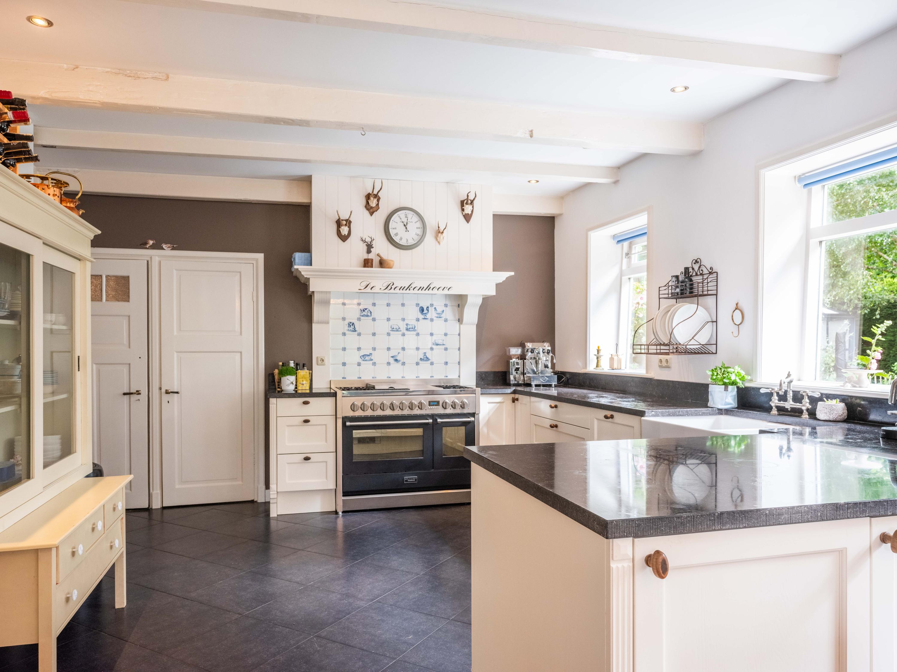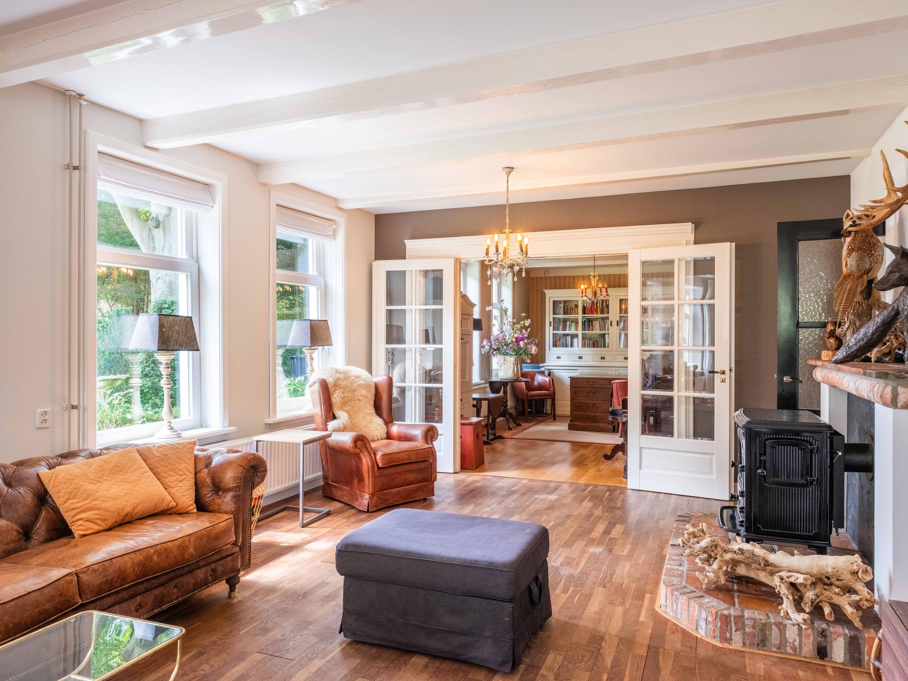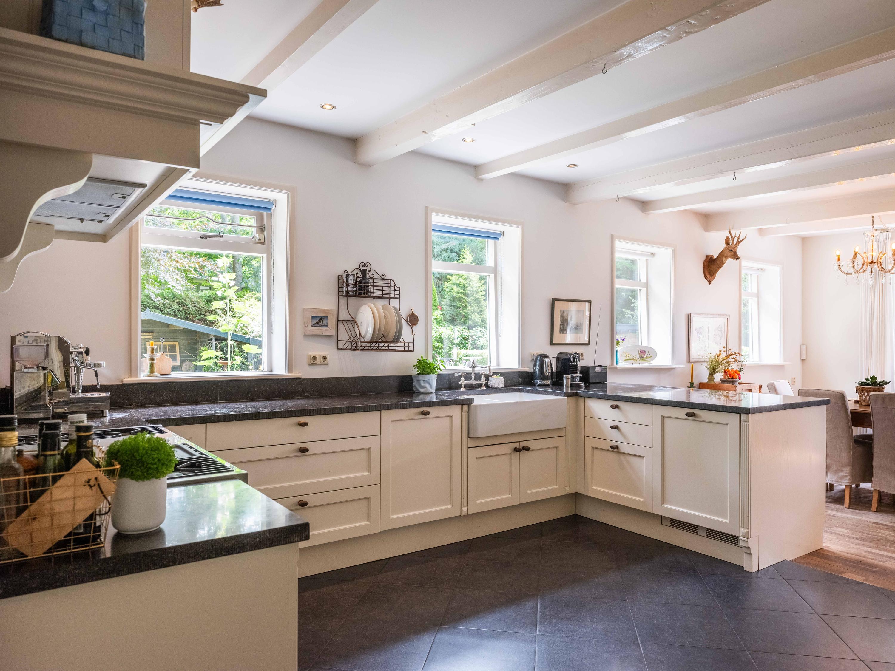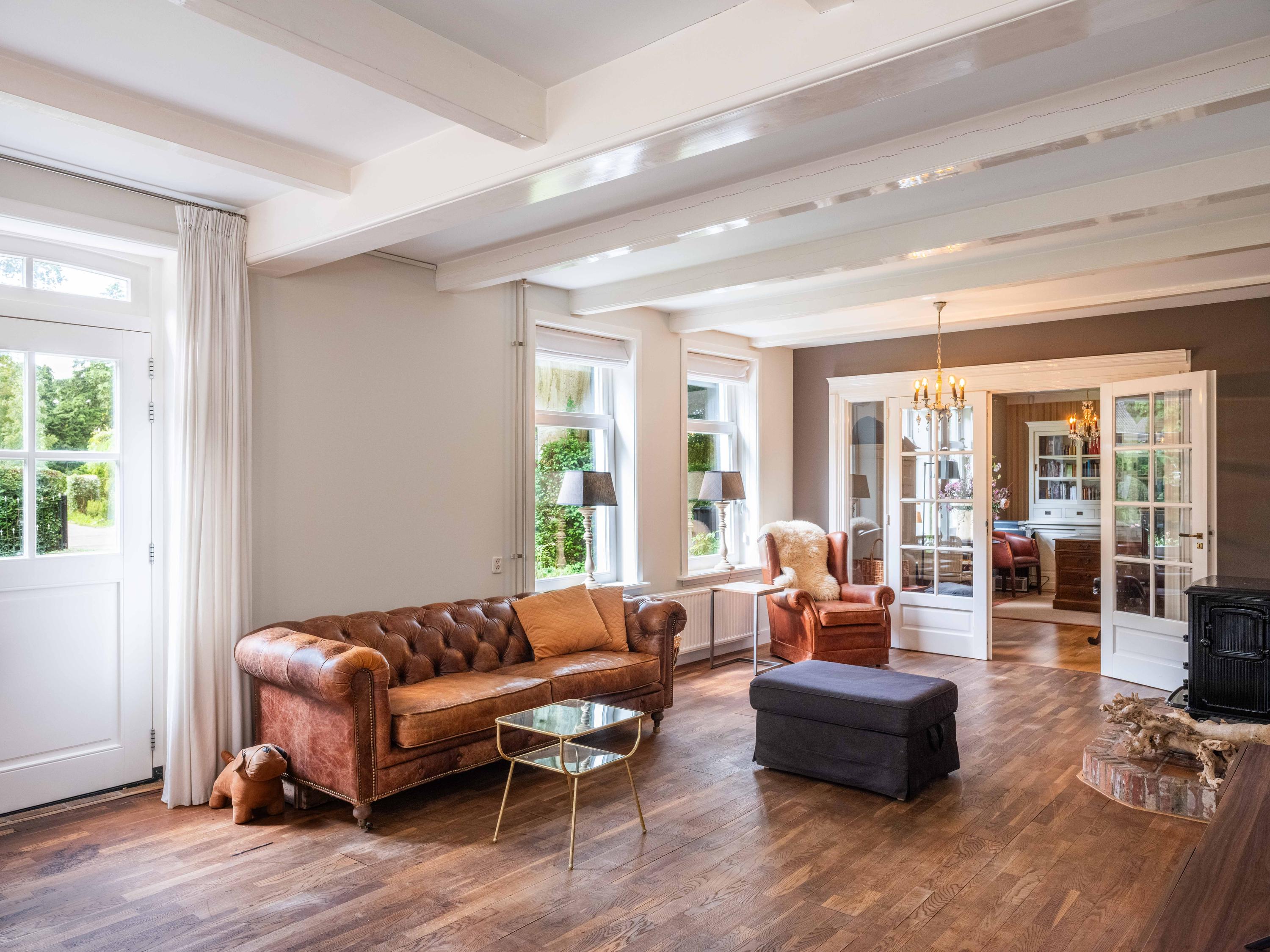The spacious living room of 18 meters long is sunny and light because of the many windows. En-suite doors divide the space into an office and living room. The living room has a cozy wood-burning stove and a door to the front terrace. The spacious country style open kitchen has a striking mantelpiece with large stove. Adjacent to the kitchen is a large laundry room as well as a separate linen room. There is also a pantry with full-length built-in cupboards and a kitchenette with a door that leads to a second terrace and garden adjacent to the house.