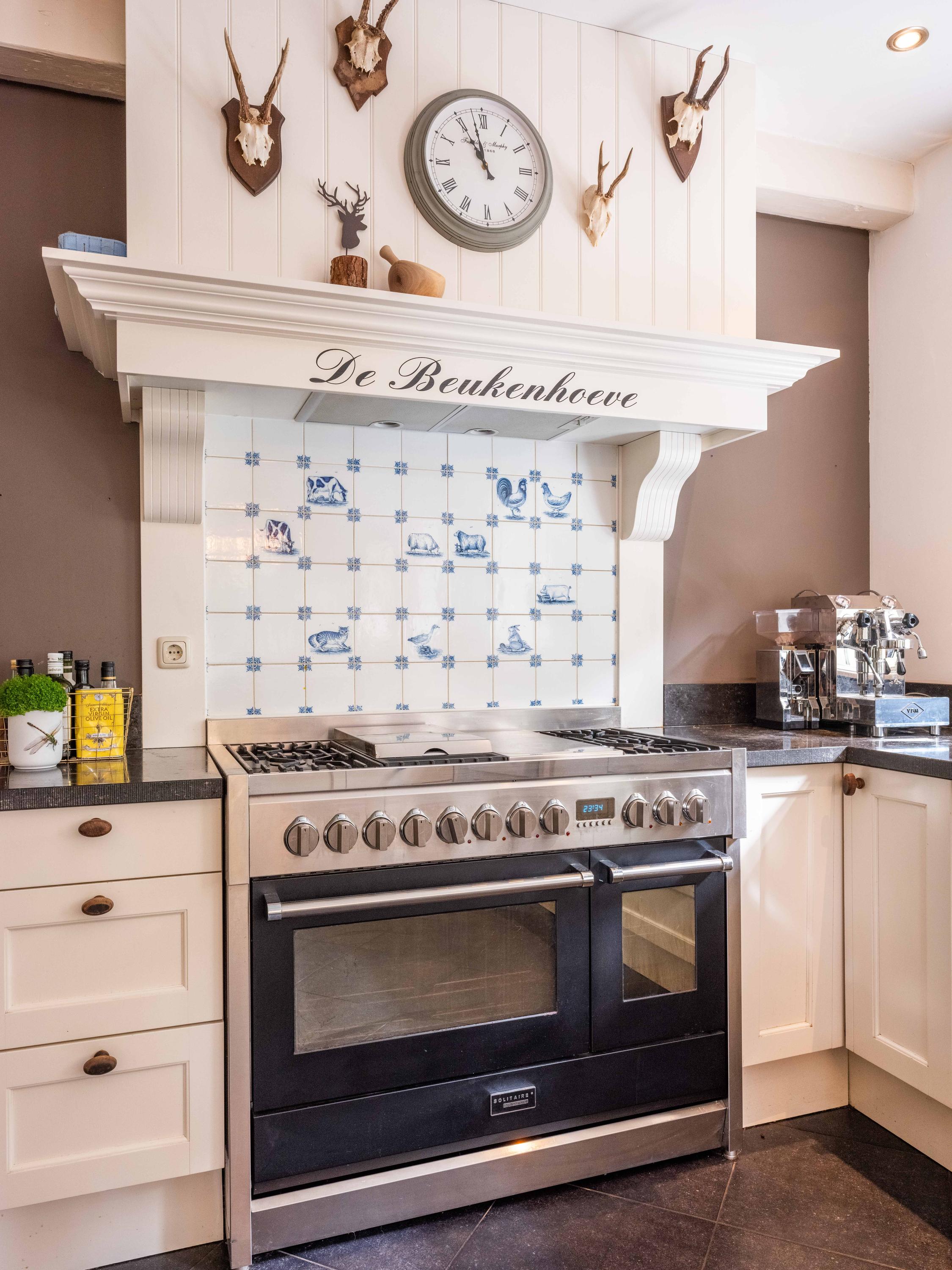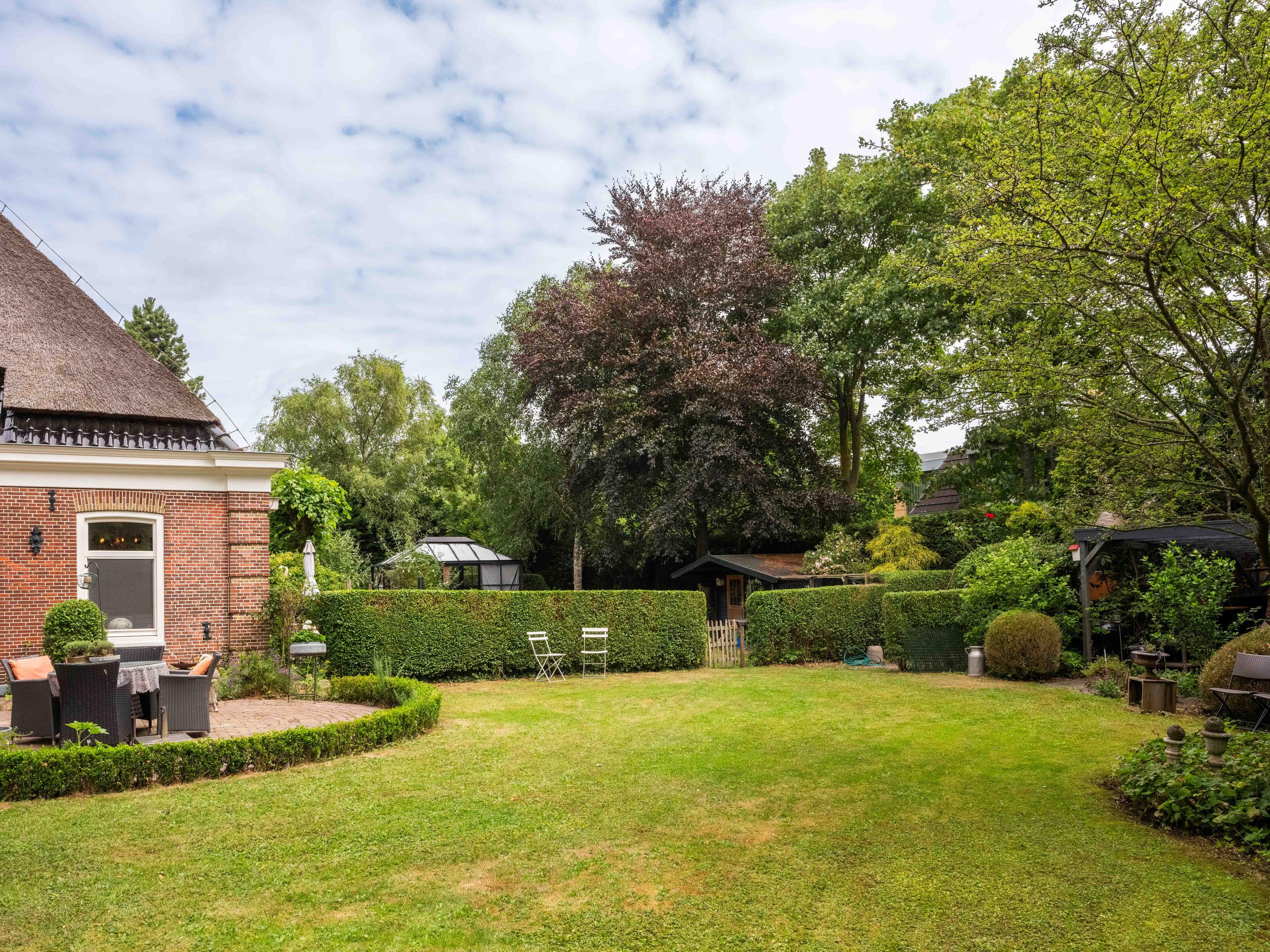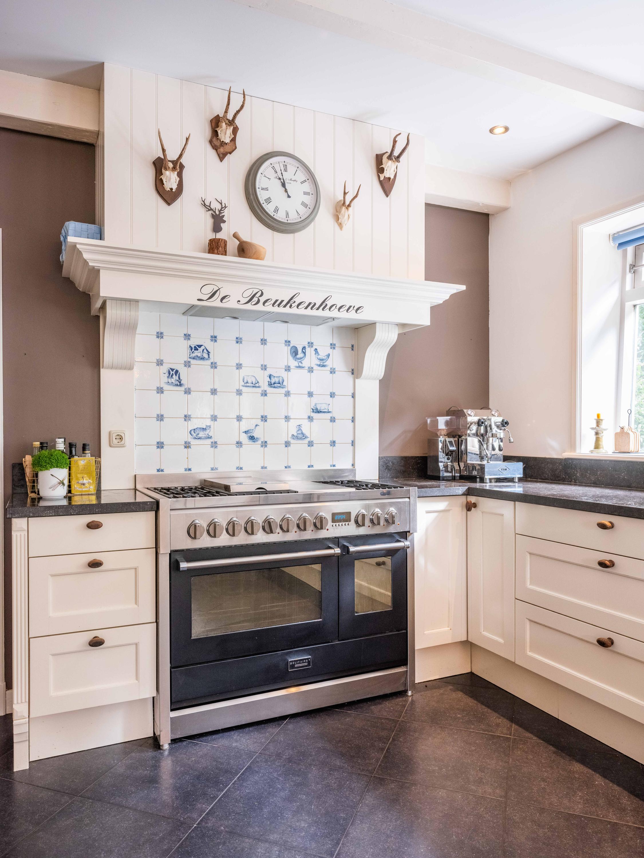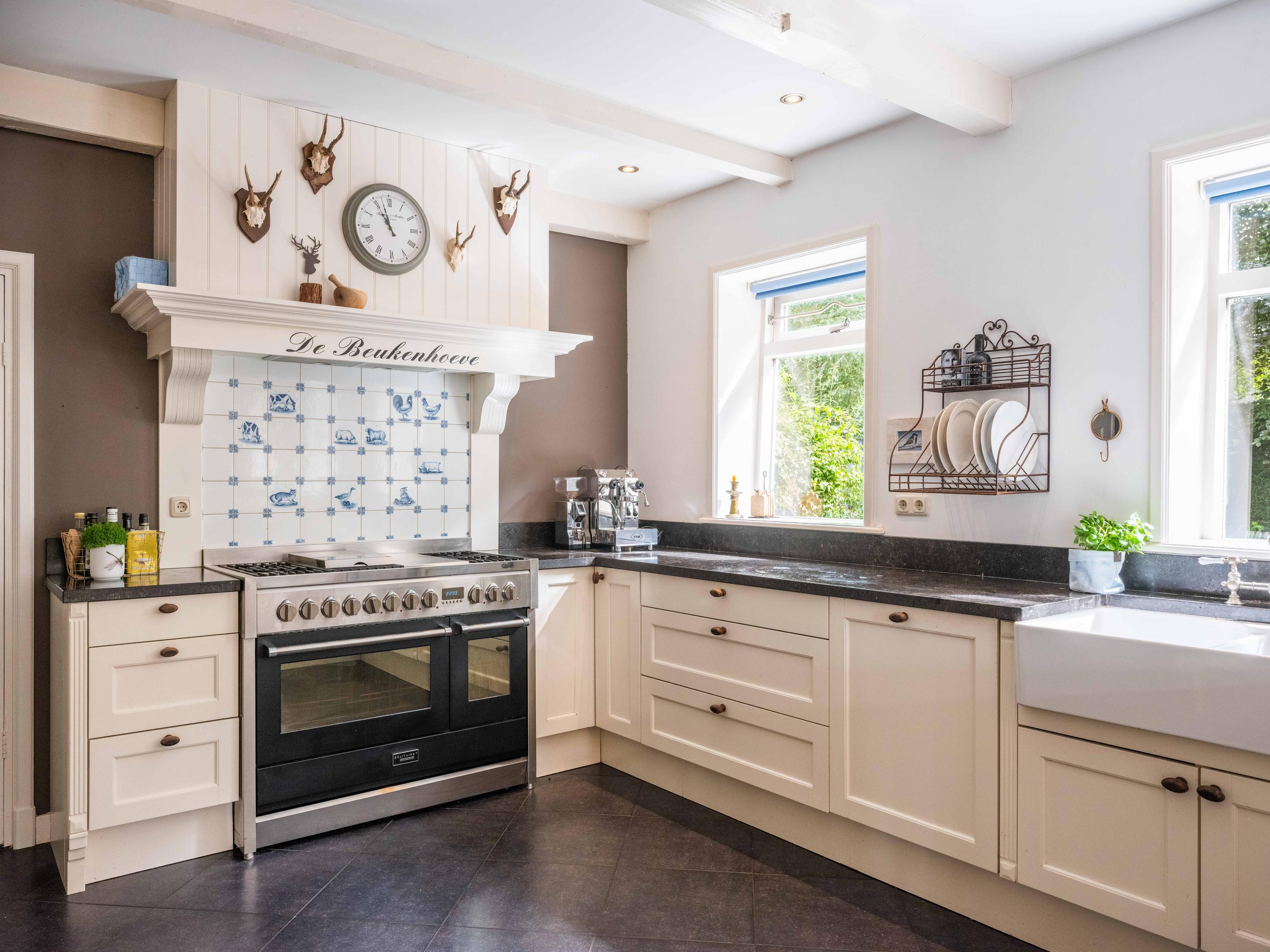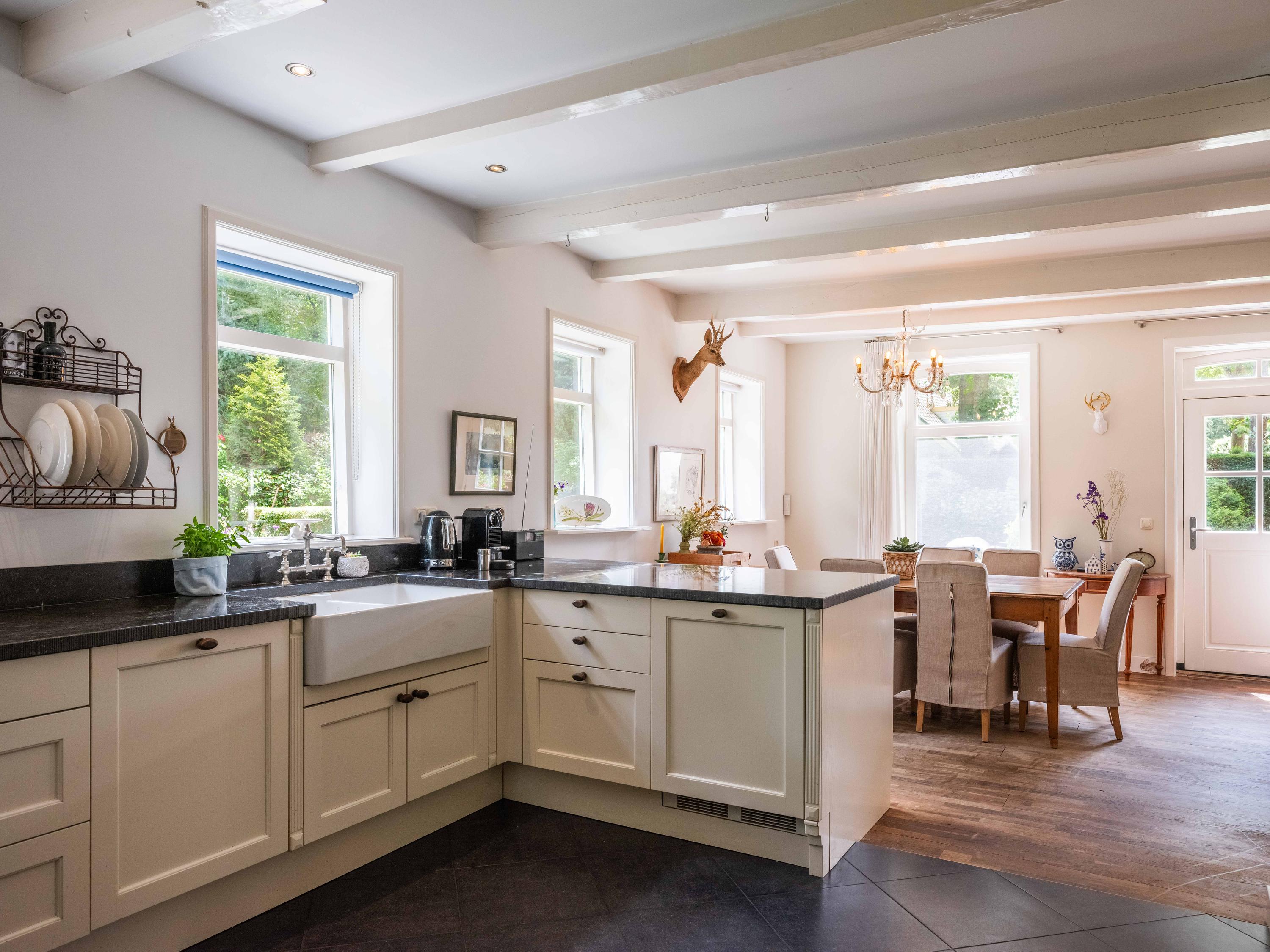 The spacious living room of 18 meters long is sunny and light because of the many windows. En-suite doors divide the space into an office and living room. The living room has a cozy wood-burning stove and a door to the front terrace. The spacious country style open kitchen has a striking mantelpiece with large stove. Adjacent to the kitchen is a large laundry room as well as a separate linen room. There is also a pantry with full-length built-in cupboards and a kitchenette with a door that leads to a second terrace and garden adjacent to the house.