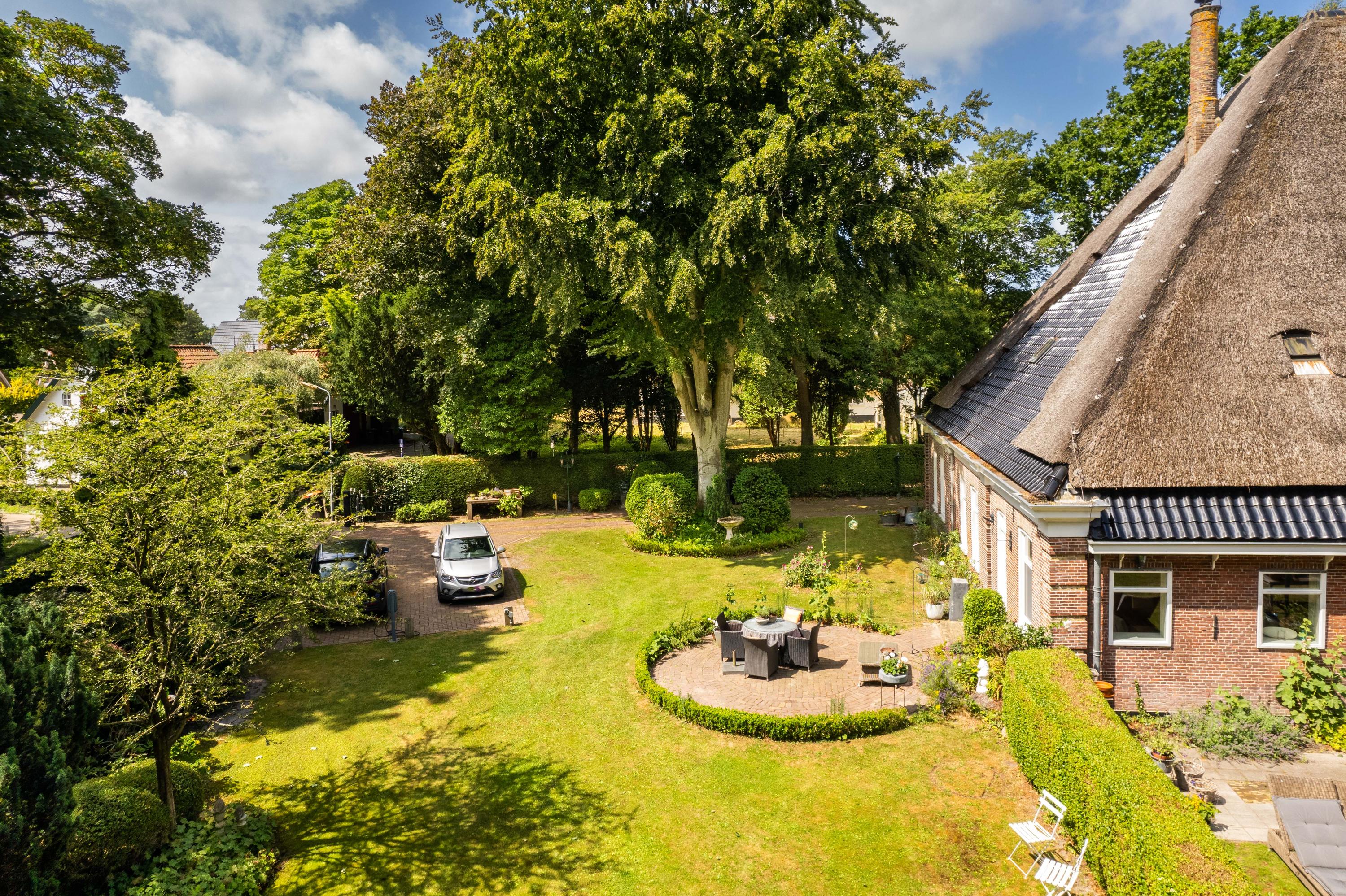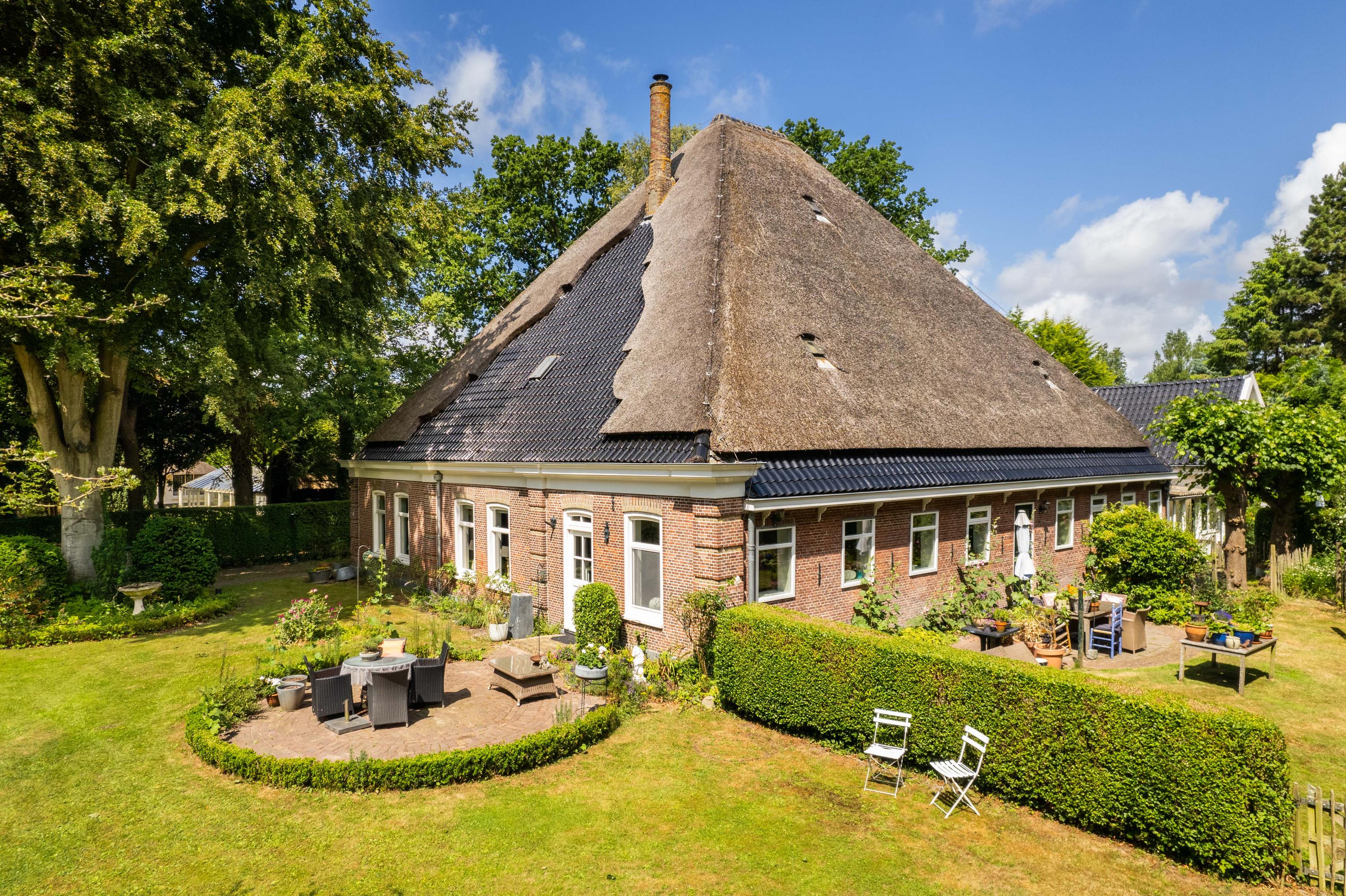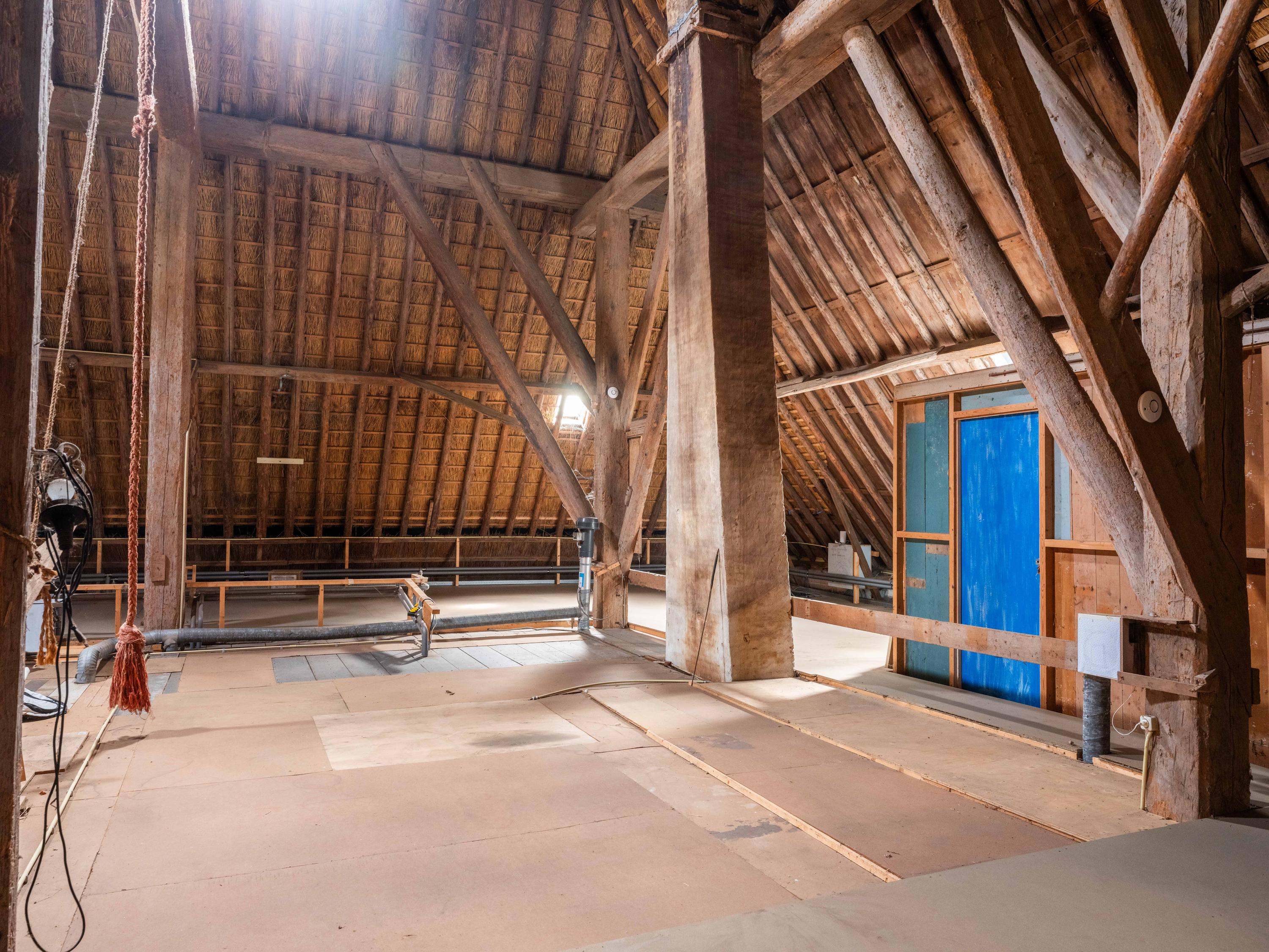 The first floor of the farmhouse, now an indoor storage space, can still be completely styled as you see fit. It is a huge space with a striking view of the wooden beams and thatched roof. The old farmhand's room now serves as a heated storage space.