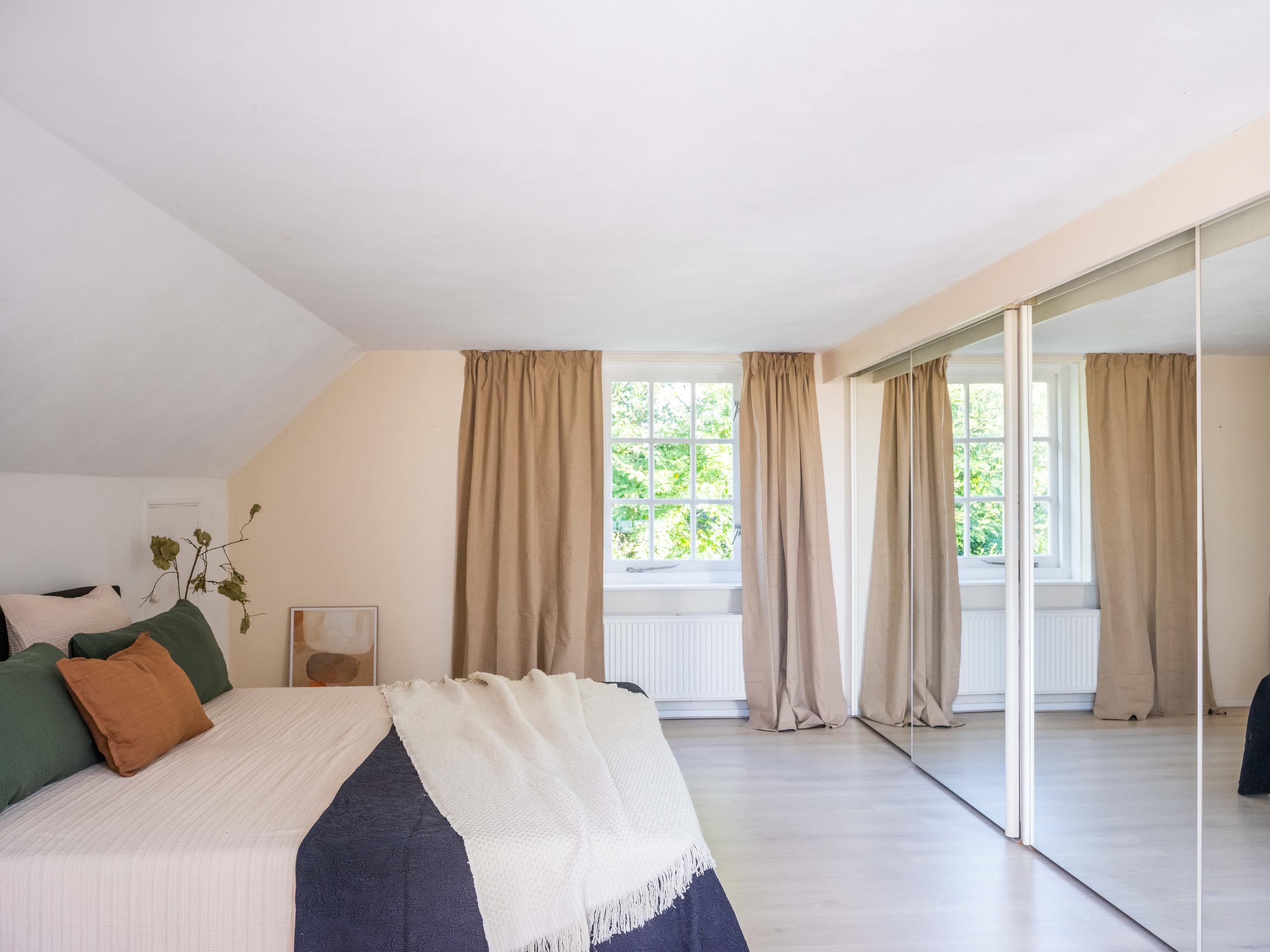 A south-west facing terrace extends the living space outdoors, ideal for summer evenings. Parking for several cars lies within the secure boundary. With direct access to the woods and proximity to Bergen’s village life and the beach, this villa offers a harmonious balance of privacy, landscape, and access to local amenities. The property with 635 m² of grounds, two bedrooms, and two bathrooms, invites you to shape its future with understated elegance.