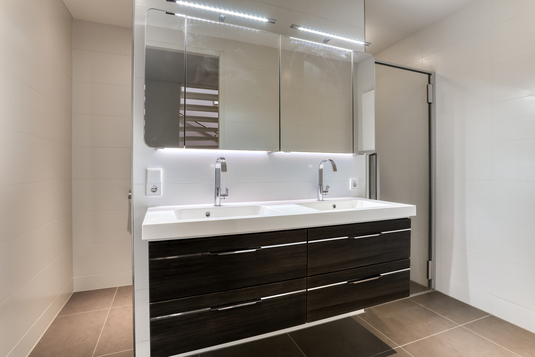 The modern bathroom is stylishly designed and includes a large walk-in shower, double sink, and a second toilet.