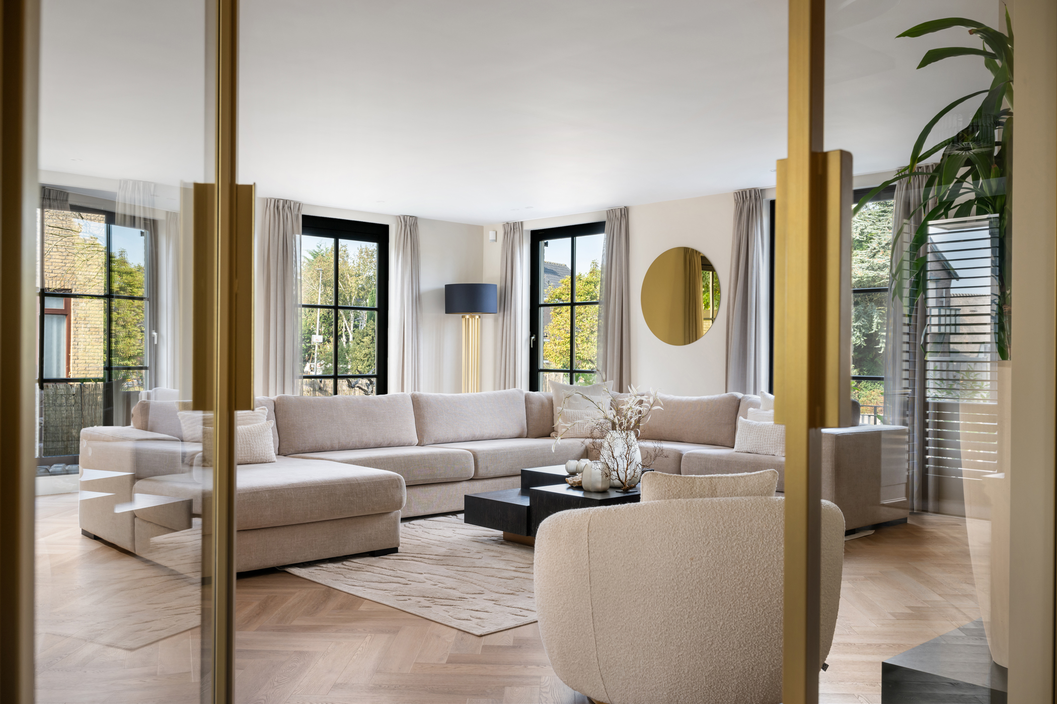 The generous living room features a modern electric fireplace, screens, roller shutters, and air conditioning, as well as a PVC herringbone floor with underfloor heating. Large windows ensure the space is filled with natural light and feels bright and airy.