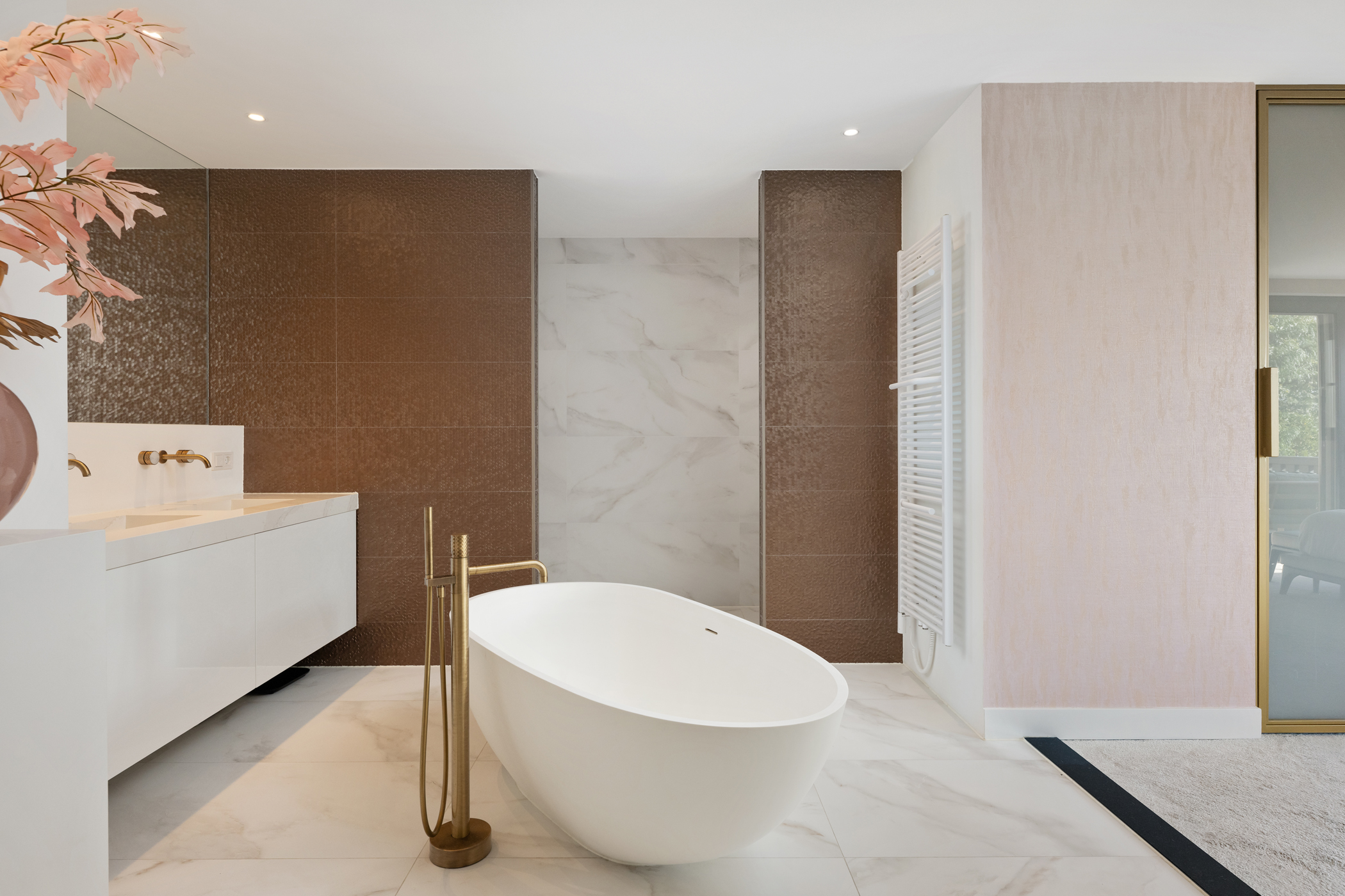 The master bedroom on the ground floor features a modern ensuite bathroom with bathtub, double washbasin, shower, and toilet. The bedroom is equipped with air conditioning, carpet flooring, and a walk-in closet, and also provides direct access to the terrace through sliding doors.