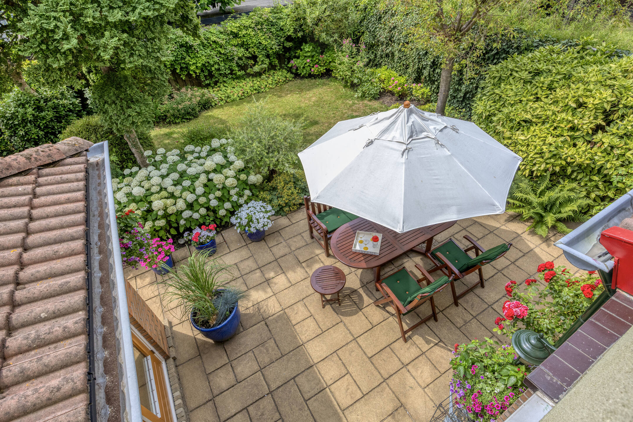The insulated garage is fitted with an overhead door and can be used for multiple purposes. It is accessible both from the garden side and internally from the house.