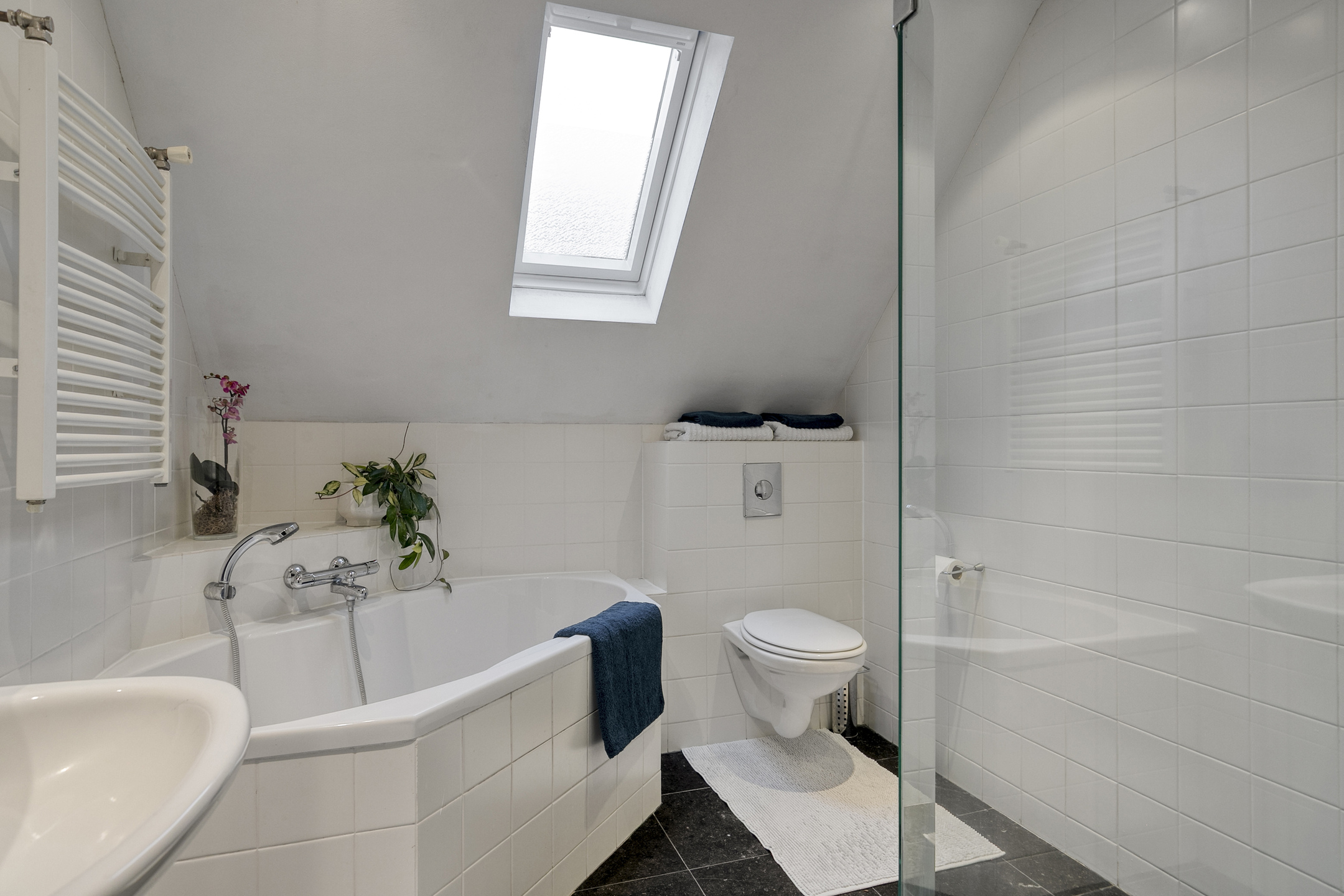 The bathroom is equipped with a bathtub, shower, toilet, and washbasin.