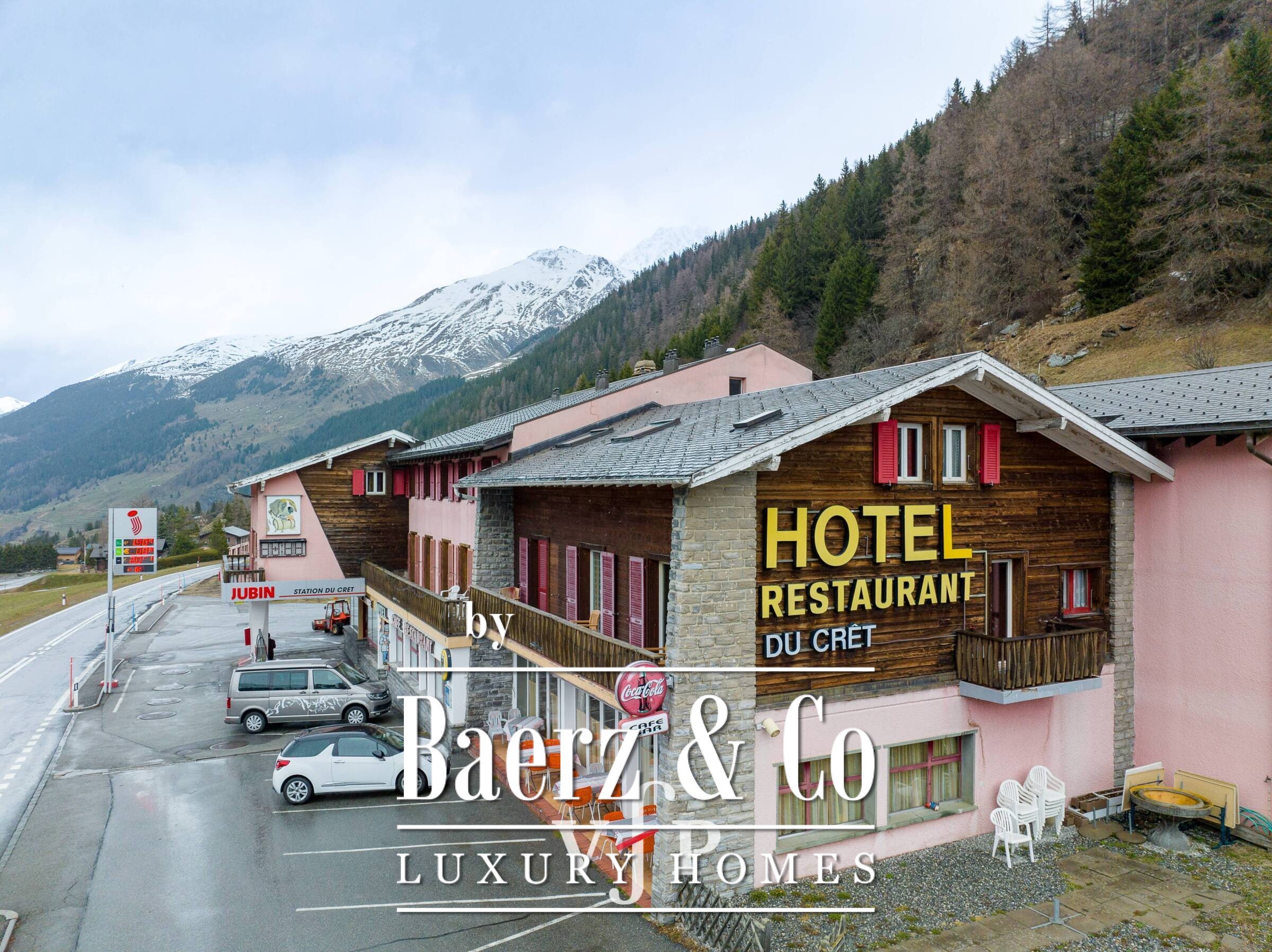 Hotel Bourg-St-Pierre Switzerland occupies a strategic position along the Grand-St-Bernard road, just minutes from the border, offering a rare blend of access and privacy. Comprising over 4000 m² of land, the property contains a hotel built in 1961 and renovated in 1992, presenting 36 fully equipped rooms and a total of 80 beds. The ensemble includes a café restaurant, a kiosk, and a gas station, with amenities that embrace both hospitality and essential services.