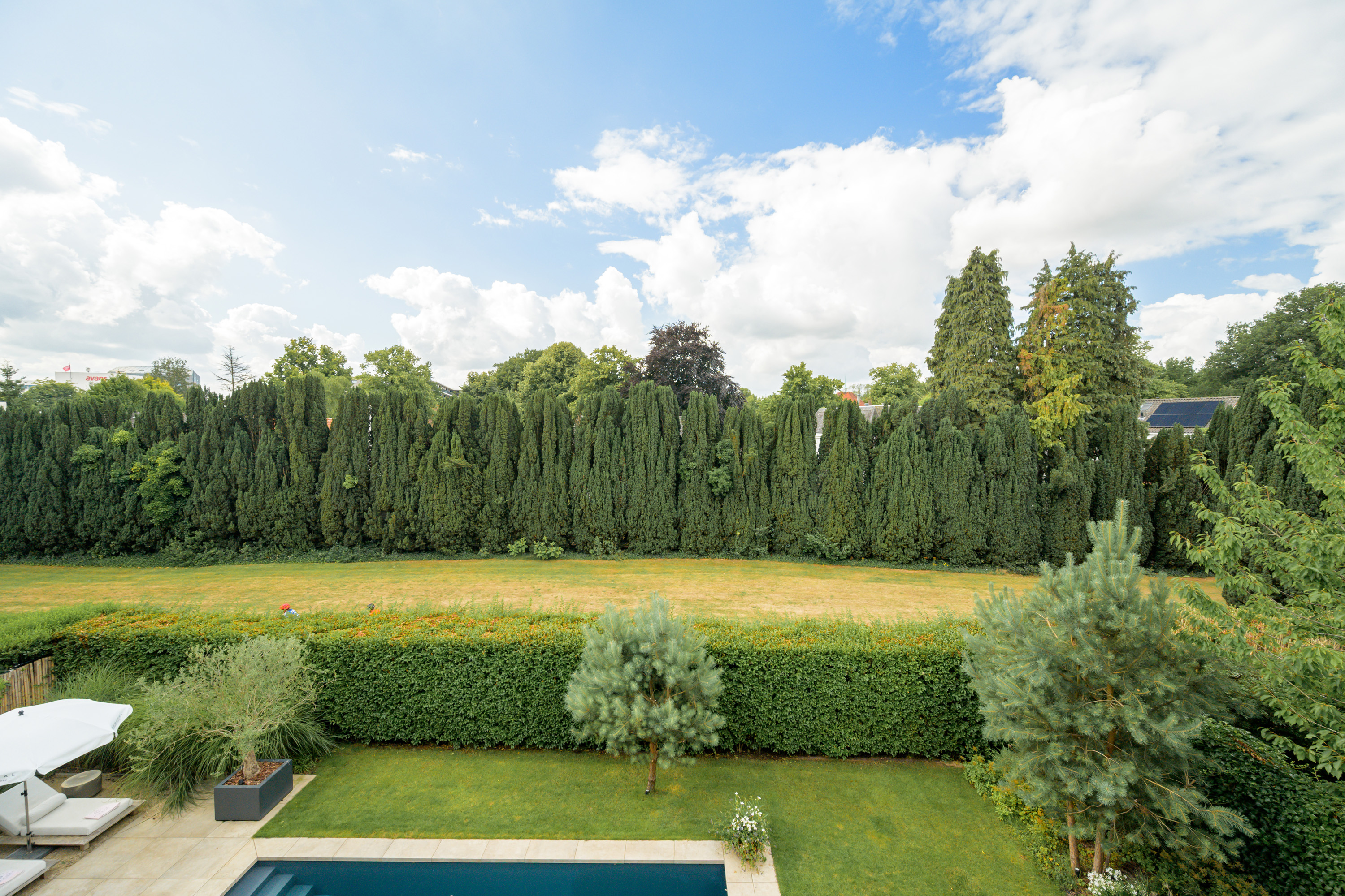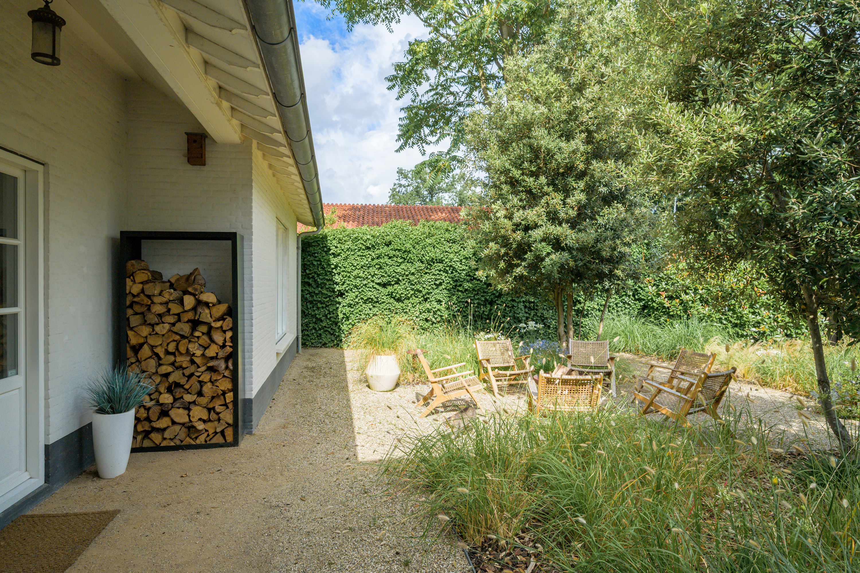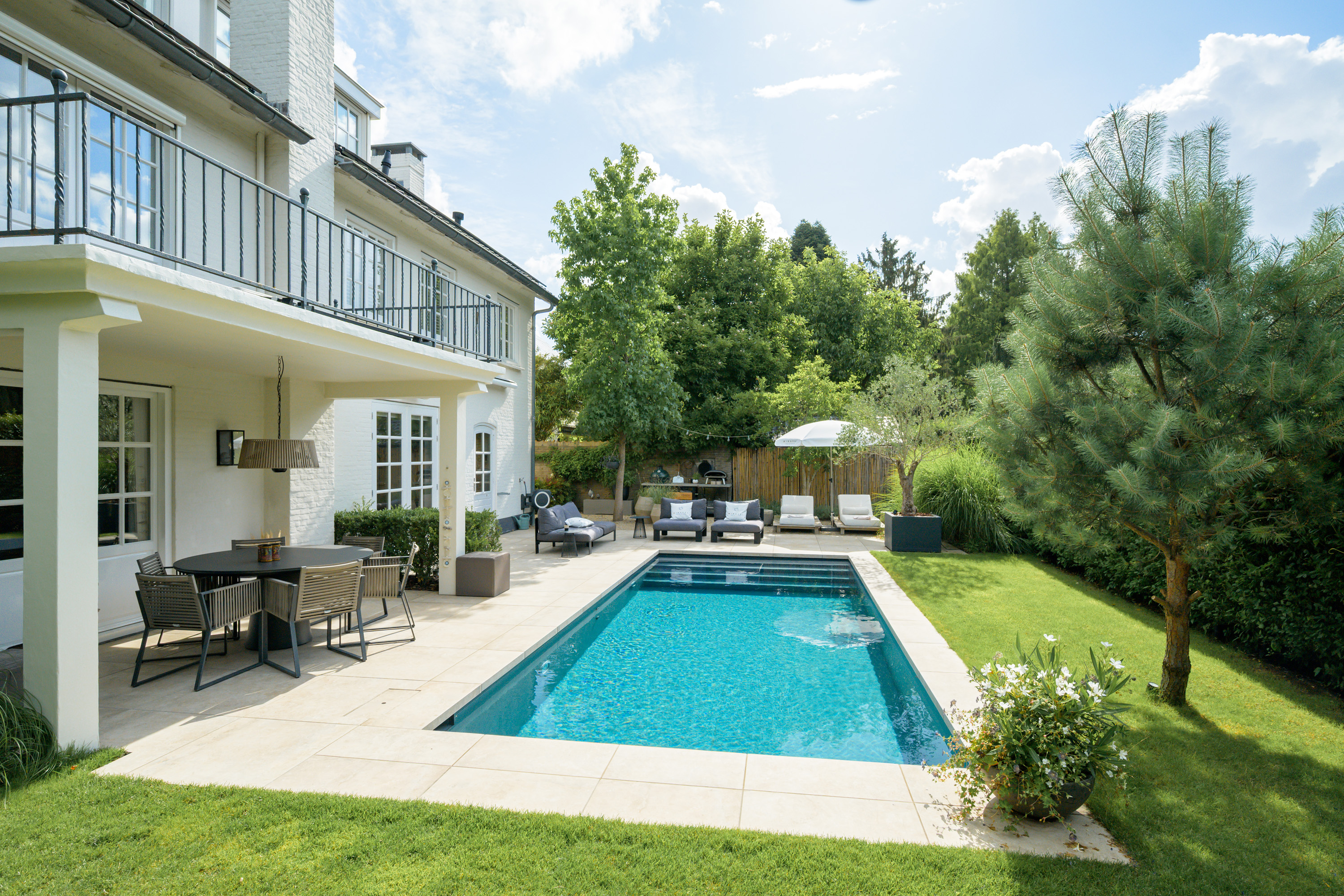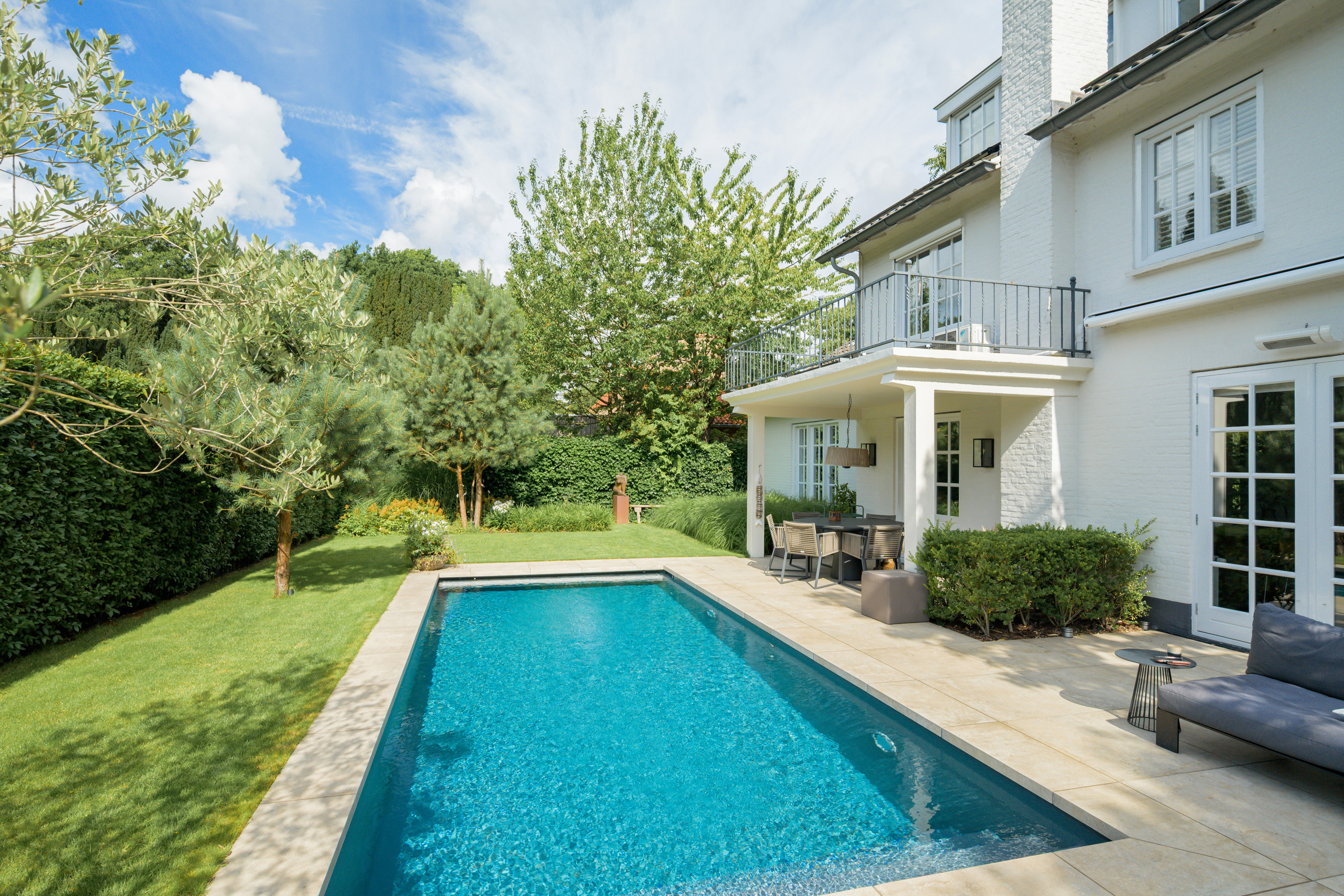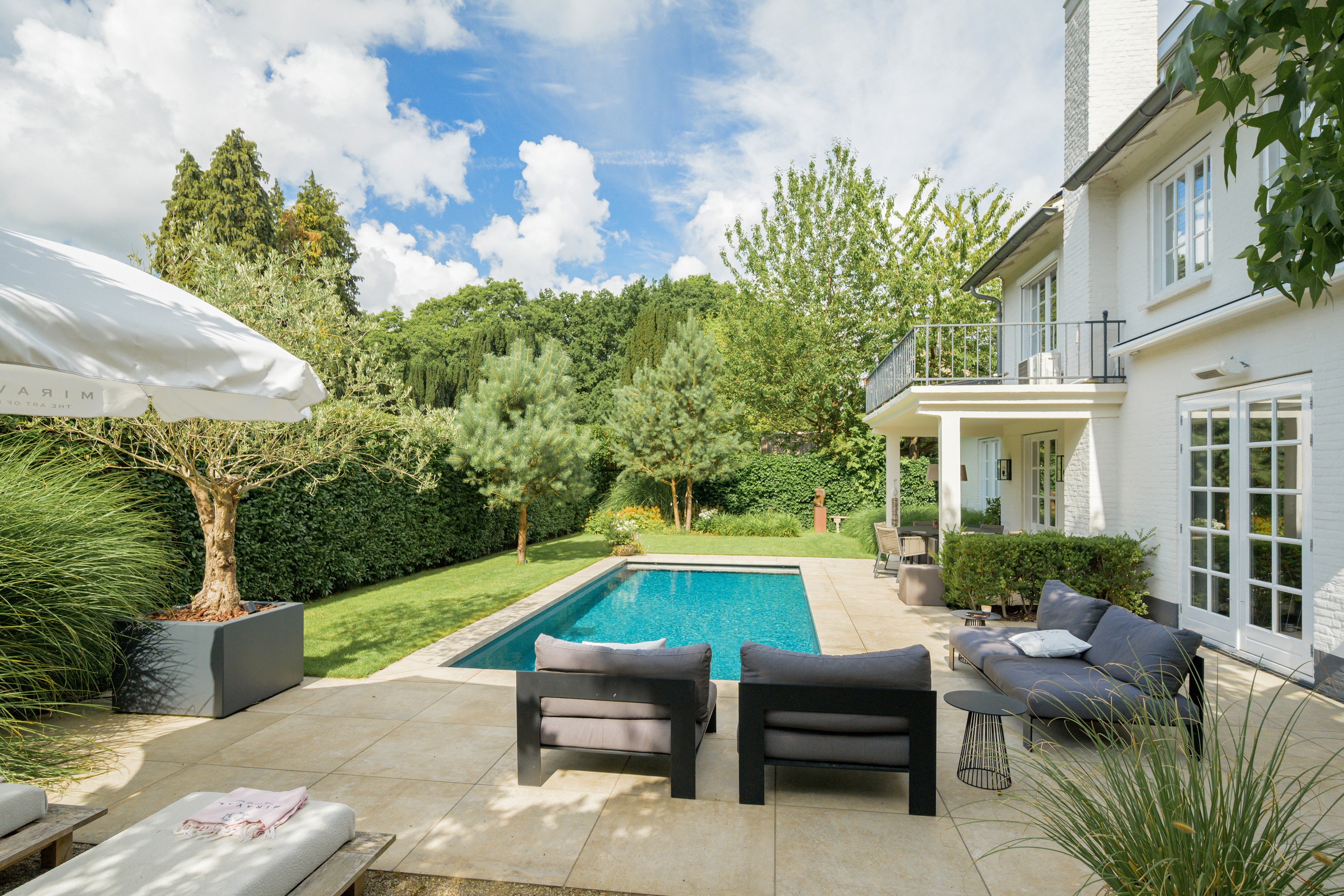 Set on a 660 m² plot, the garden was realized by Ronnie Renette, featuring a sleek heated pool, terraces framed by ornamental grasses, and mature trees for complete seclusion. The outbuilding offers secure storage, a fully automatic pool system, and garage access. An electrically operated gate secures multiple car parking, ensuring privacy and ease.