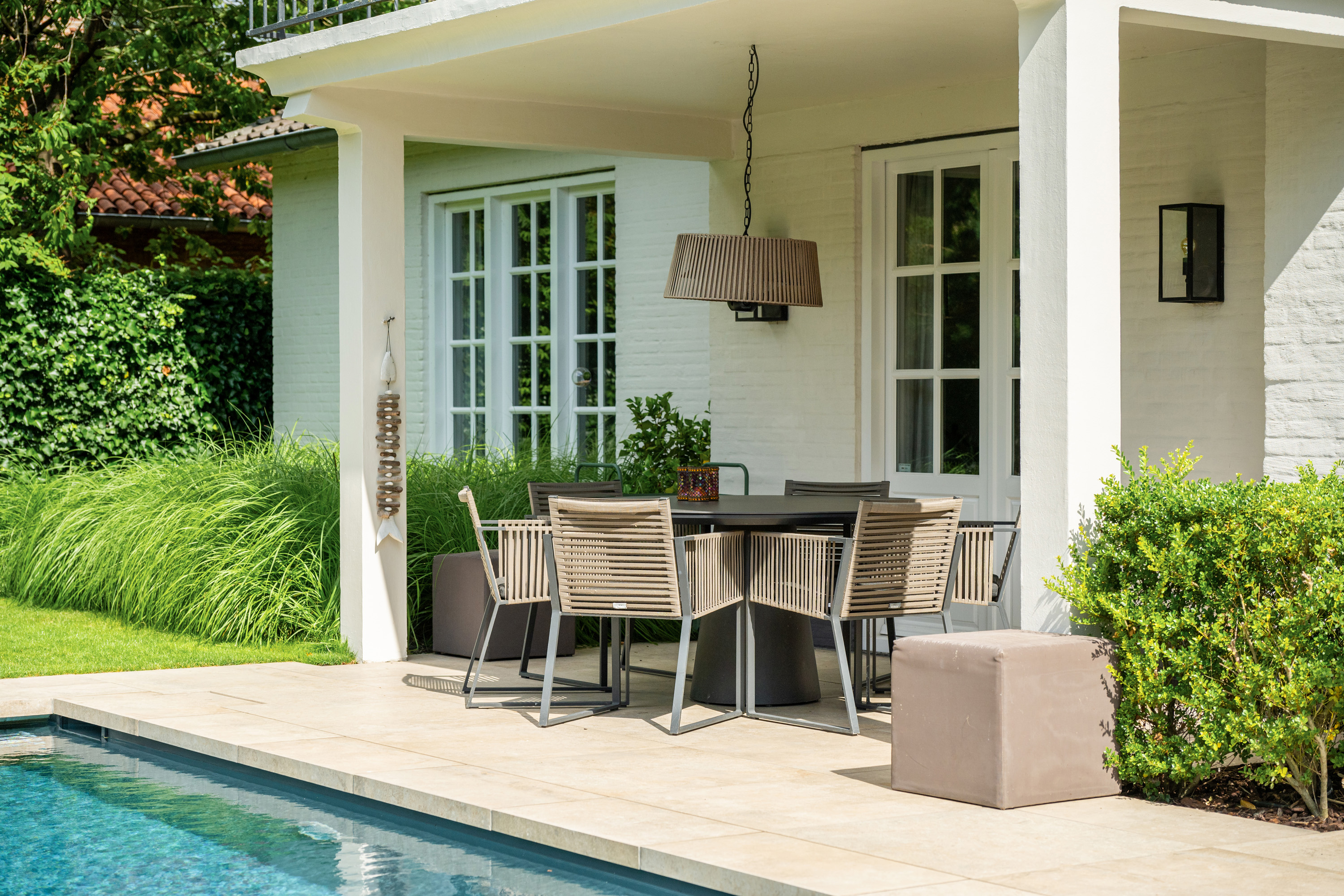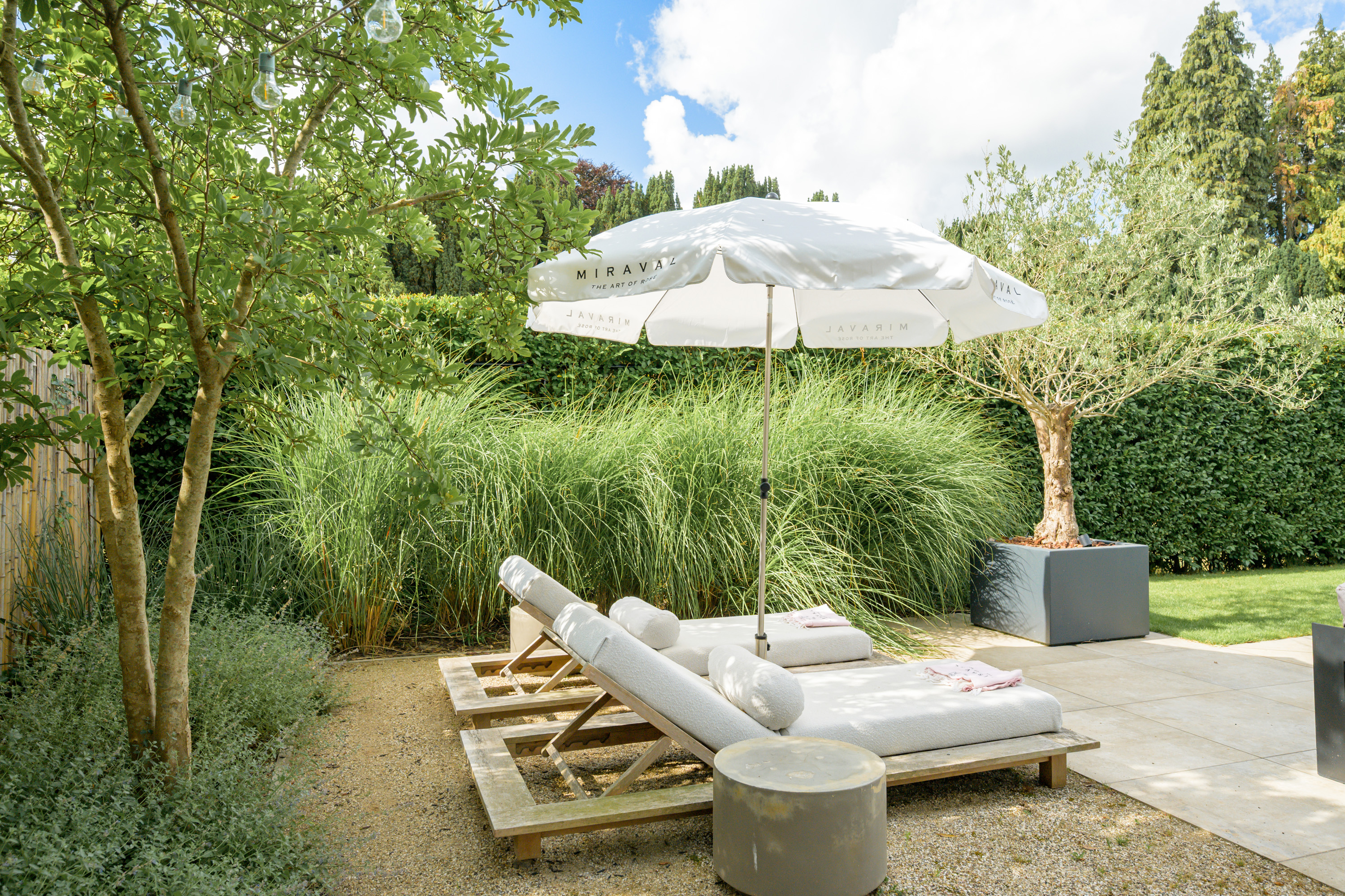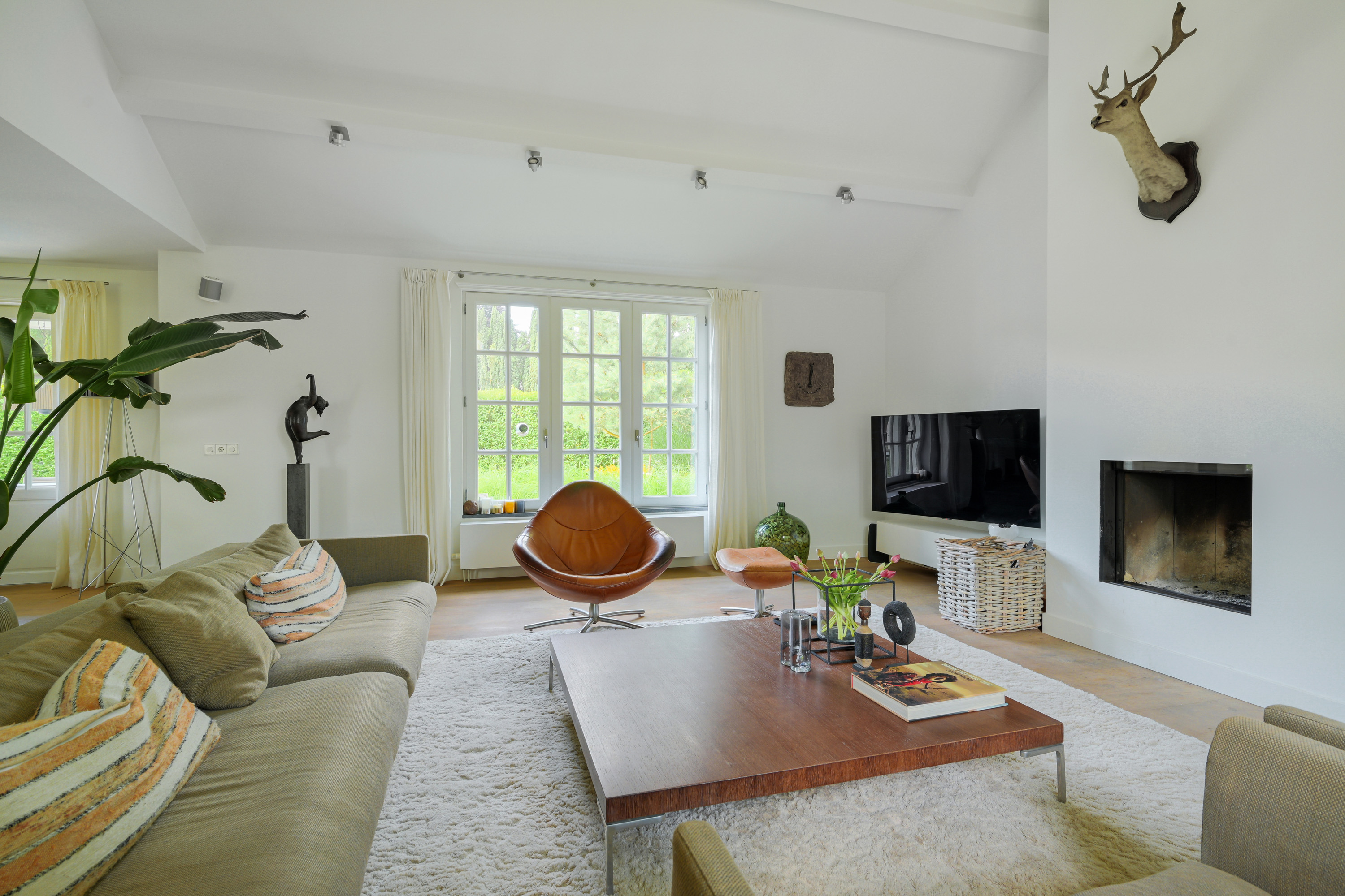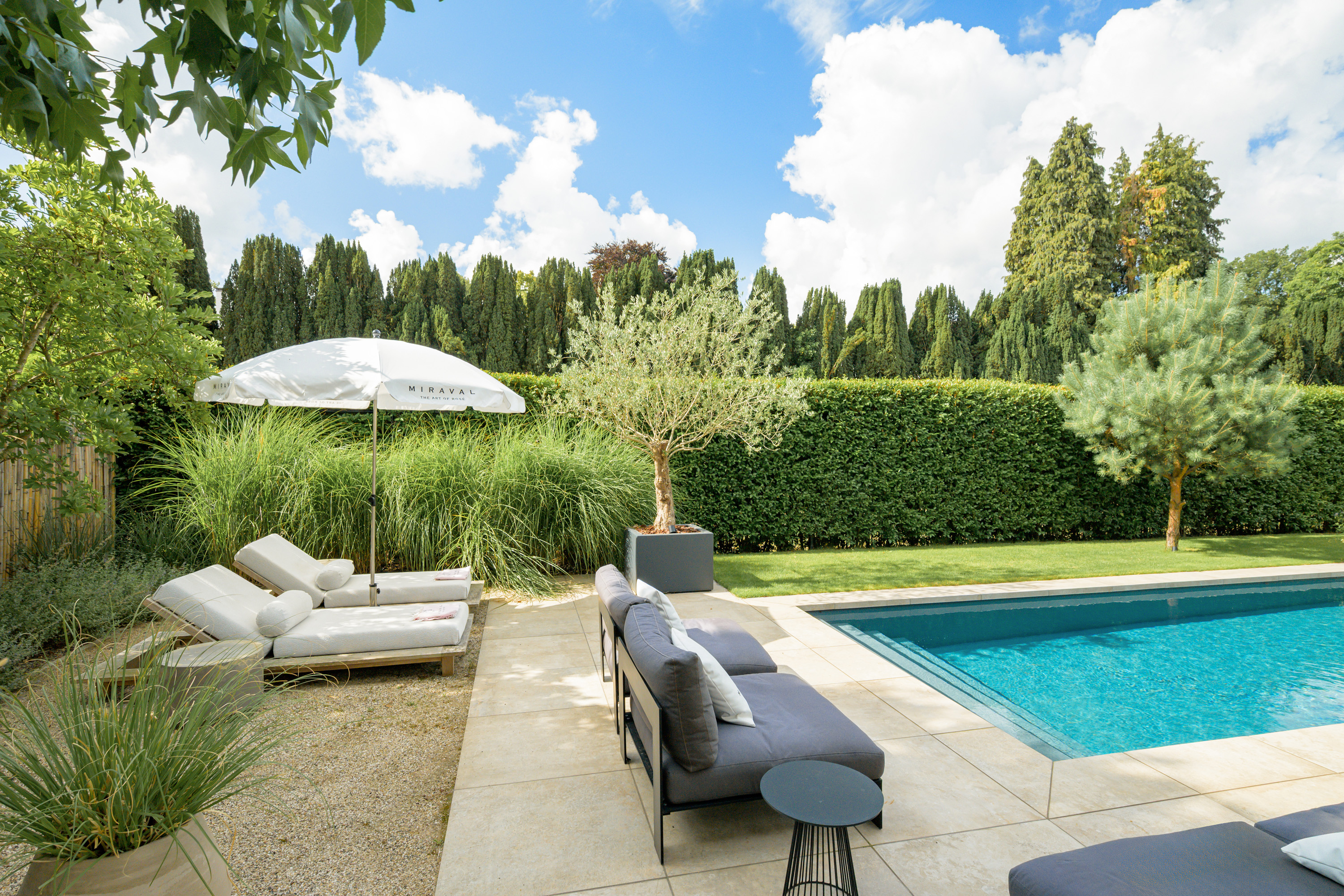 Set on a 660 m² plot, the garden was realized by Ronnie Renette, featuring a sleek heated pool, terraces framed by ornamental grasses, and mature trees for complete seclusion. The outbuilding offers secure storage, a fully automatic pool system, and garage access. An electrically operated gate secures multiple car parking, ensuring privacy and ease.
